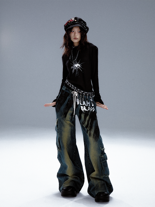 Washed Graffiti Wide-Leg Straight Dnim Jeans NA8151