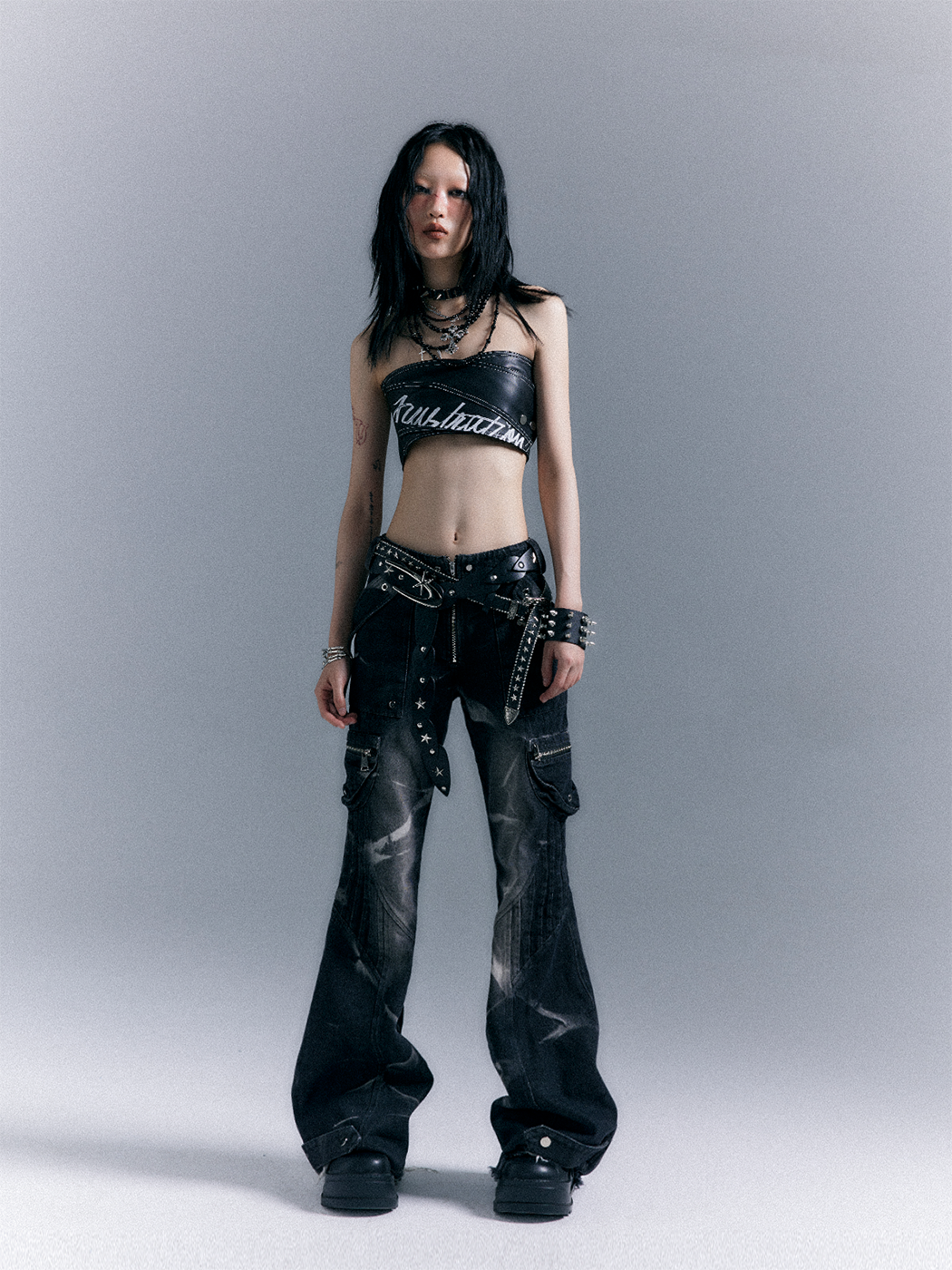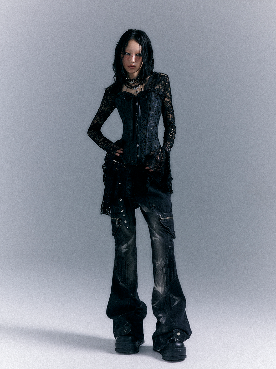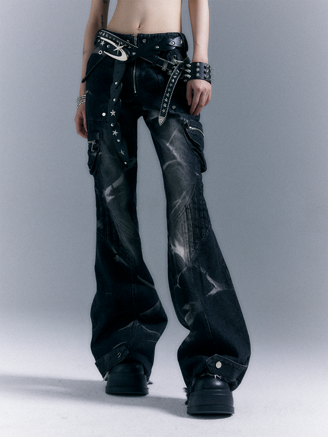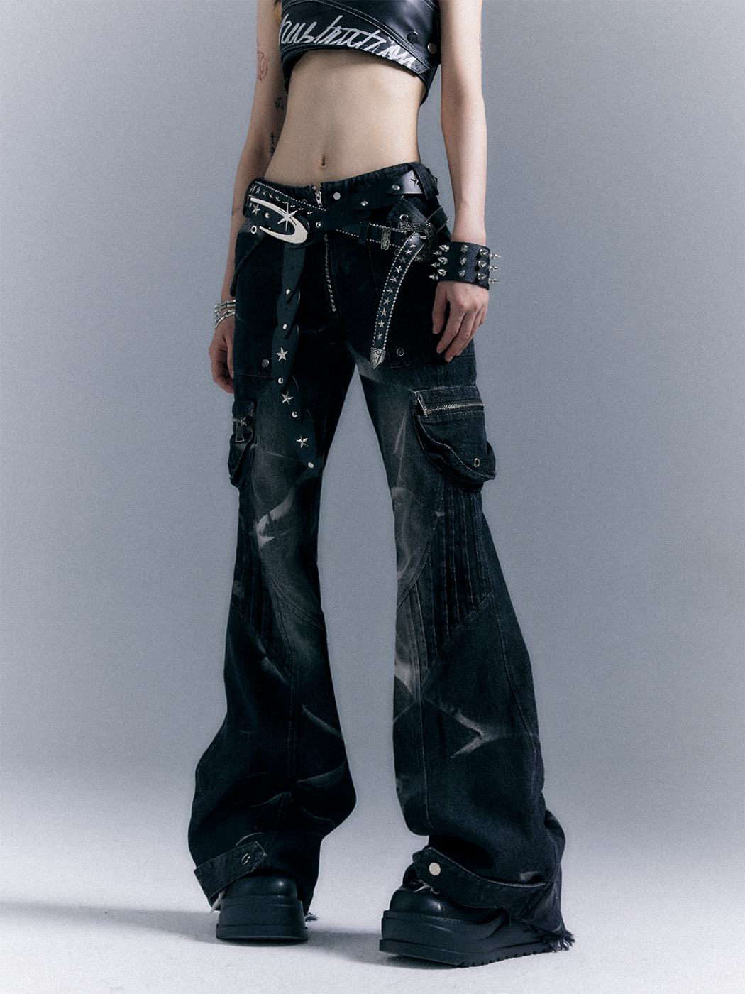 Low-Waist Studs Washed Flare Denim Jeans NA8167