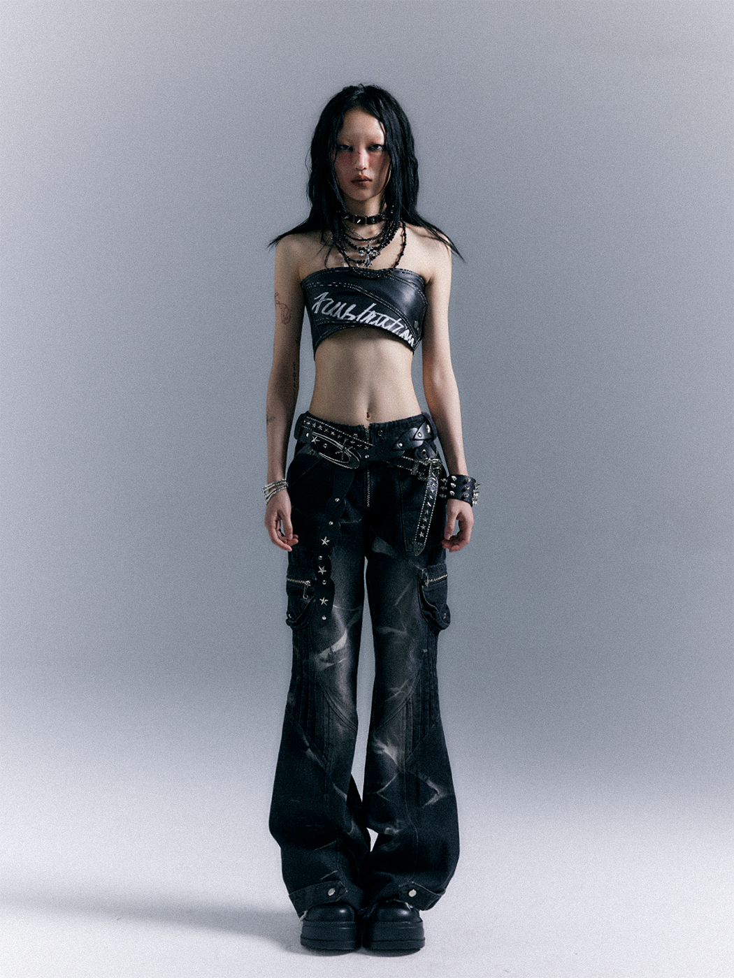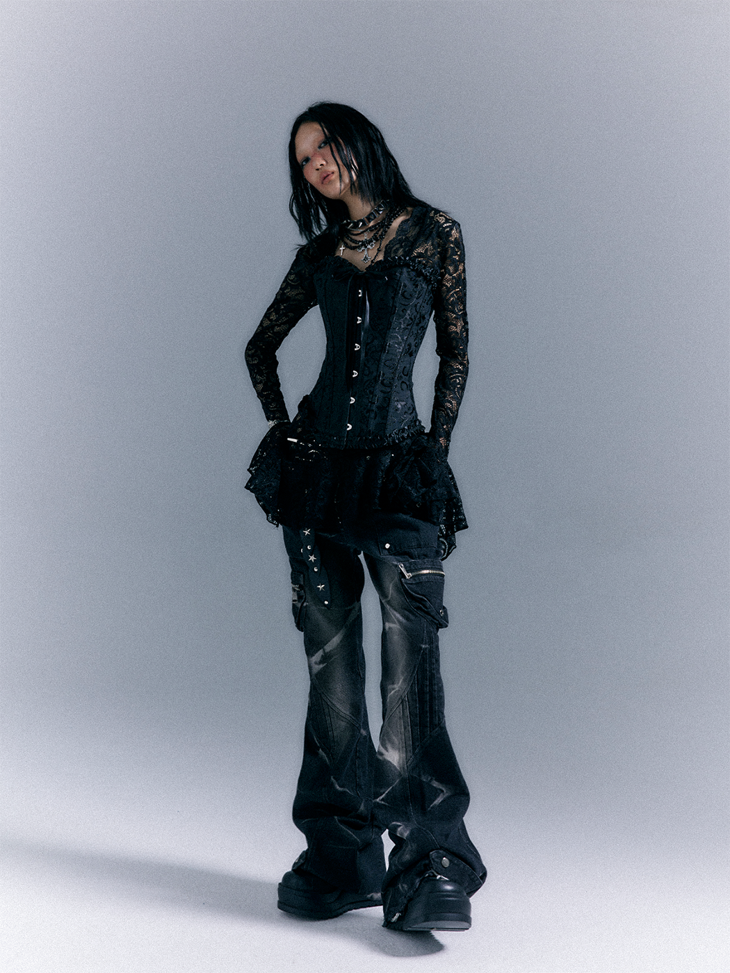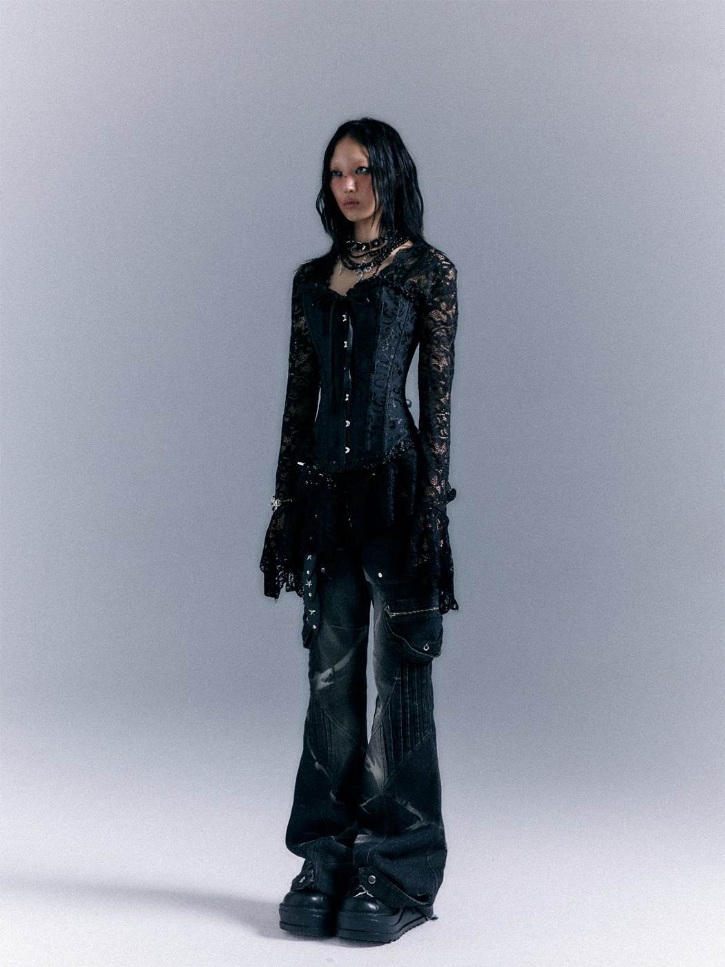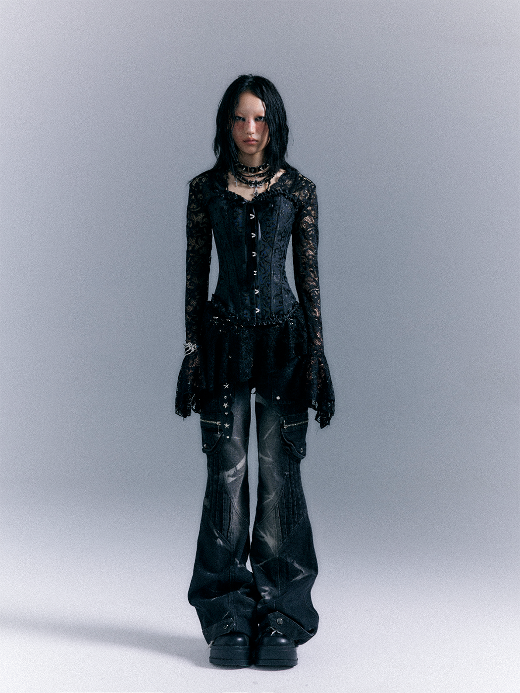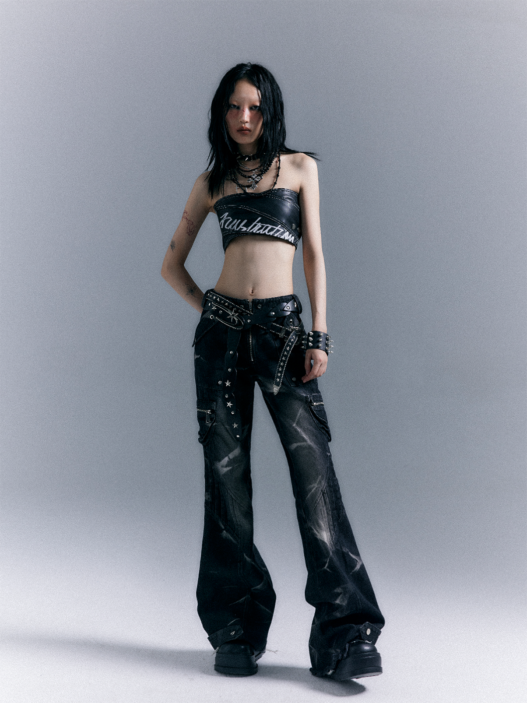 Low-Waist Studs Washed Flare Denim Jeans NA8167