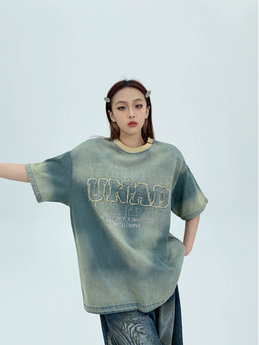 Patch Embroidery Oversized Denim Short Sleeve T-Shirt NA2869