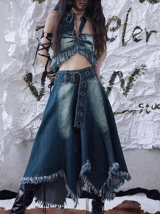 Fringe Raw Edge Heavy Denim Skirt NA7731