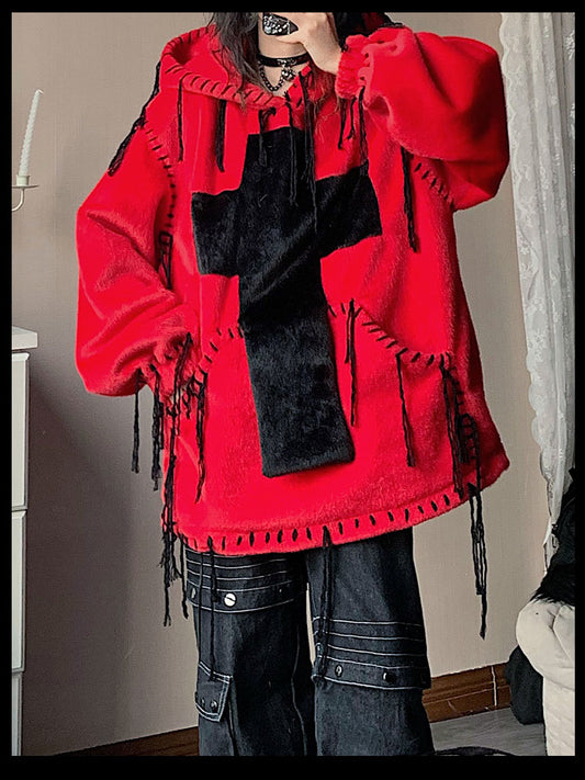 Fake Fur Hooded Cross Detail Hoodie NA7727