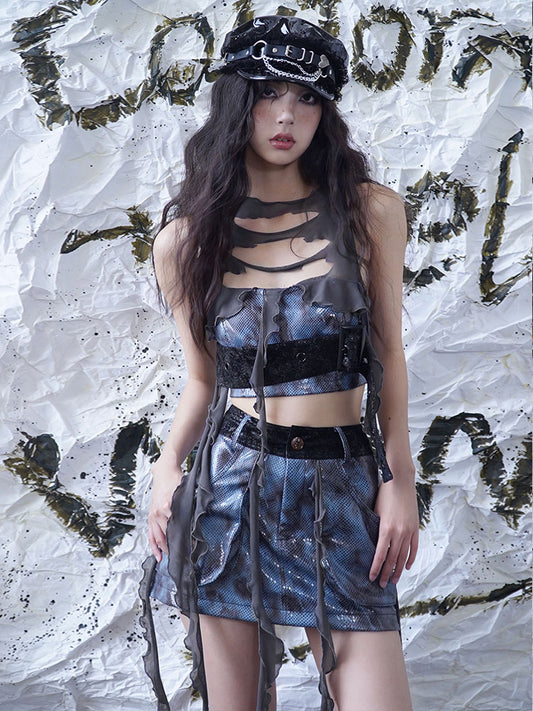 Denim Print Studs Strap Short Skirt NA7722