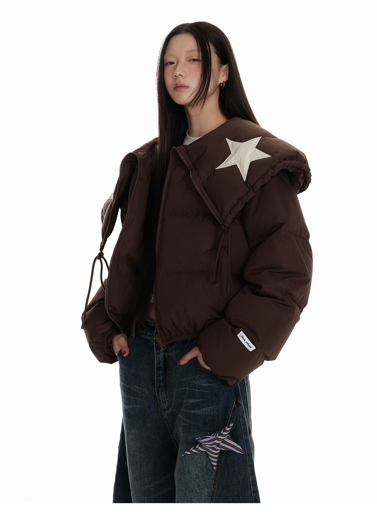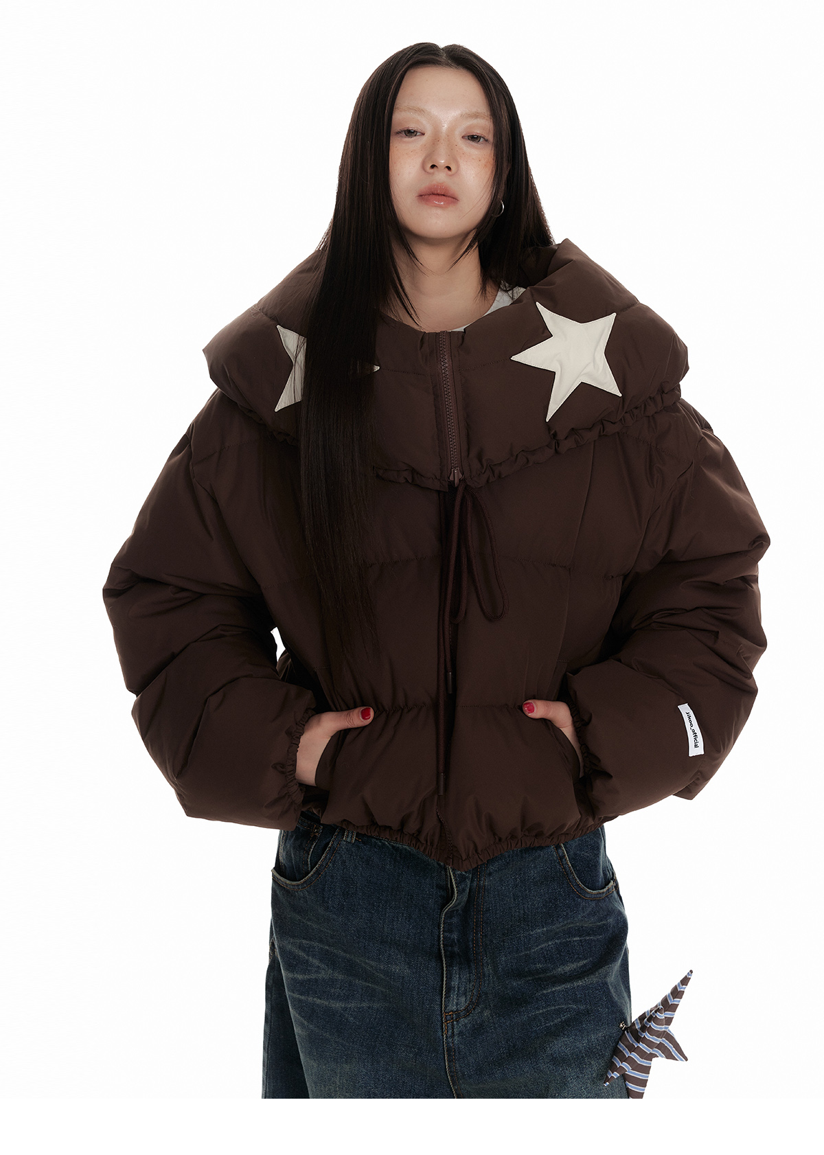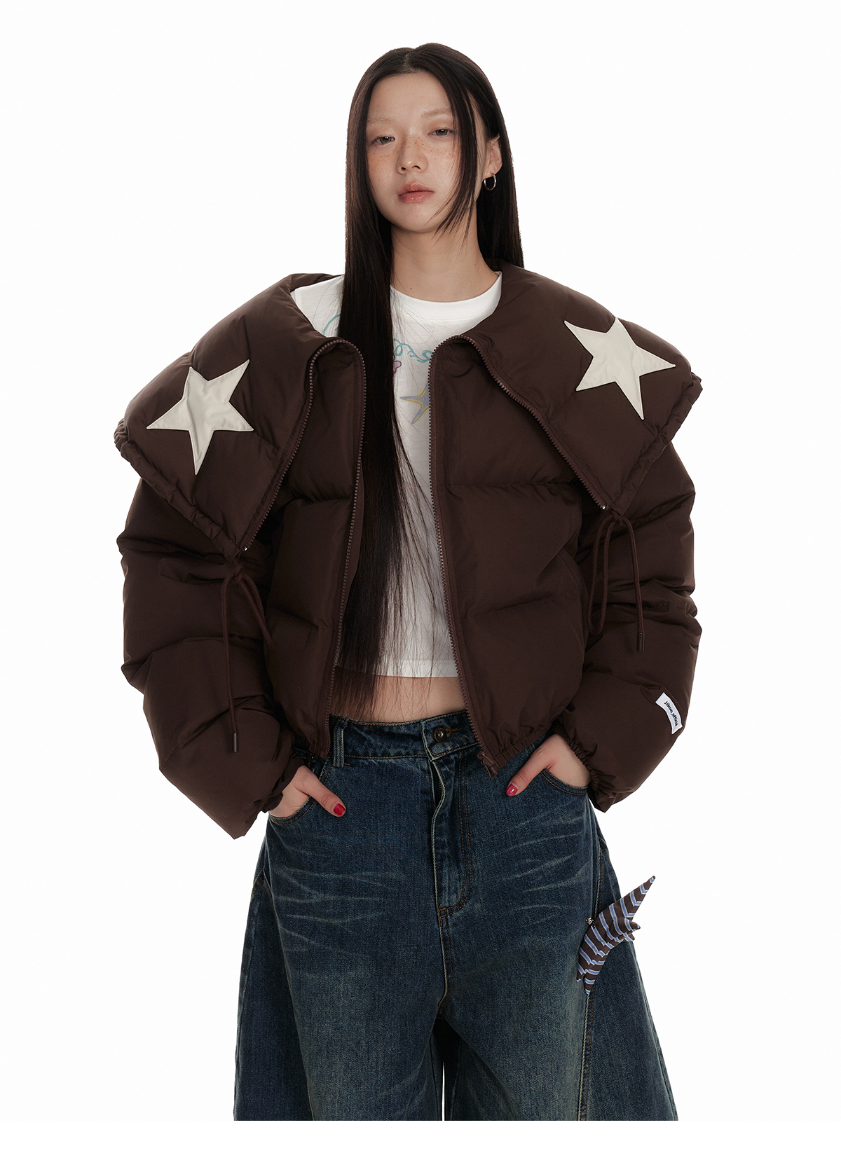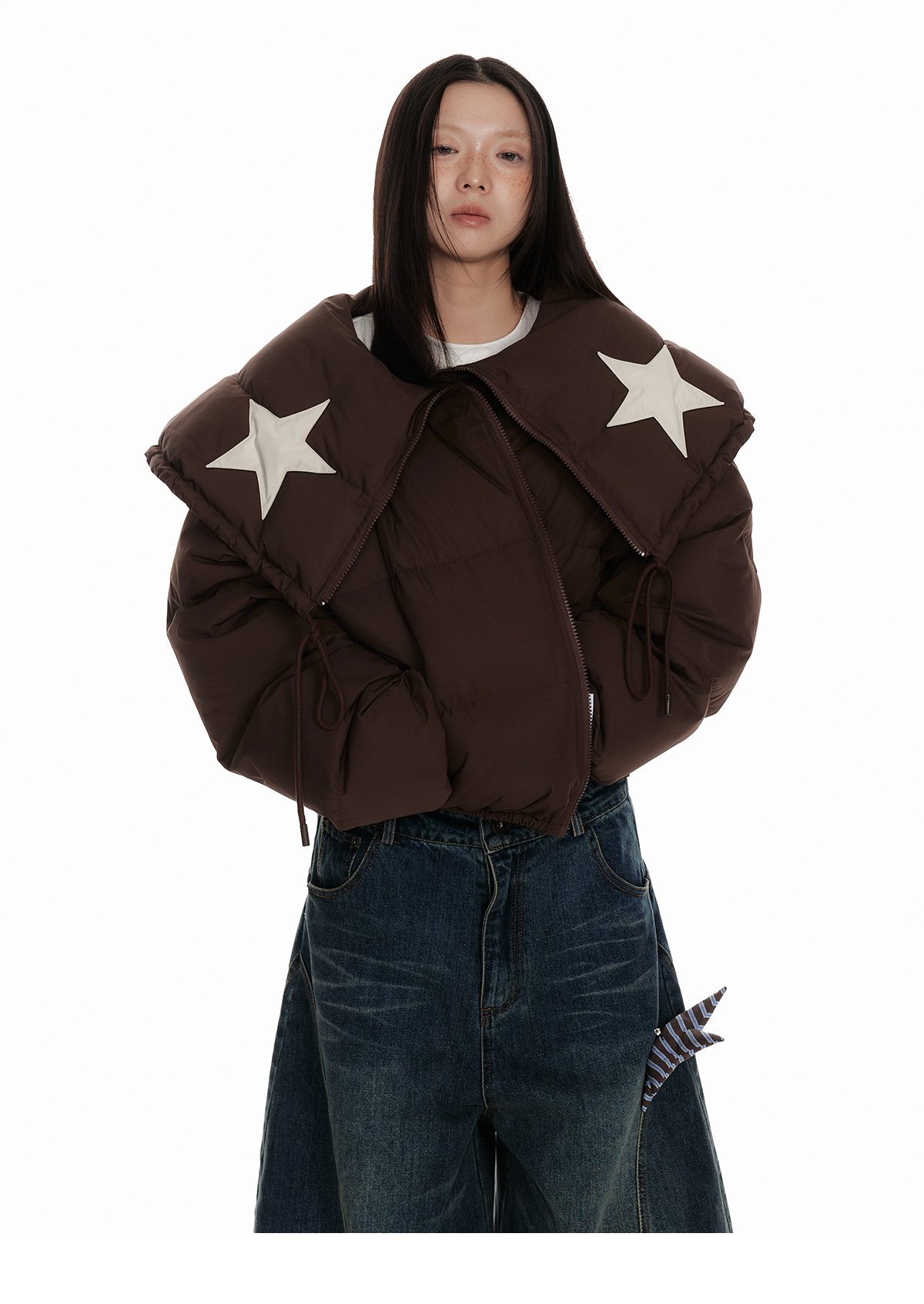 Drawstring Shawl Collar Two-Way Short White Duck Down Jacket NA7106