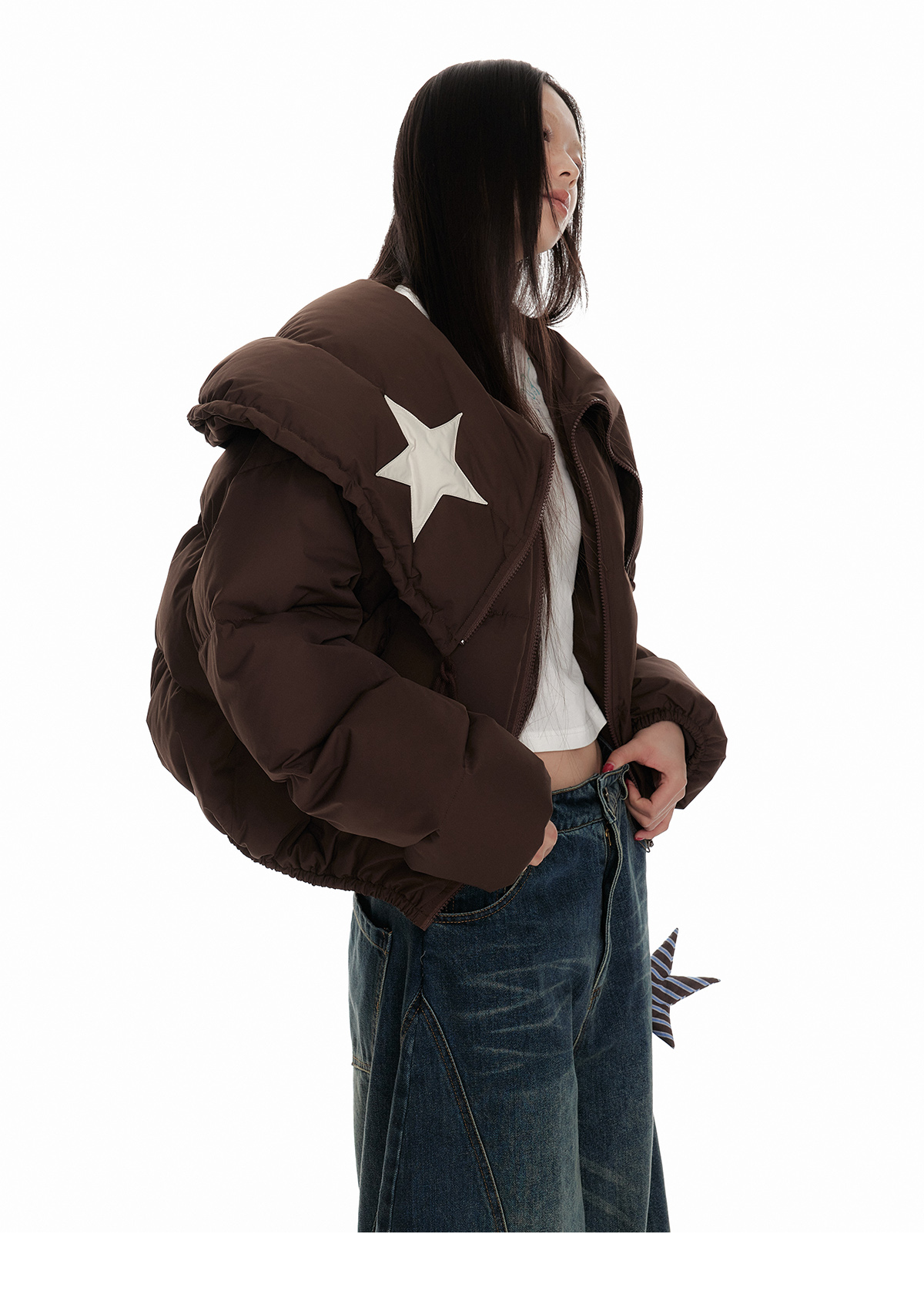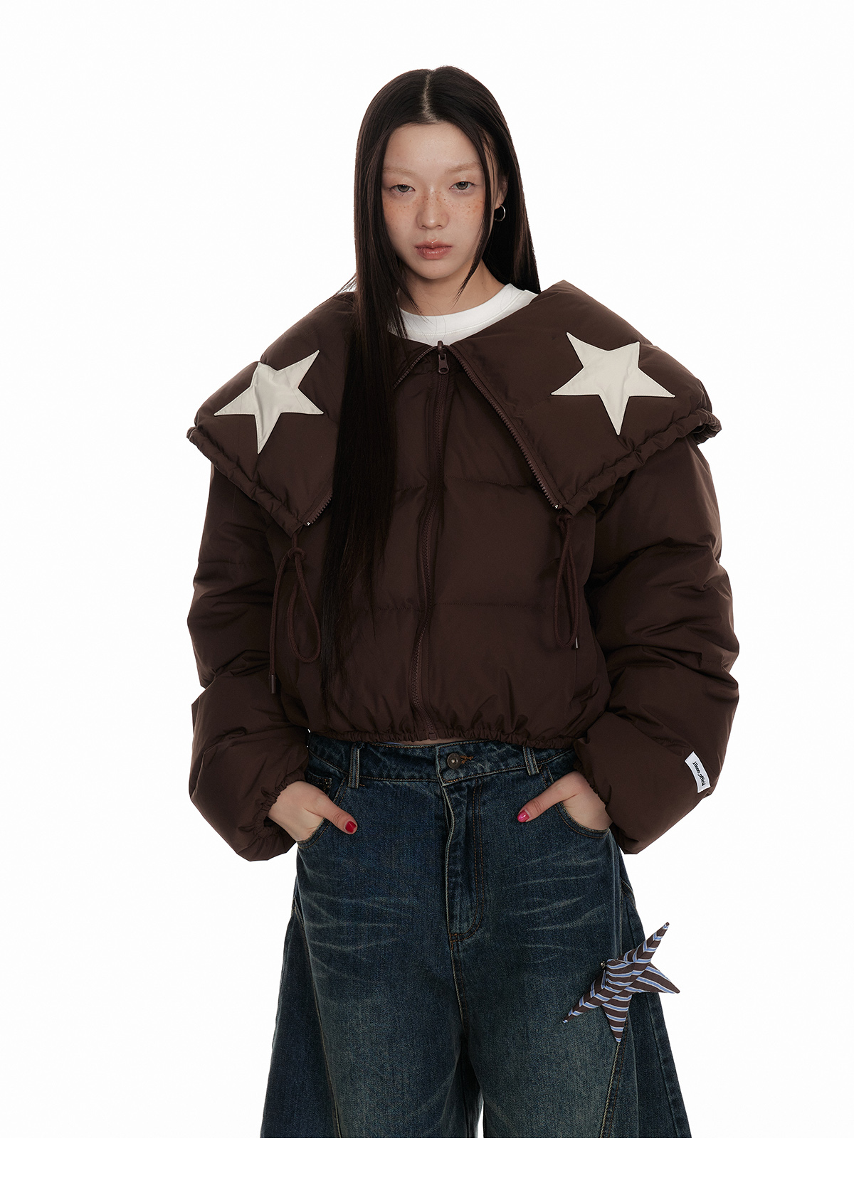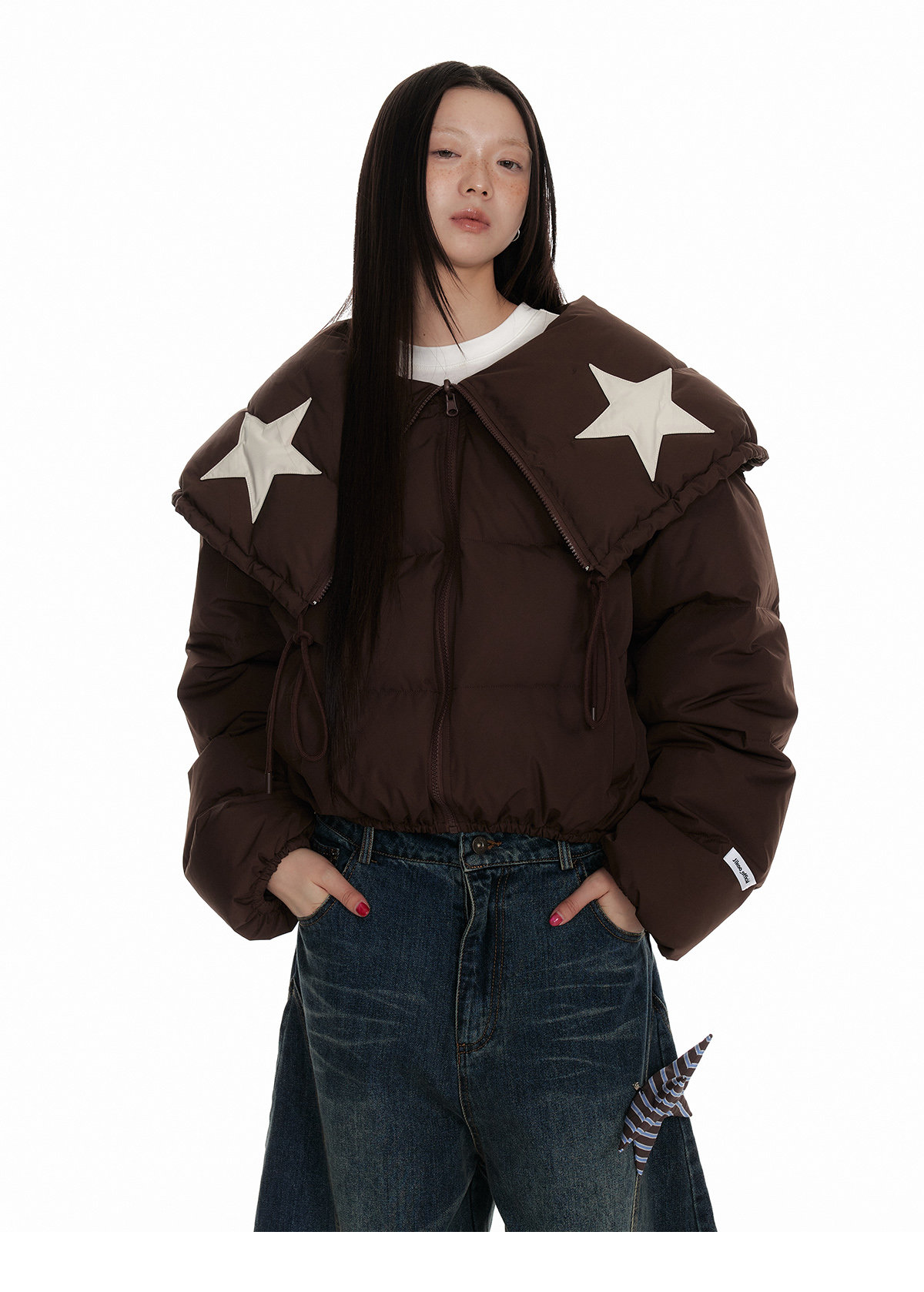 Drawstring Shawl Collar Two-Way Short White Duck Down Jacket NA7106