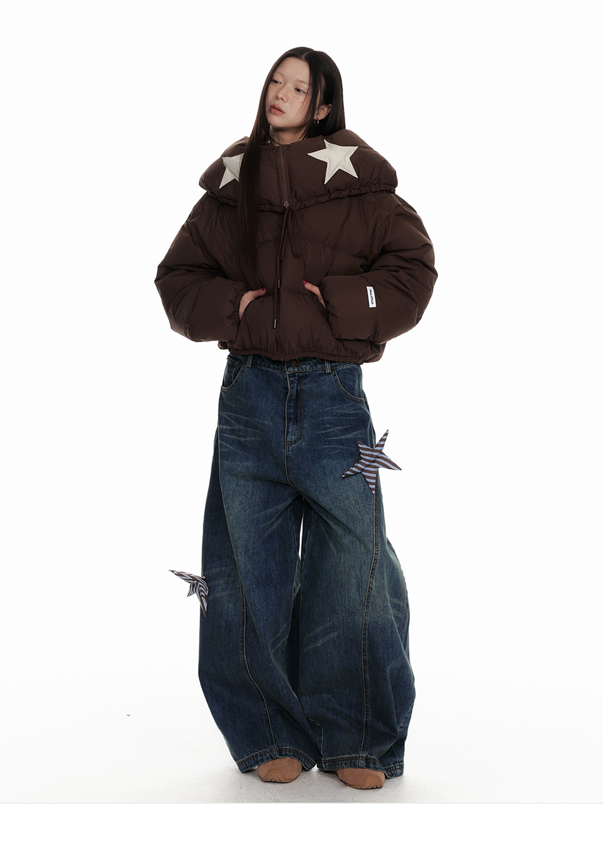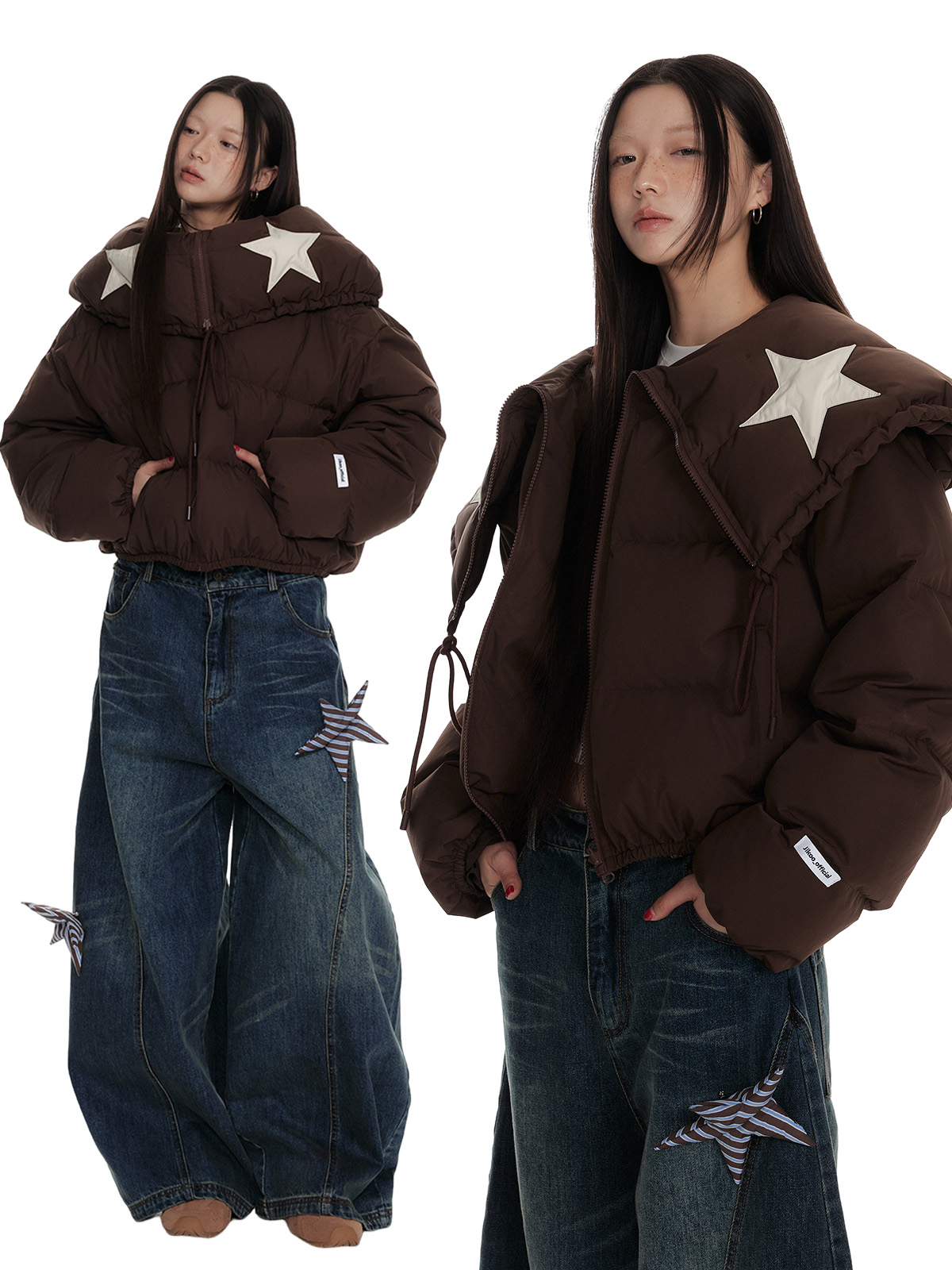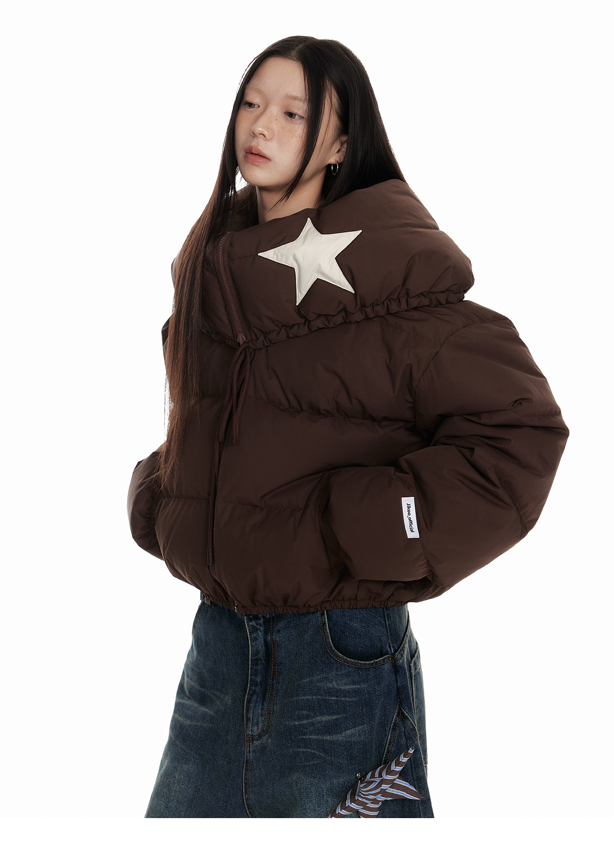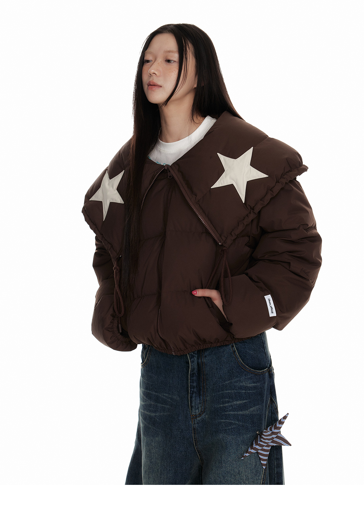 Drawstring Shawl Collar Two-Way Short White Duck Down Jacket NA7106