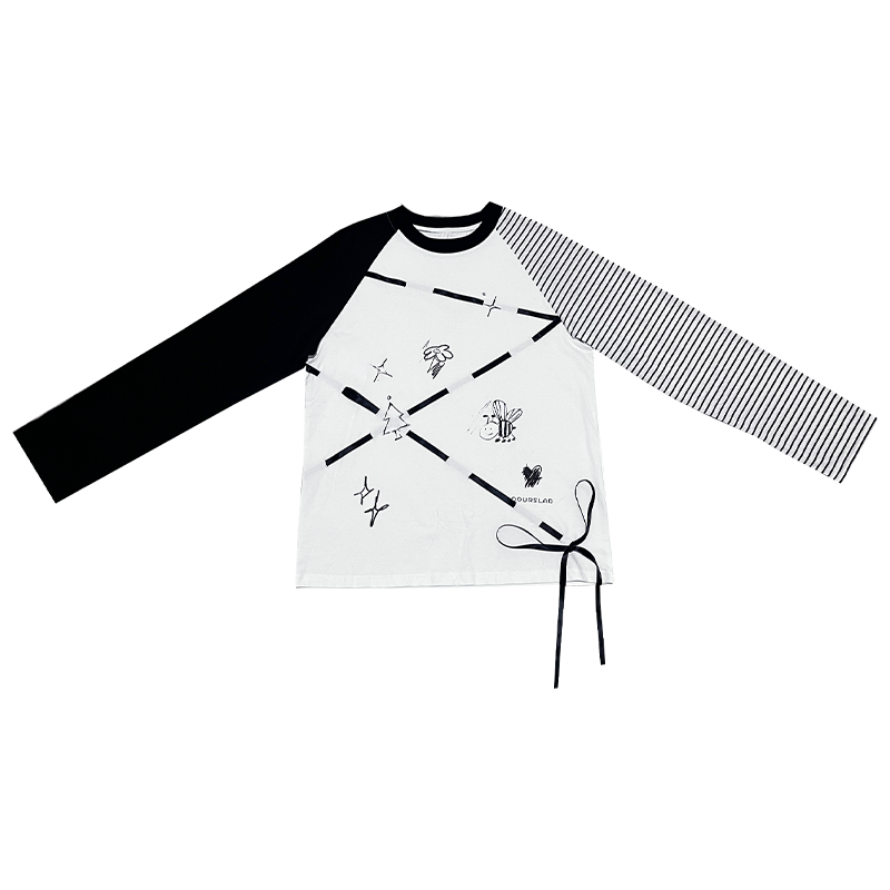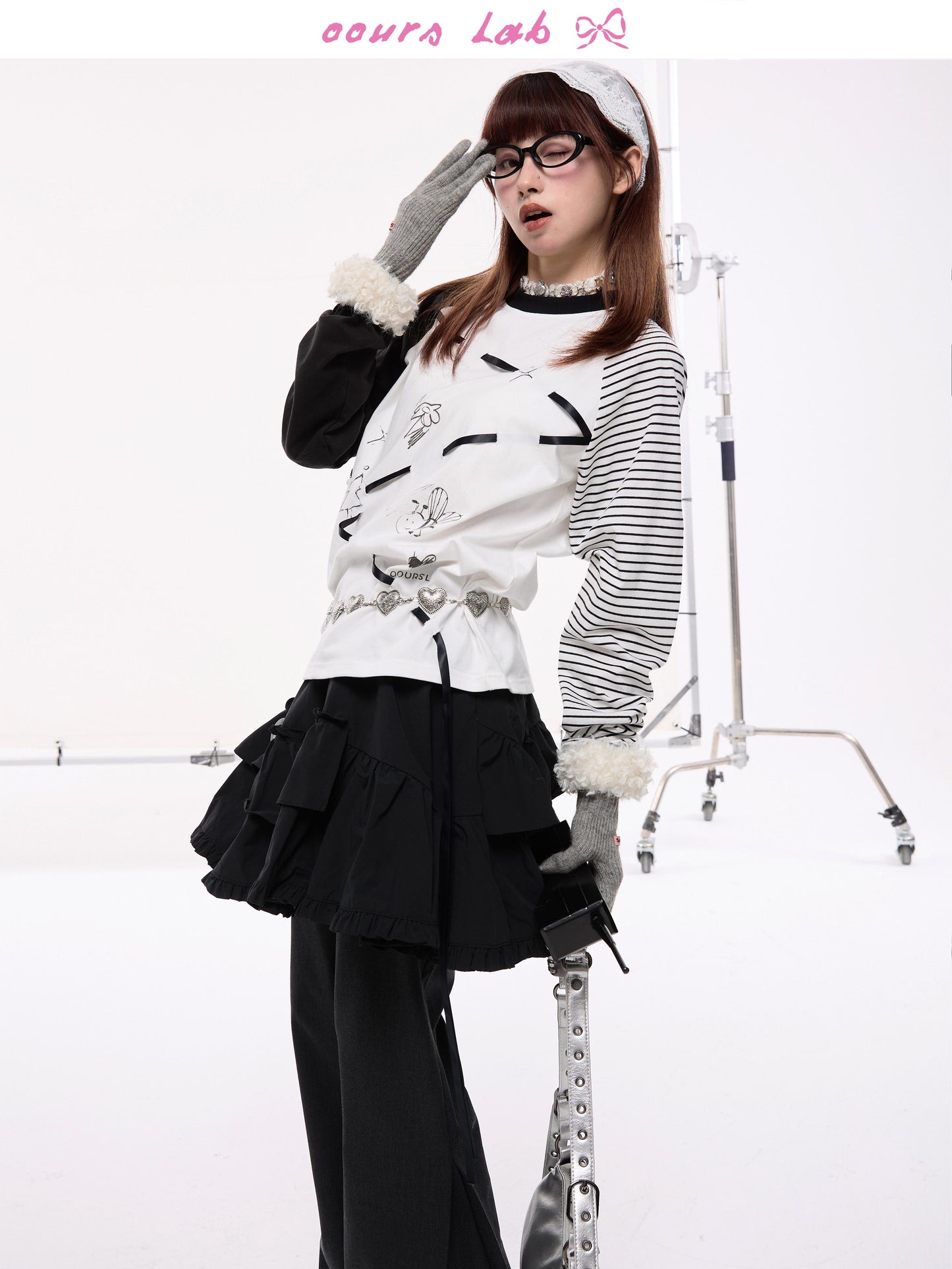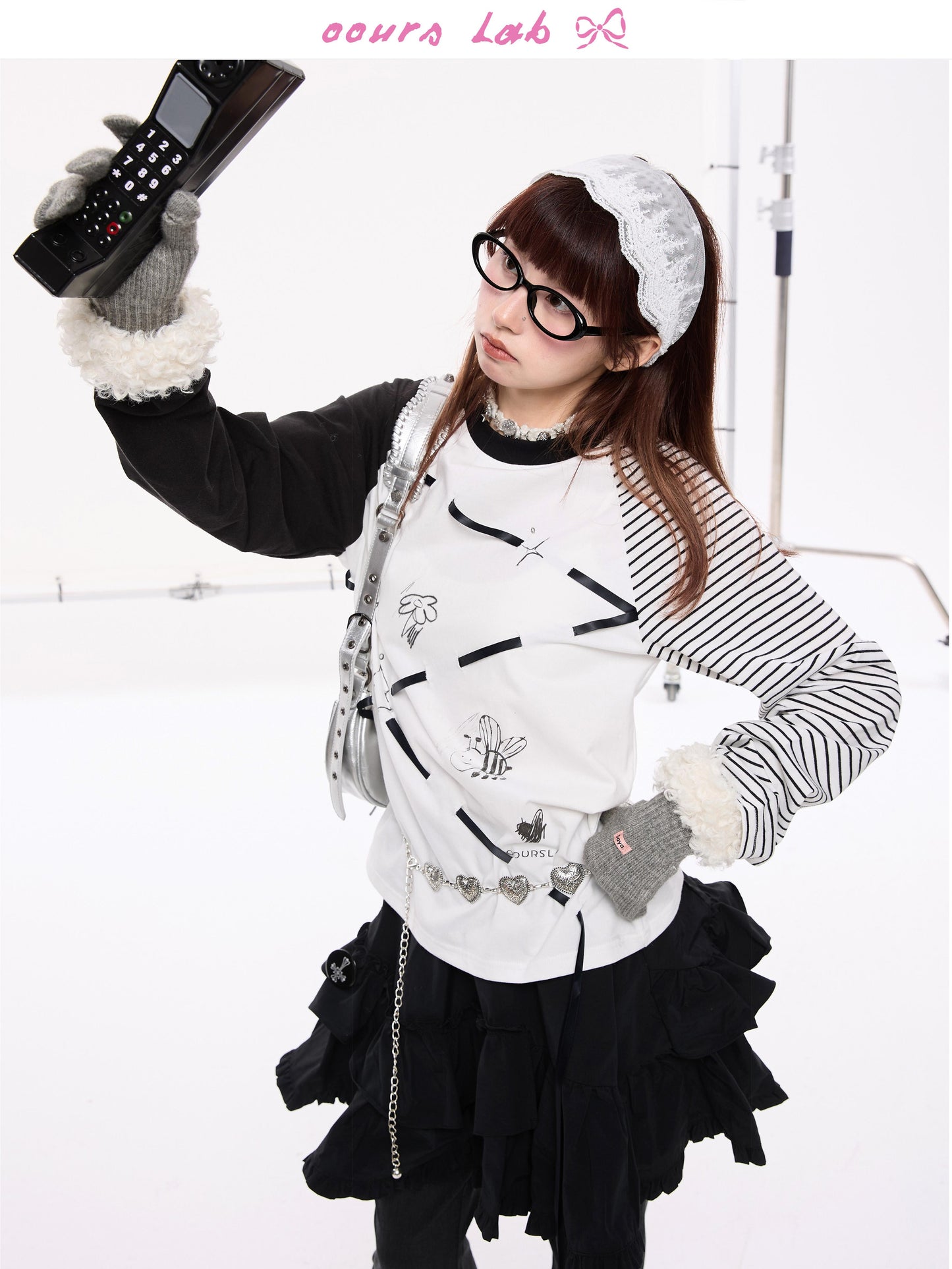 Lace-Up Stripe Patchwork Contrast Raglan Sleeve Long Sleeve T-Shirt NA8251