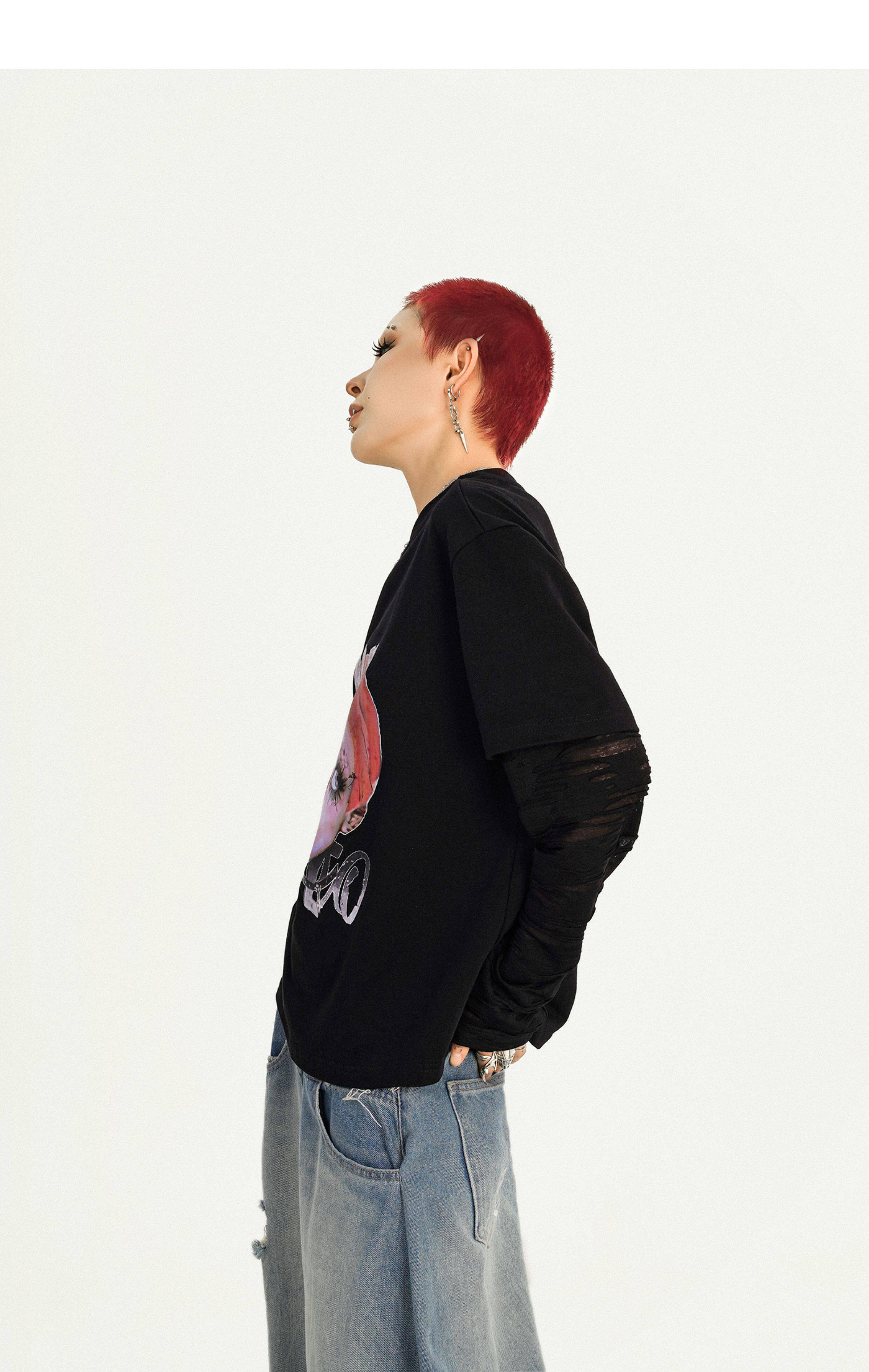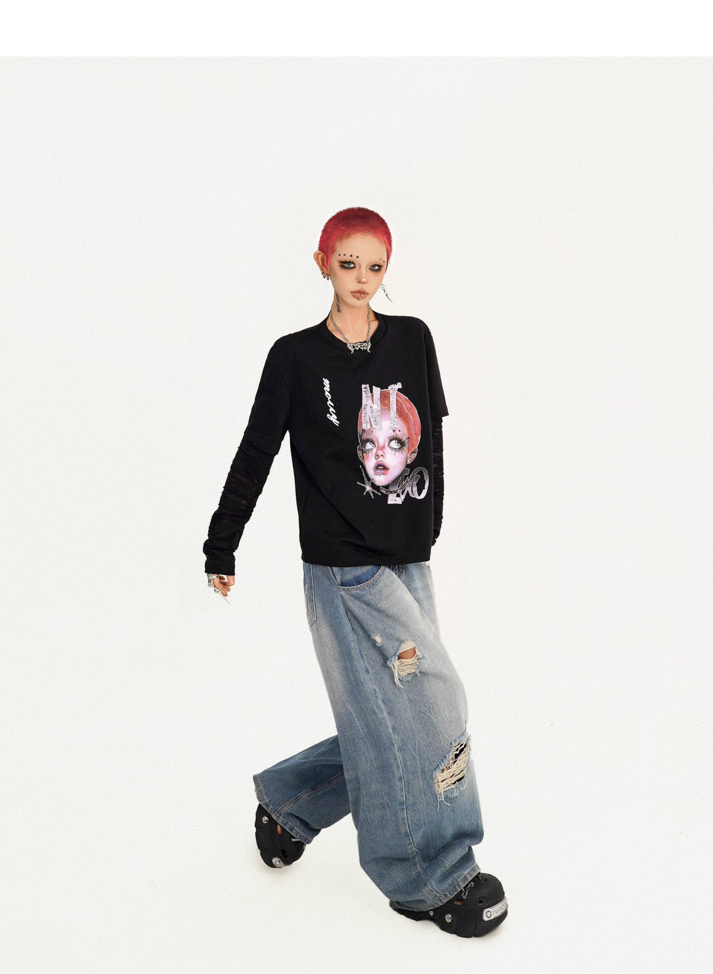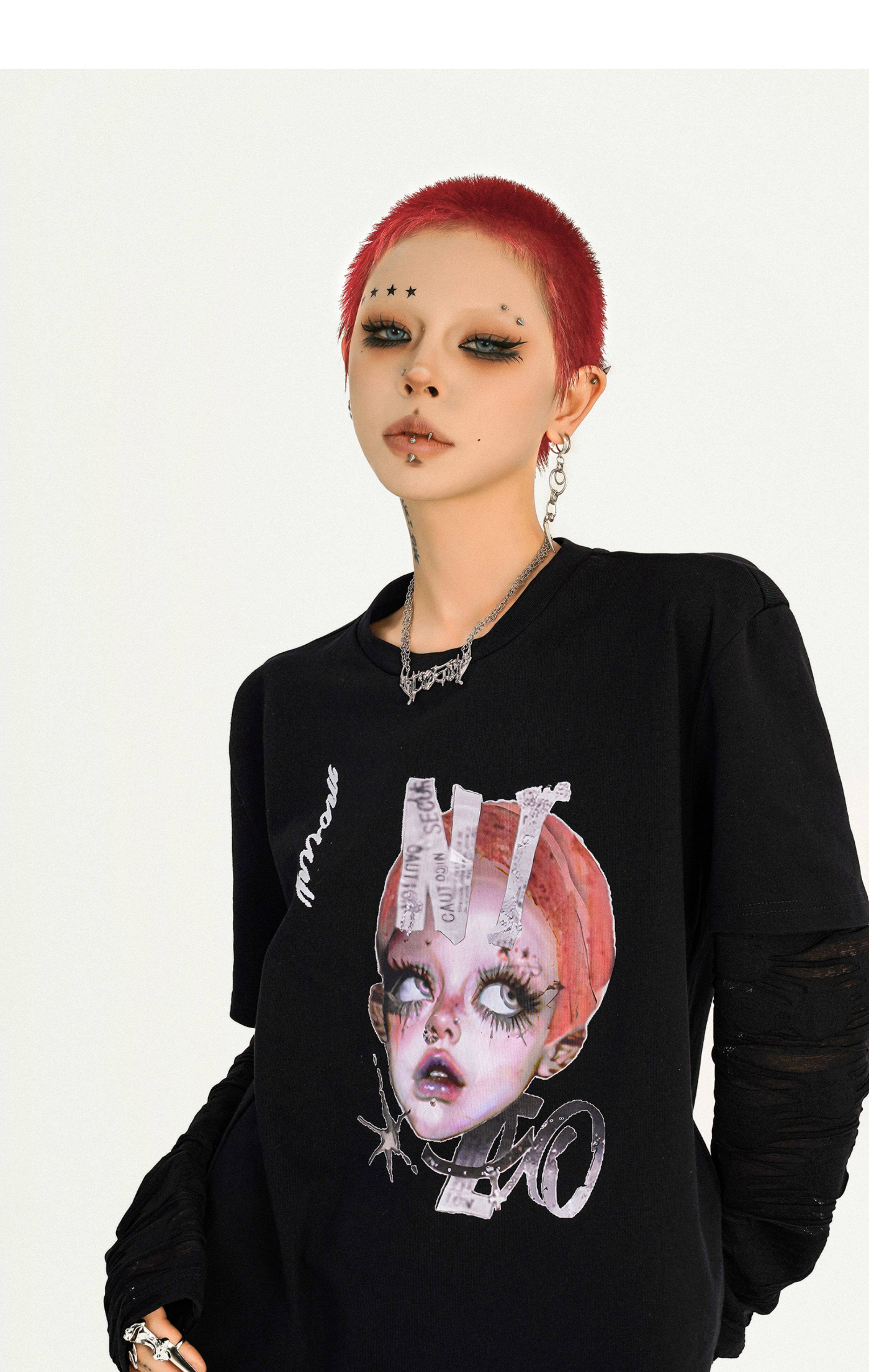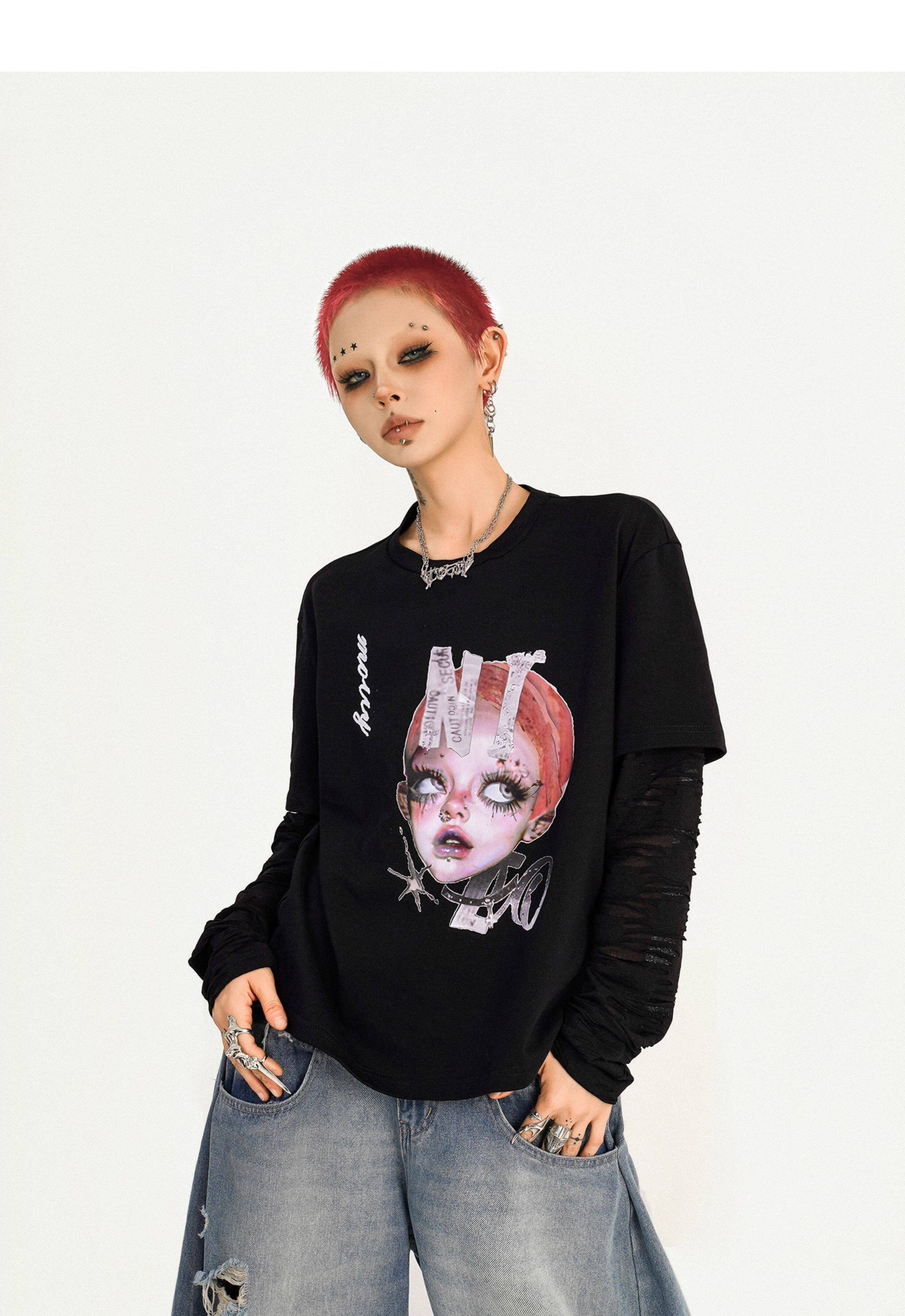 Cartoon Portrait Print Fake Layered Design Long Sleeve T-Shirt NA8604