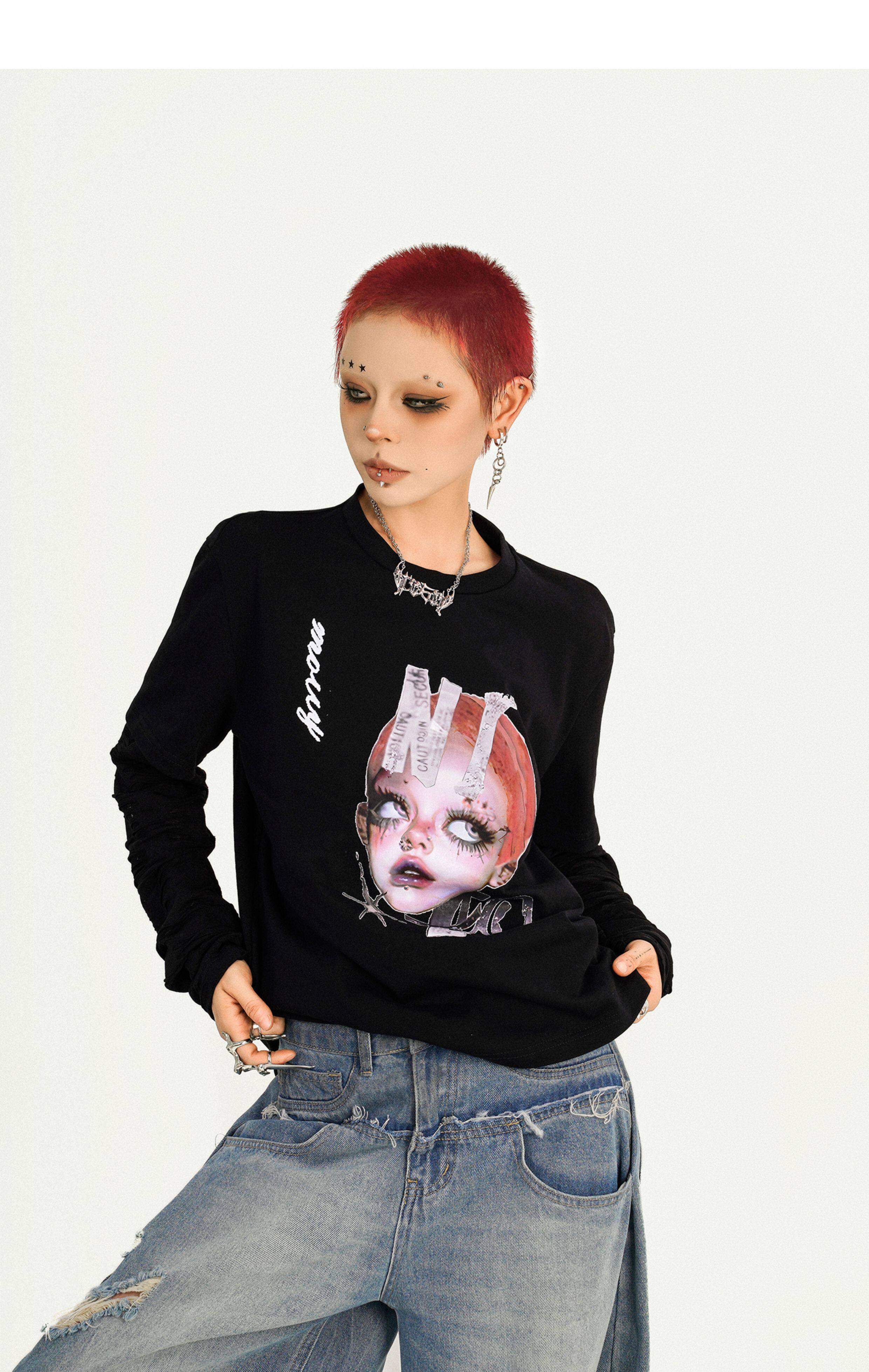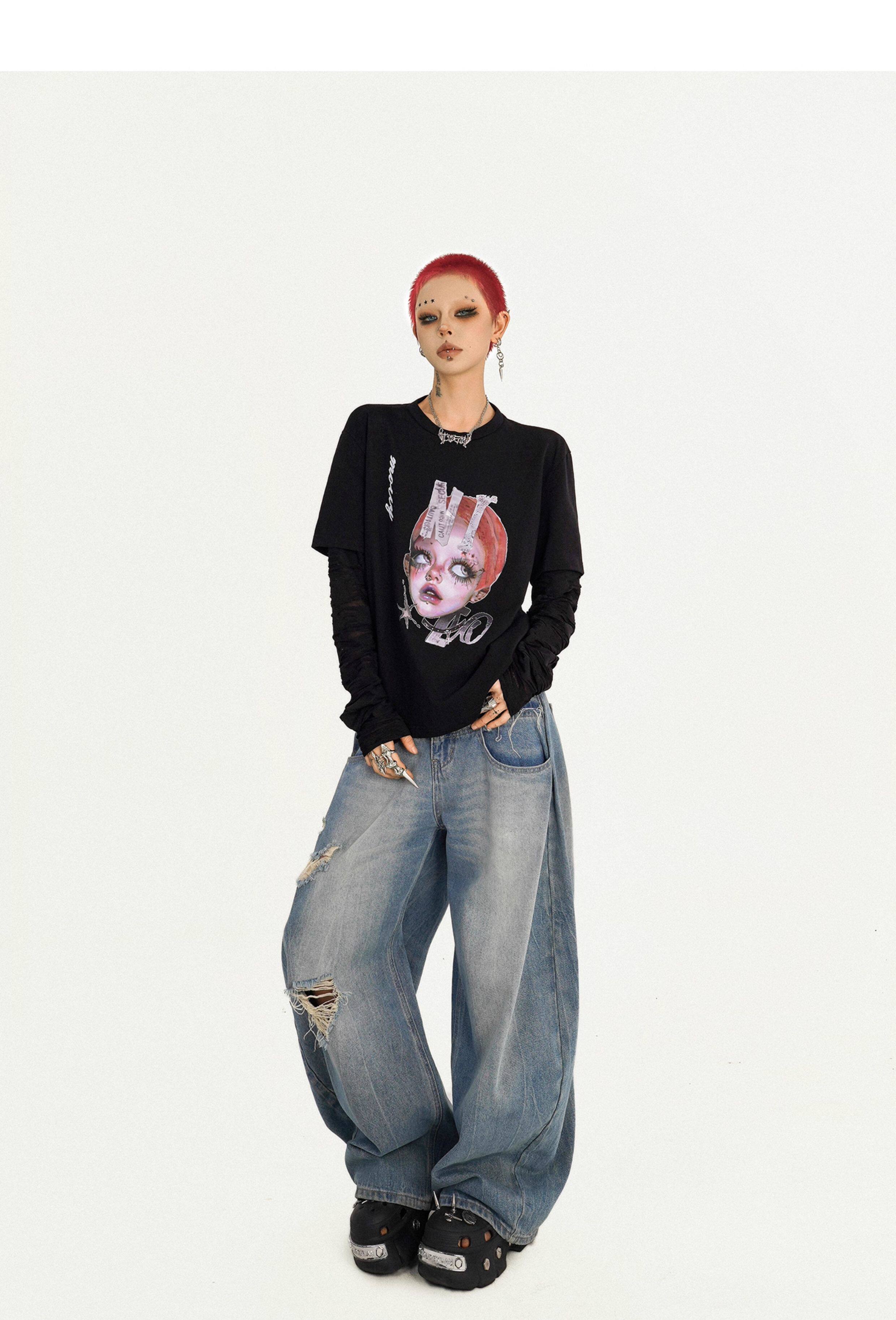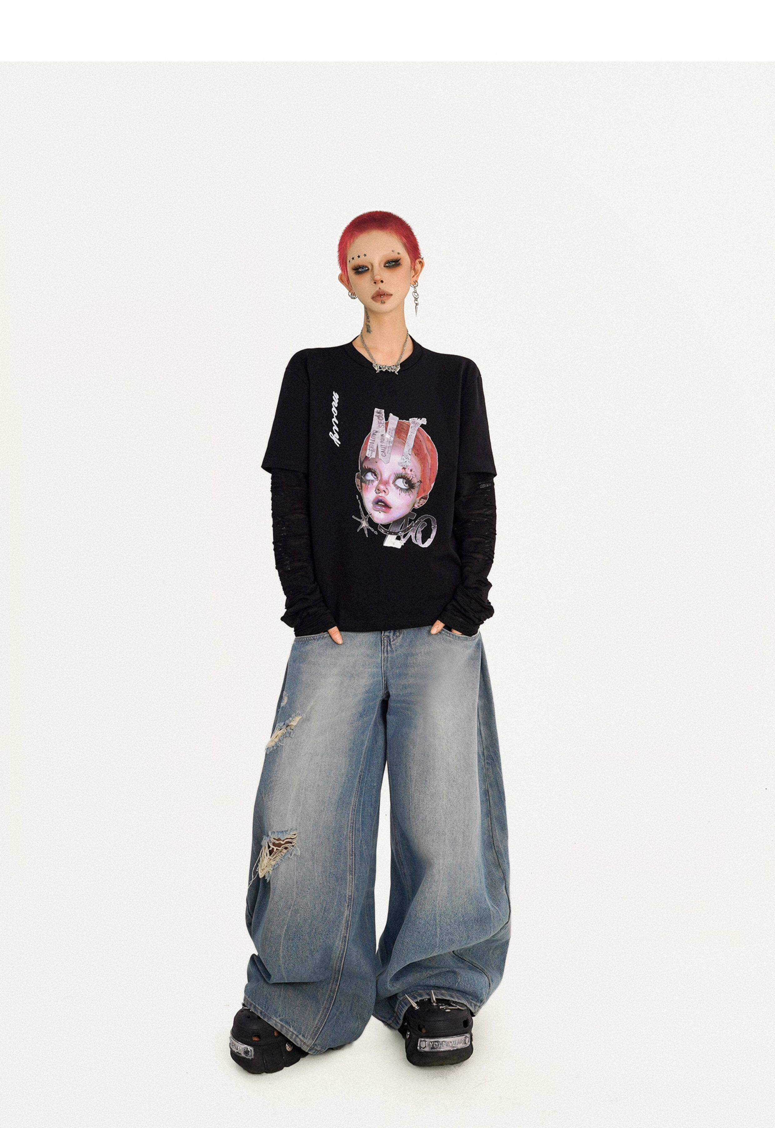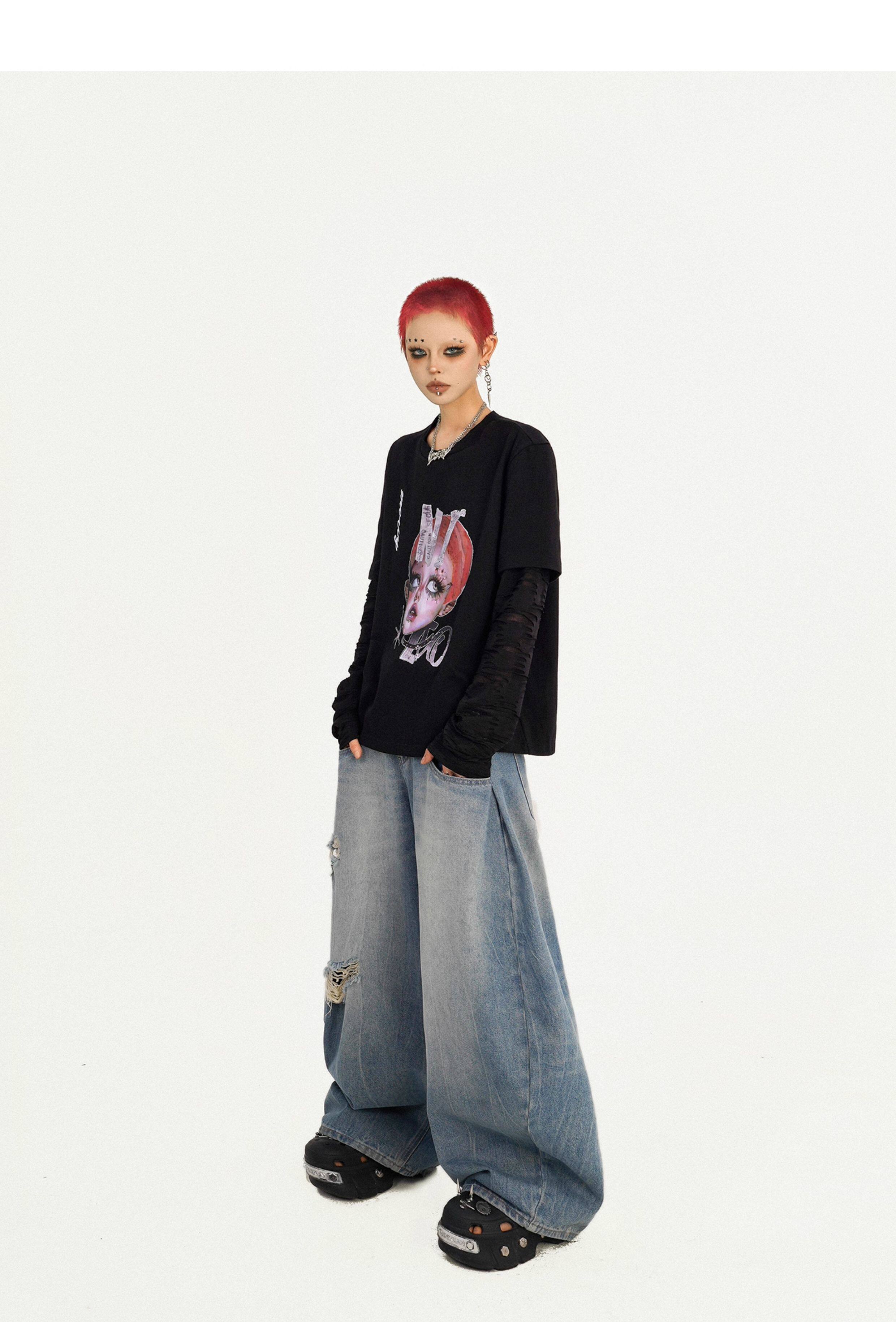 Cartoon Portrait Print Fake Layered Design Long Sleeve T-Shirt NA8604