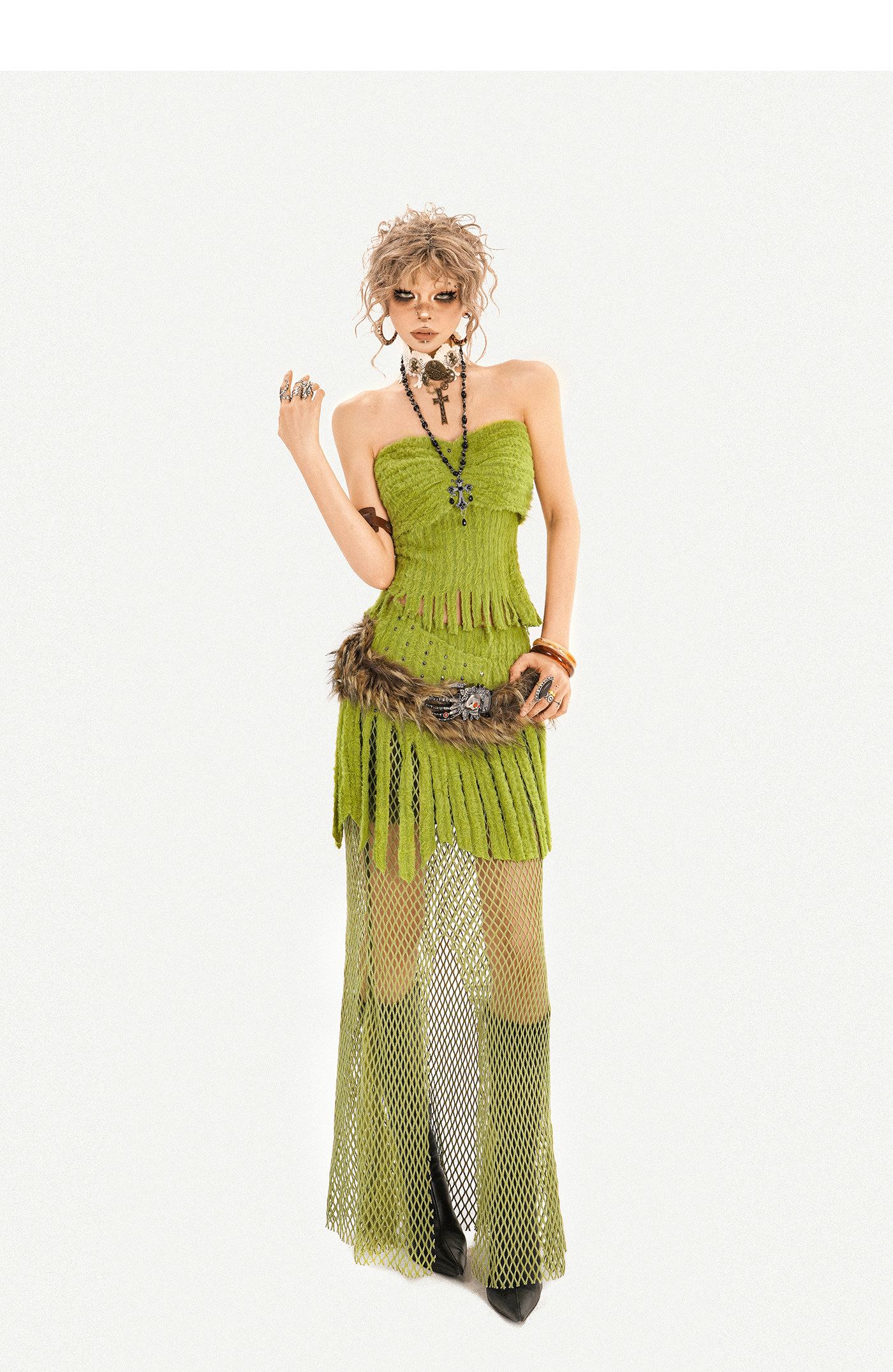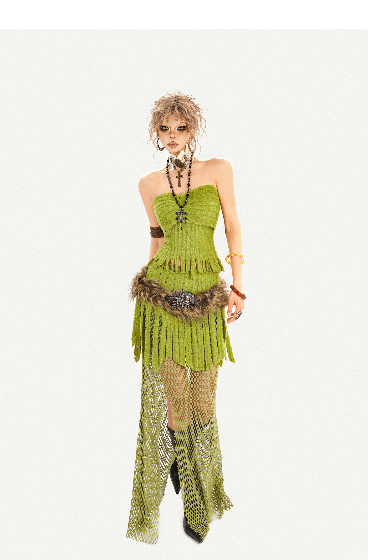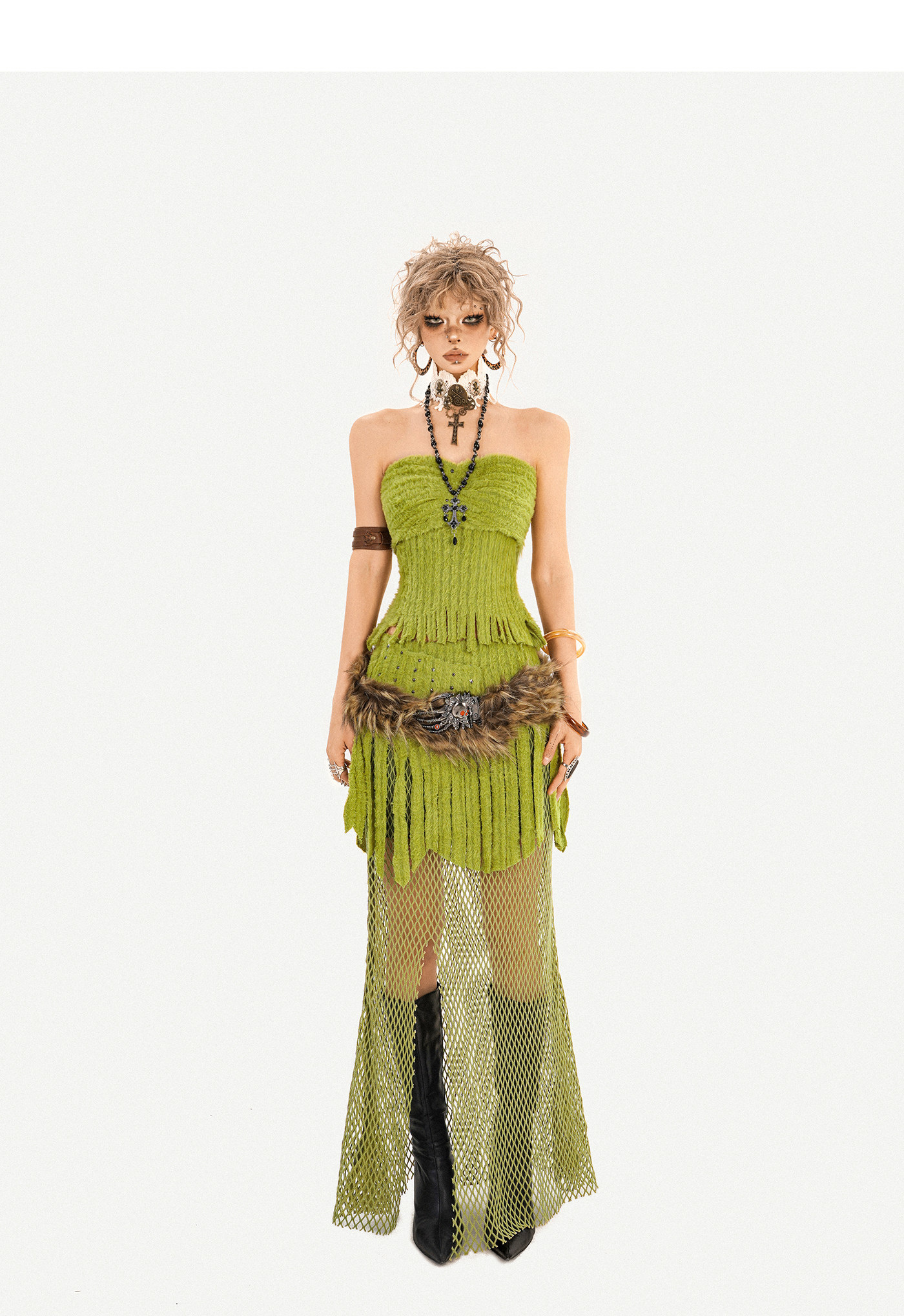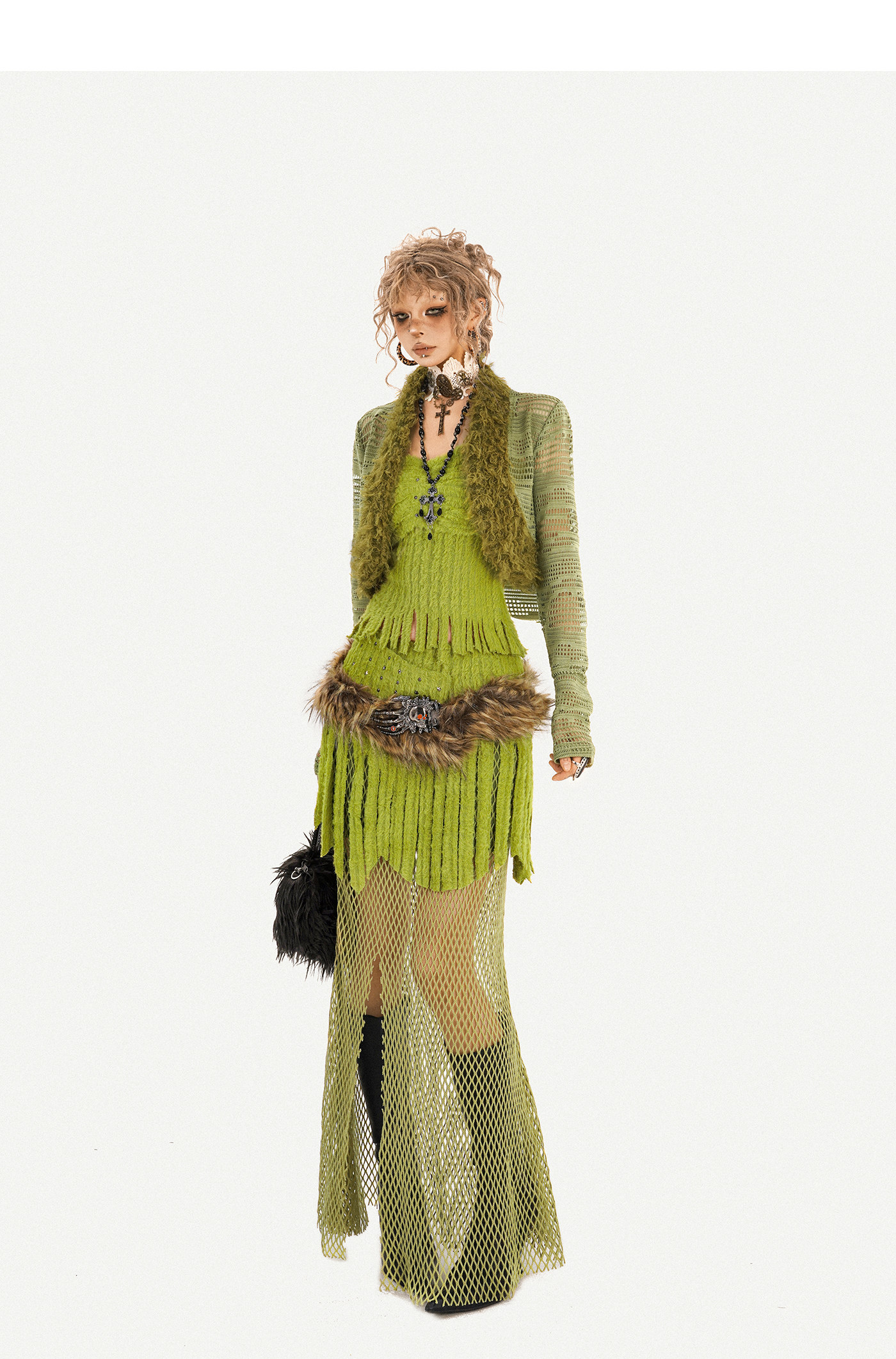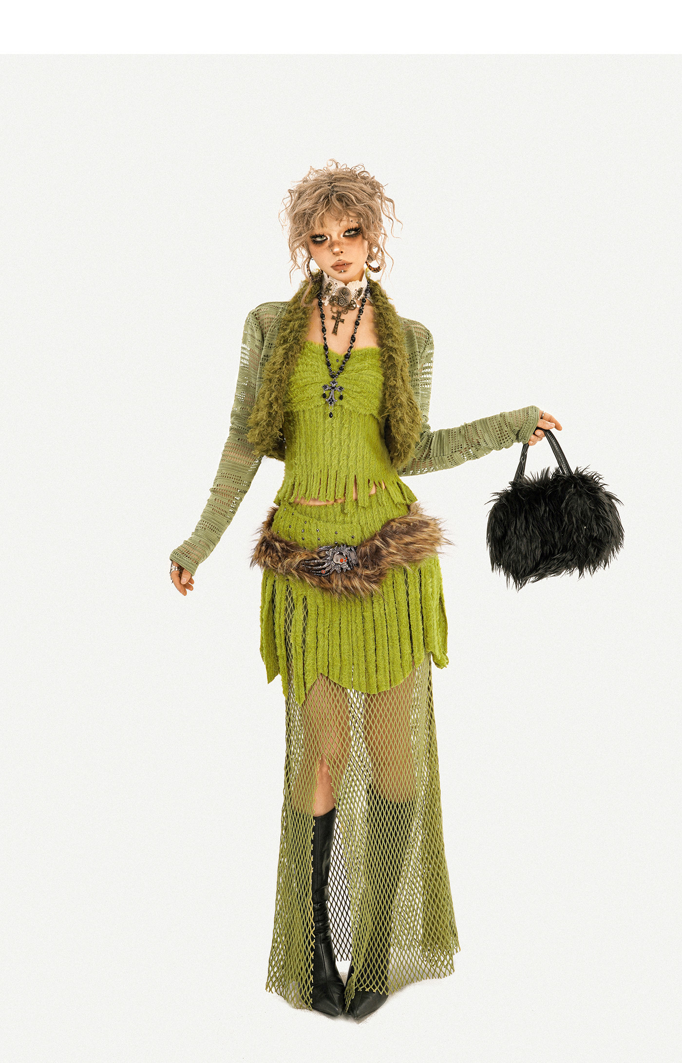 Fake Fur Patchwork Mesh Knit Cardigan & Tube Top & Mesh Long Skirt Setup NA8610