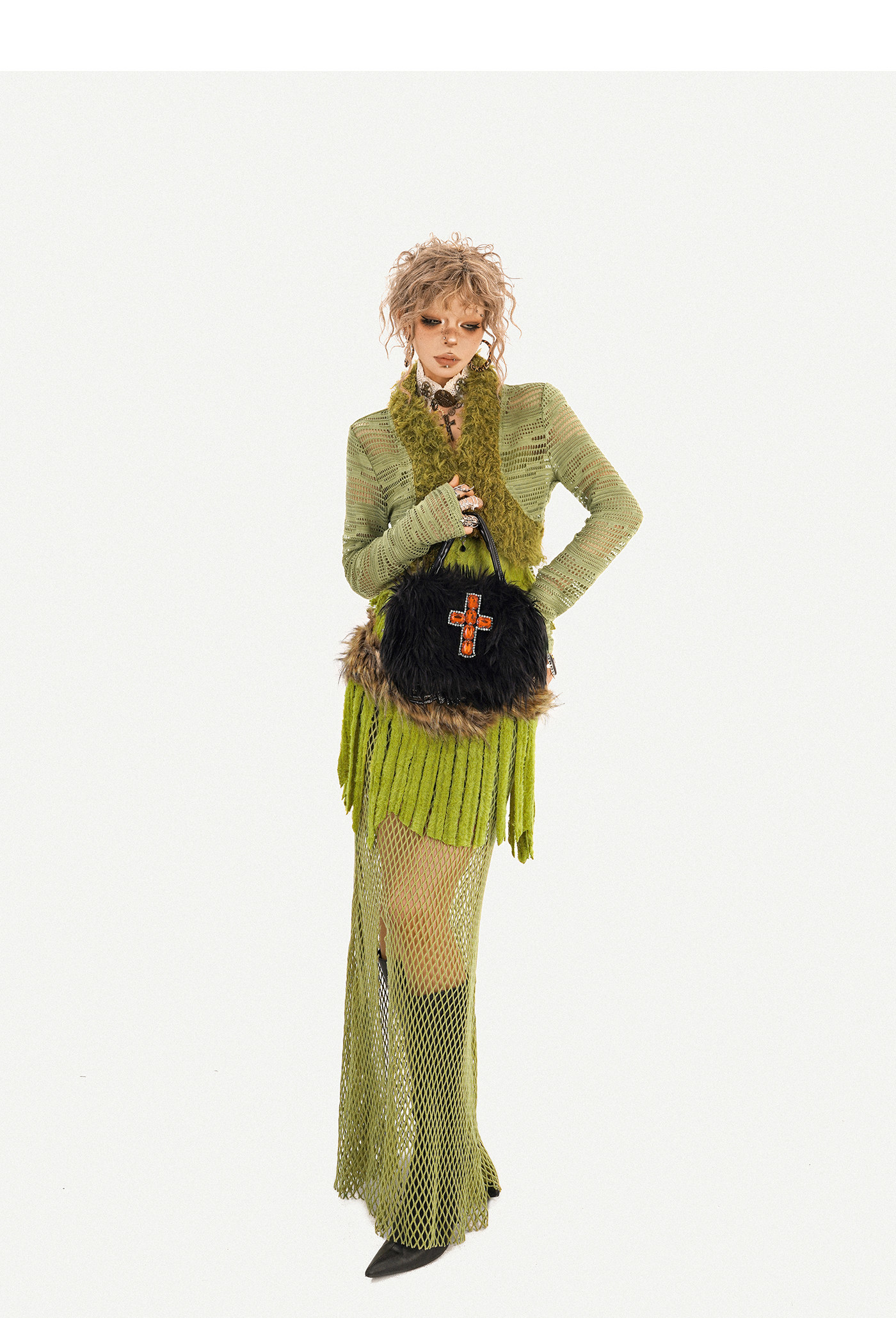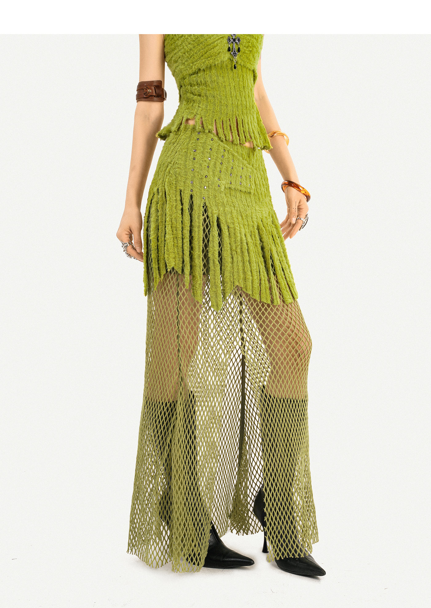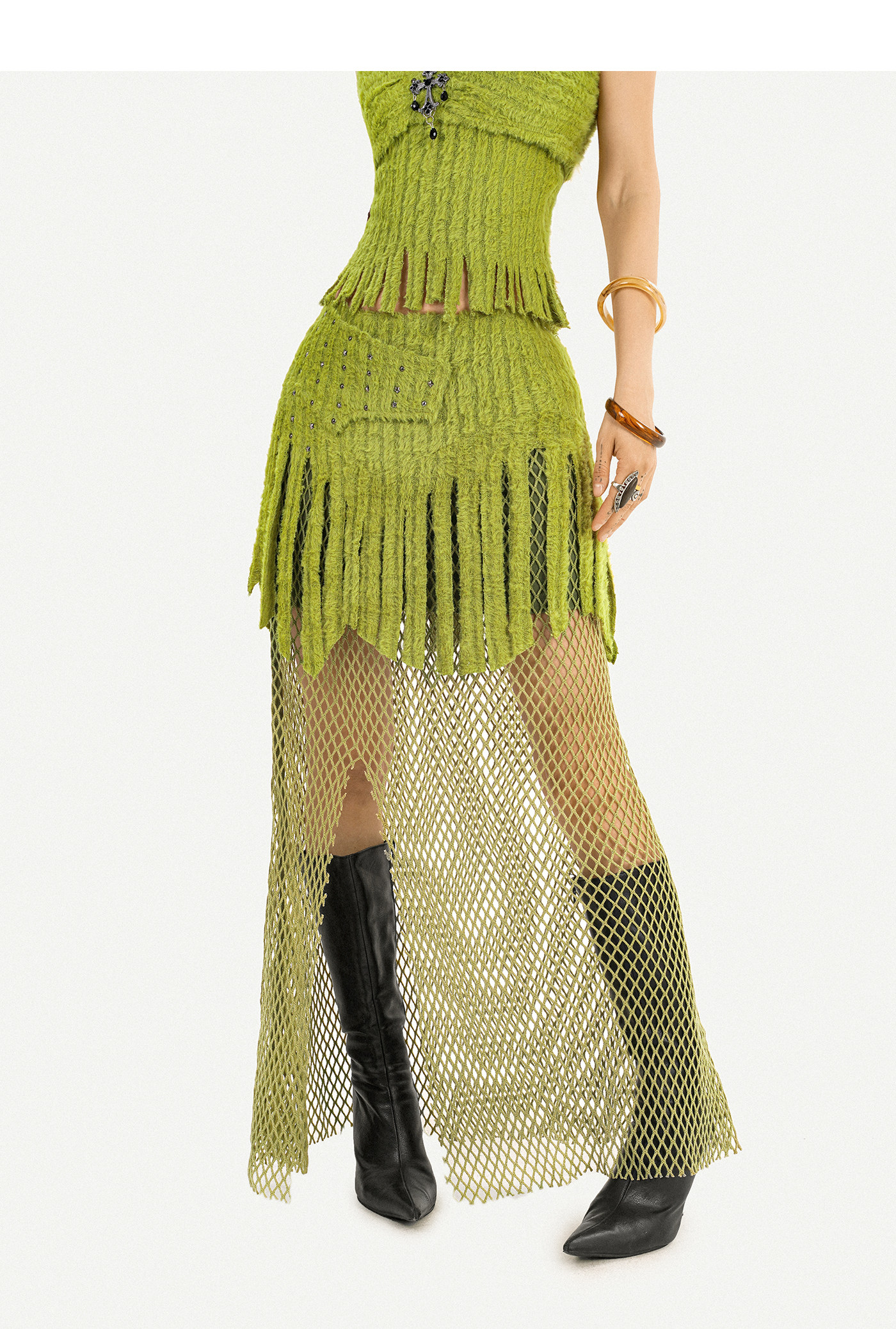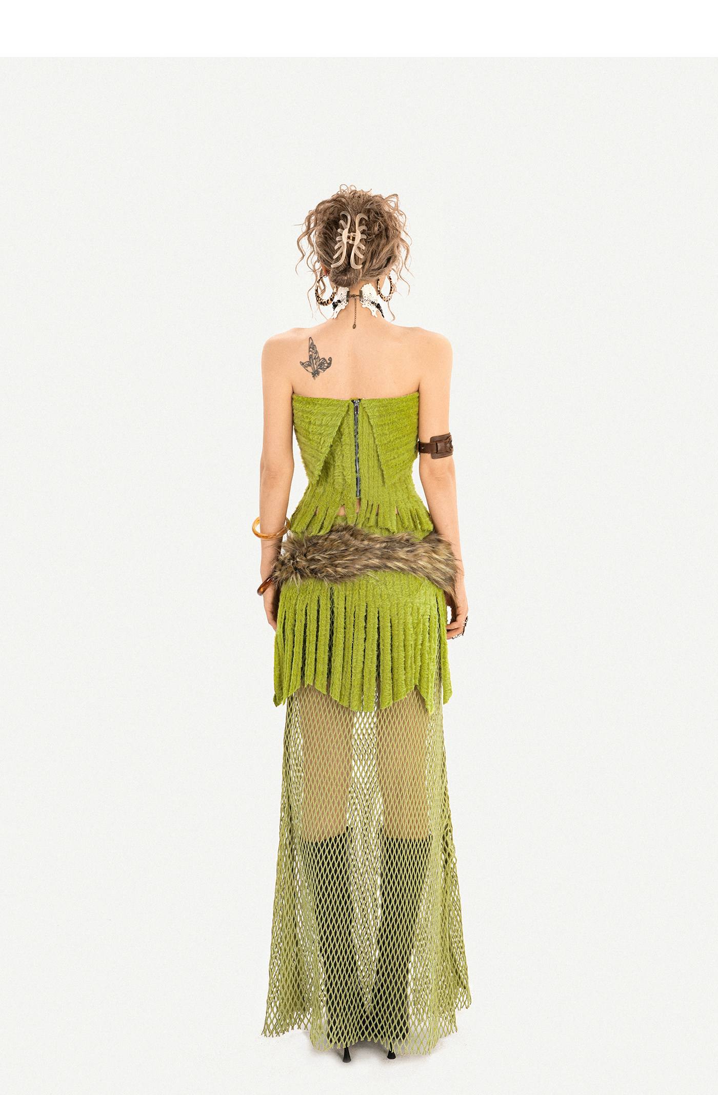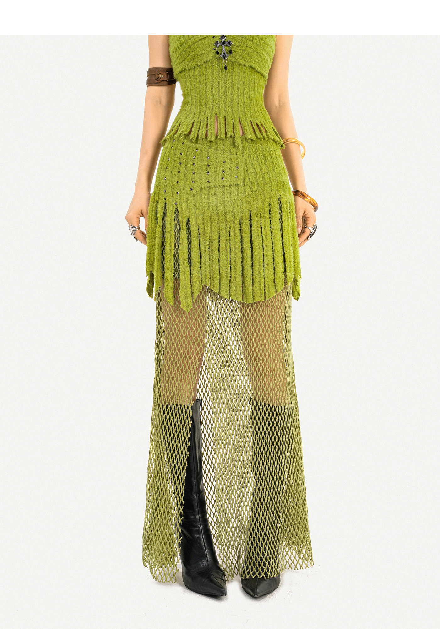 Fake Fur Patchwork Mesh Knit Cardigan & Tube Top & Mesh Long Skirt Setup NA8610
