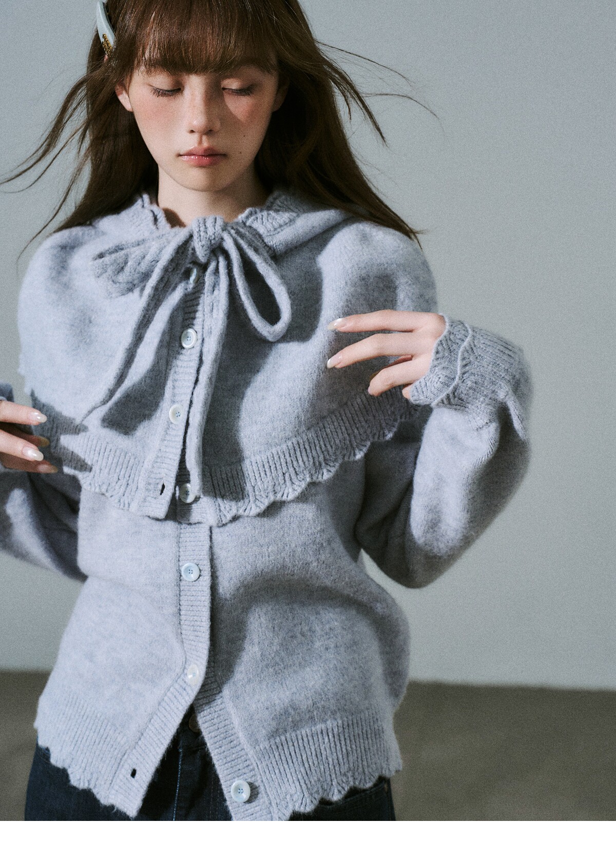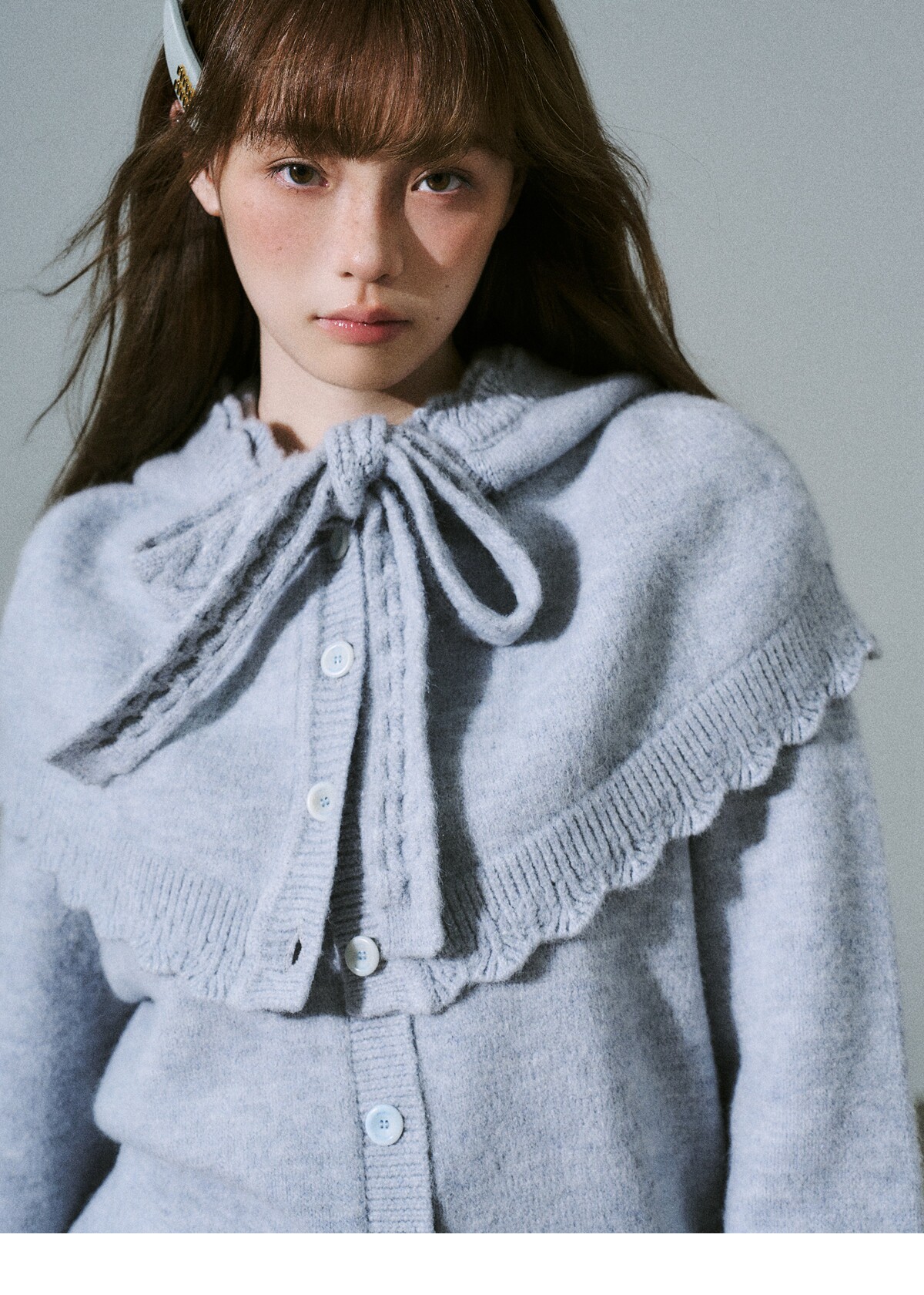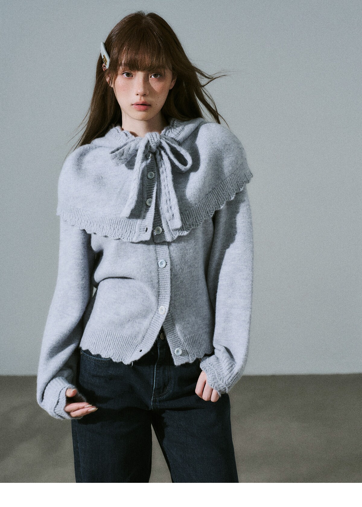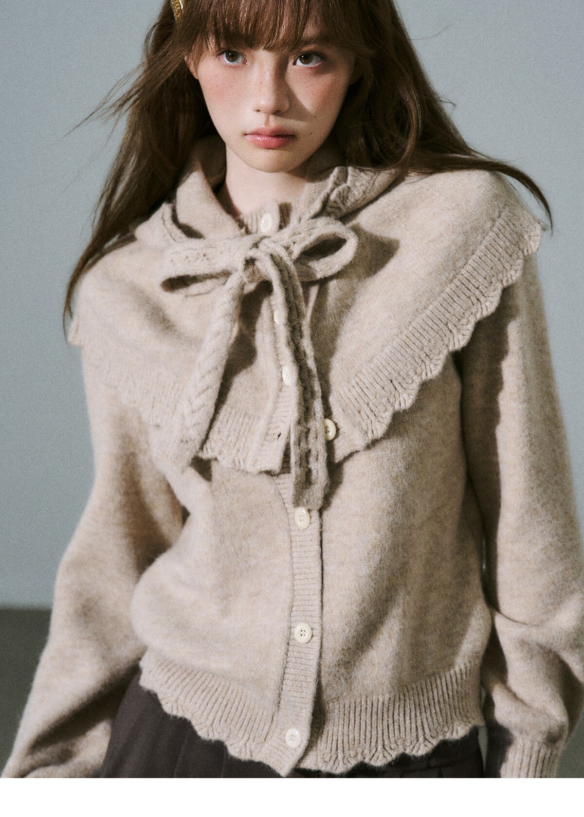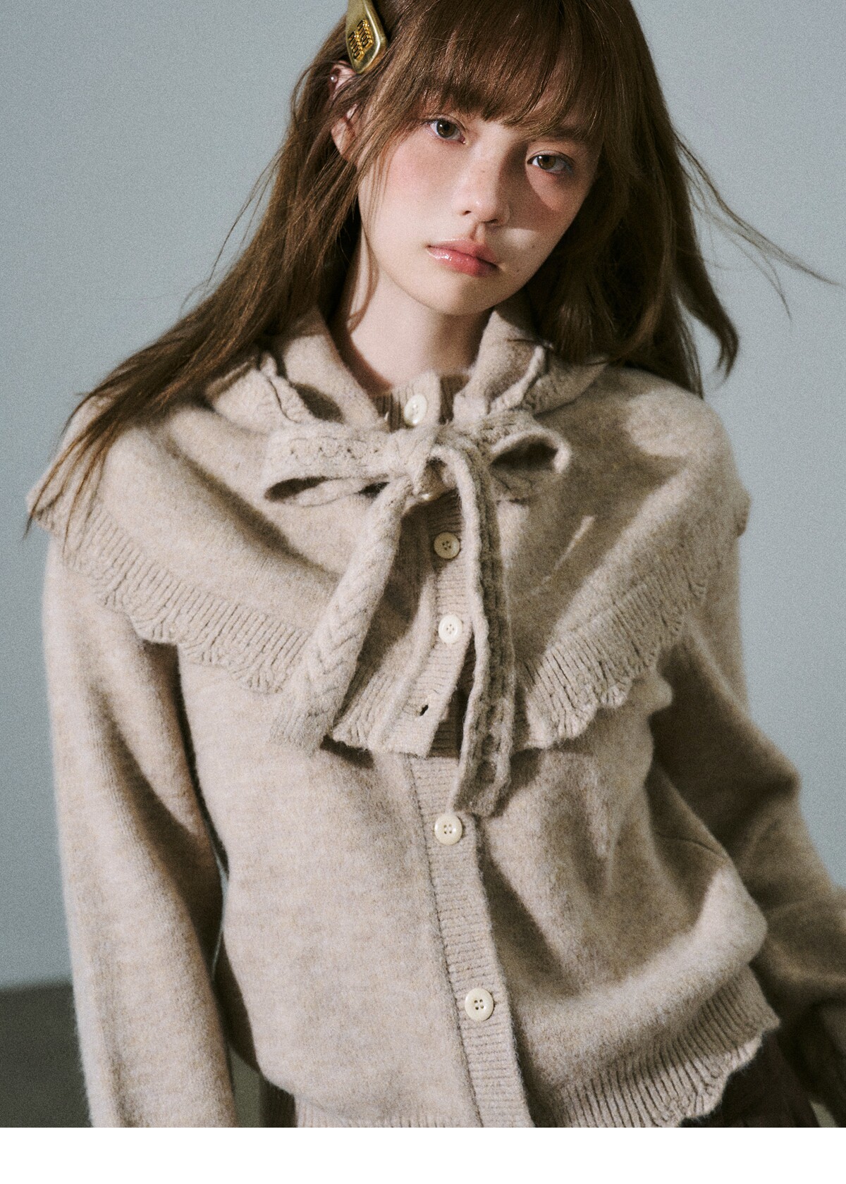 Ruffled Collar and Bow Detail Knit Cardigan NA8824