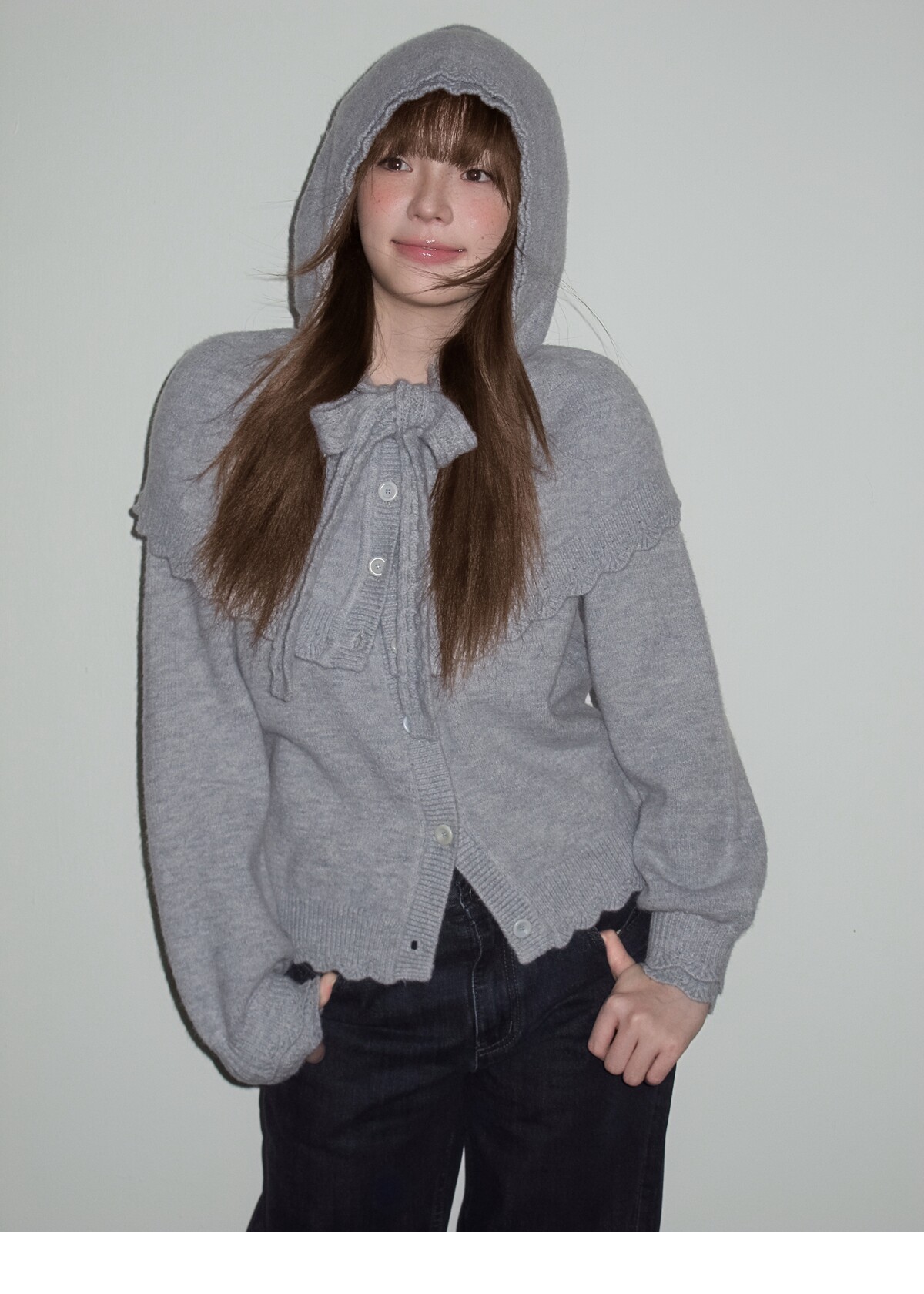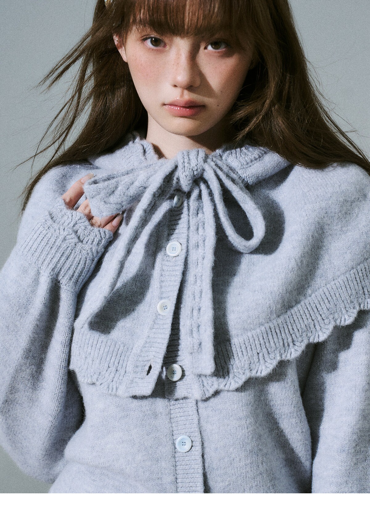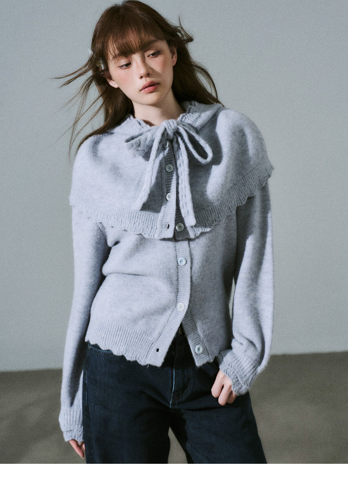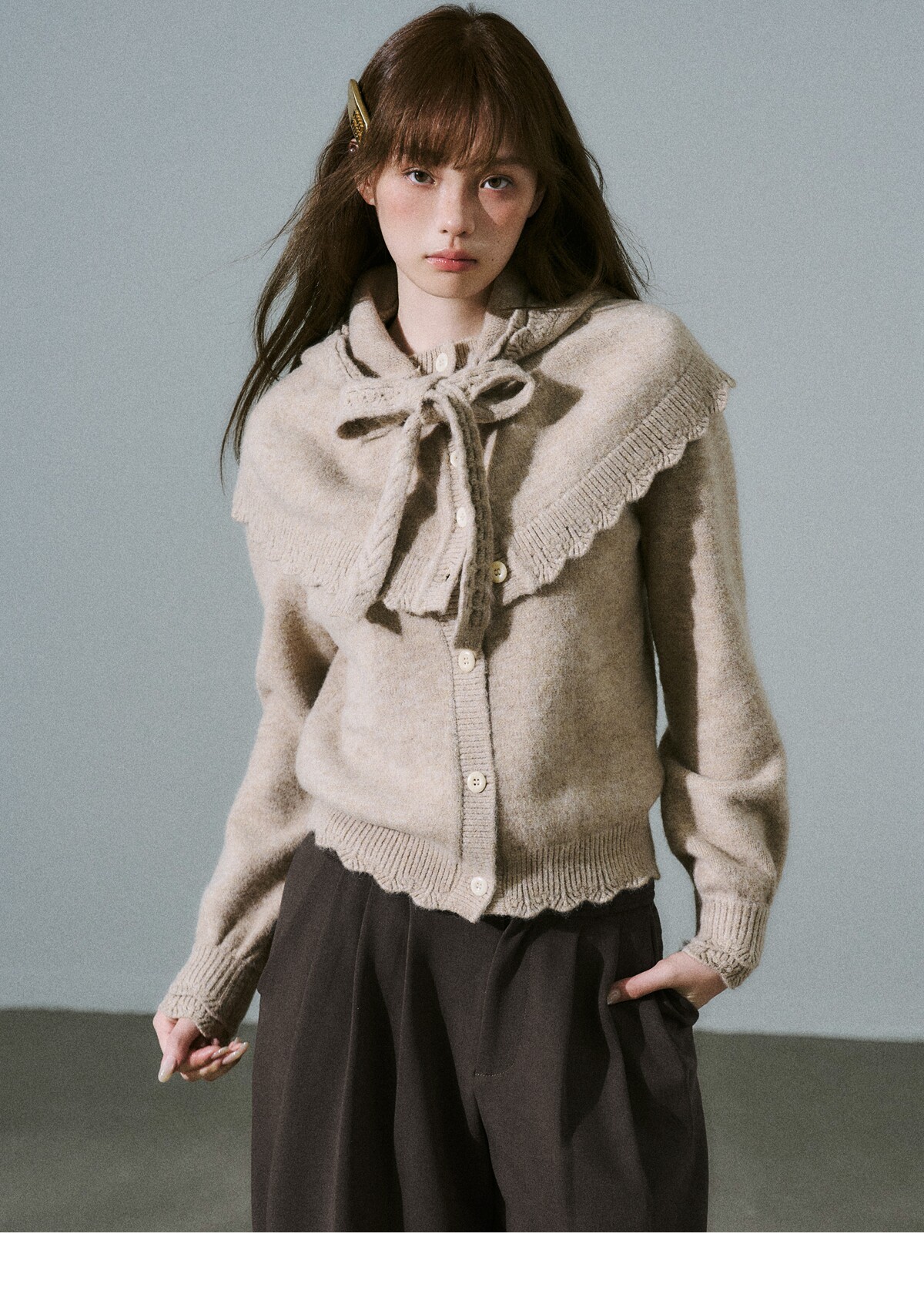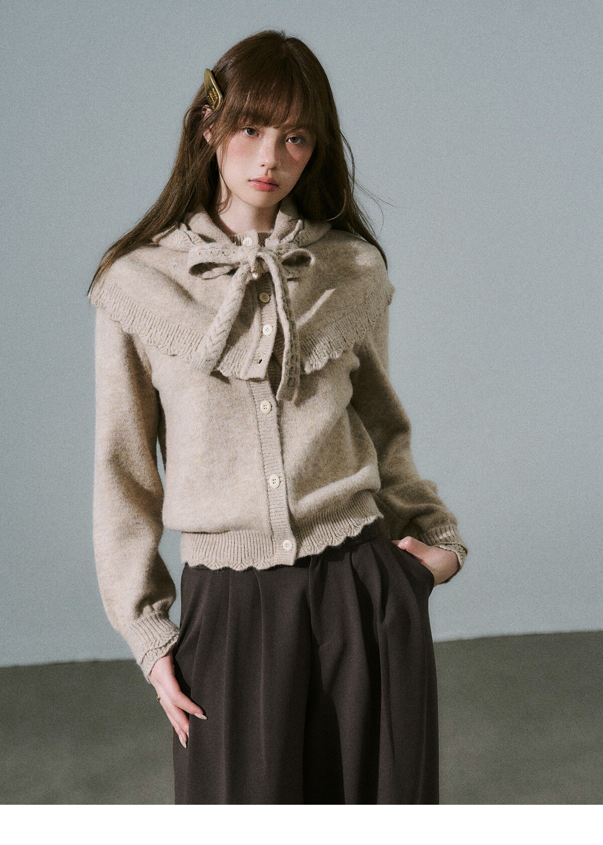 Ruffled Collar and Bow Detail Knit Cardigan NA8824