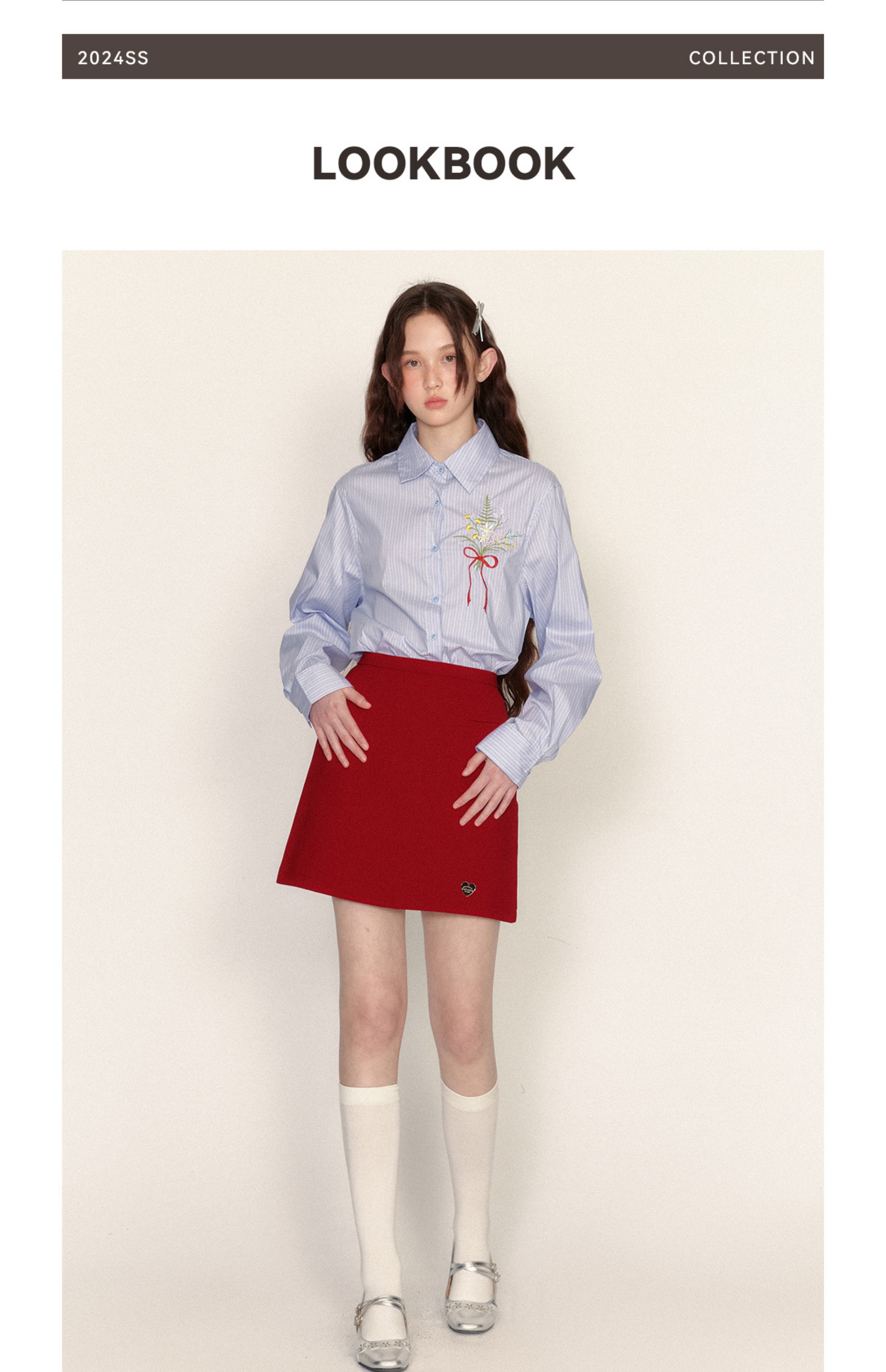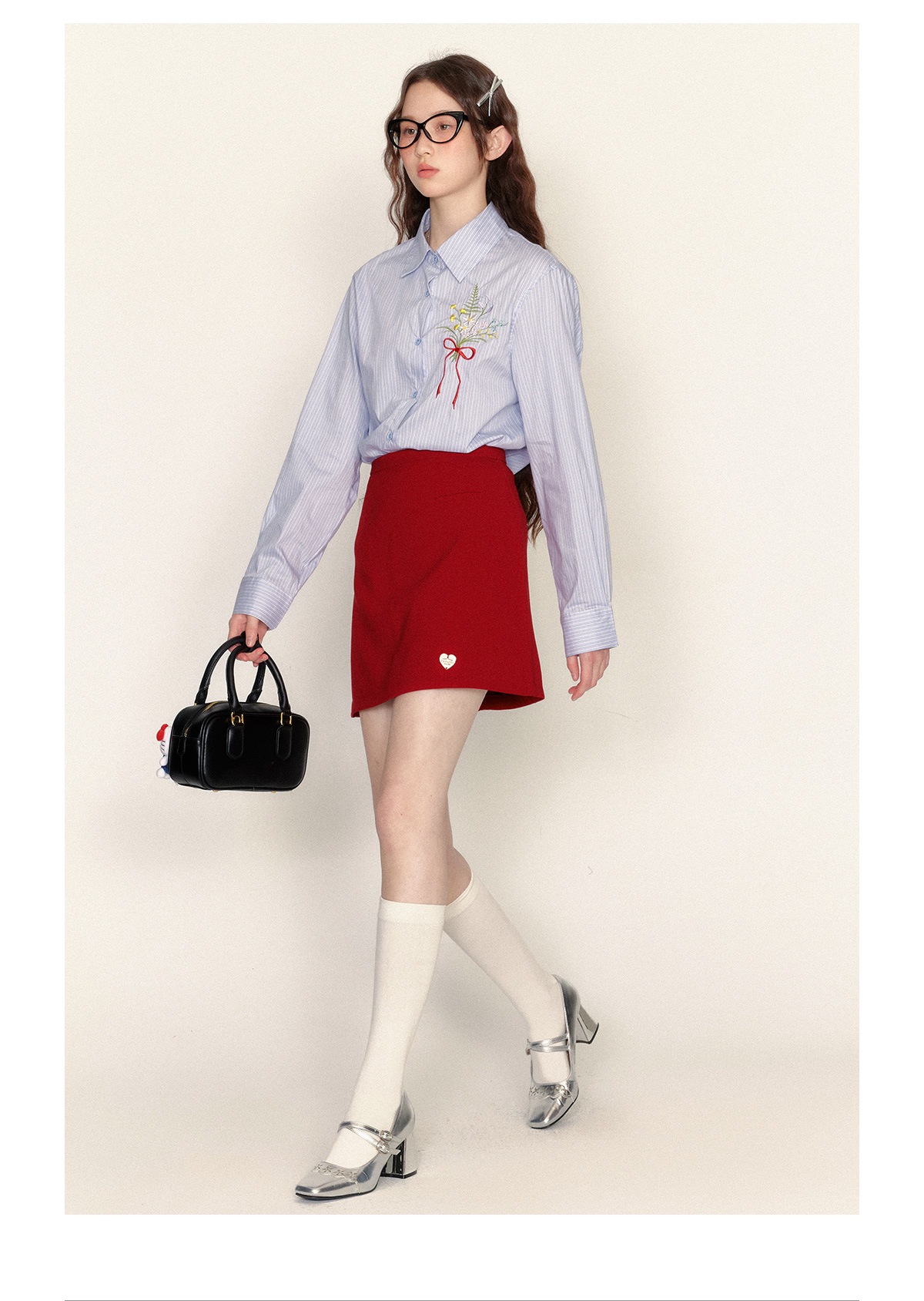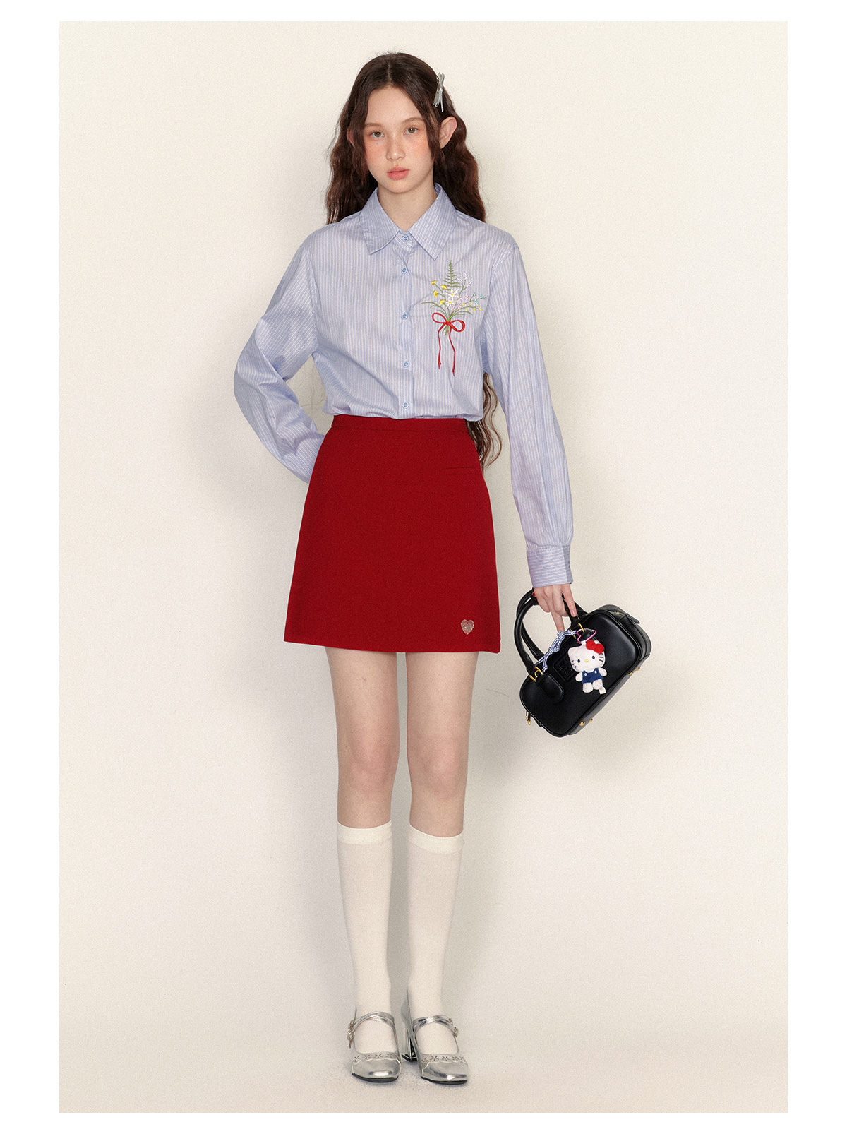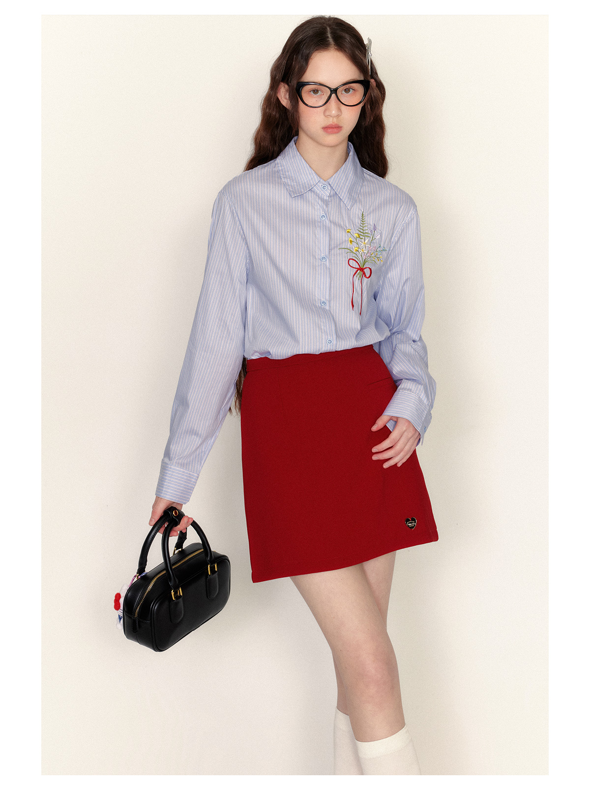 Floral Embroidery Striped Long Sleeve Shirt & Pleated Skirt Setup NA7037