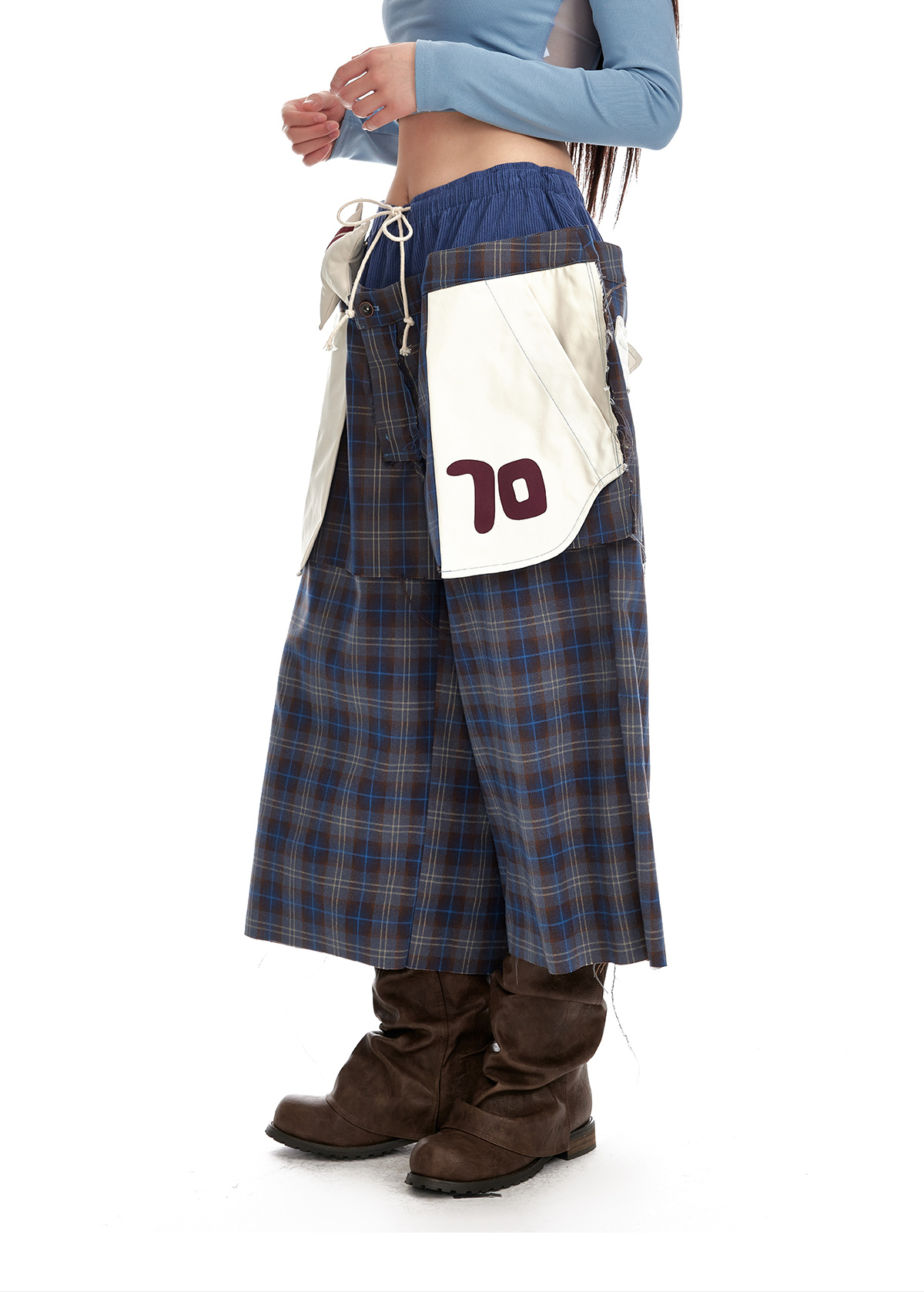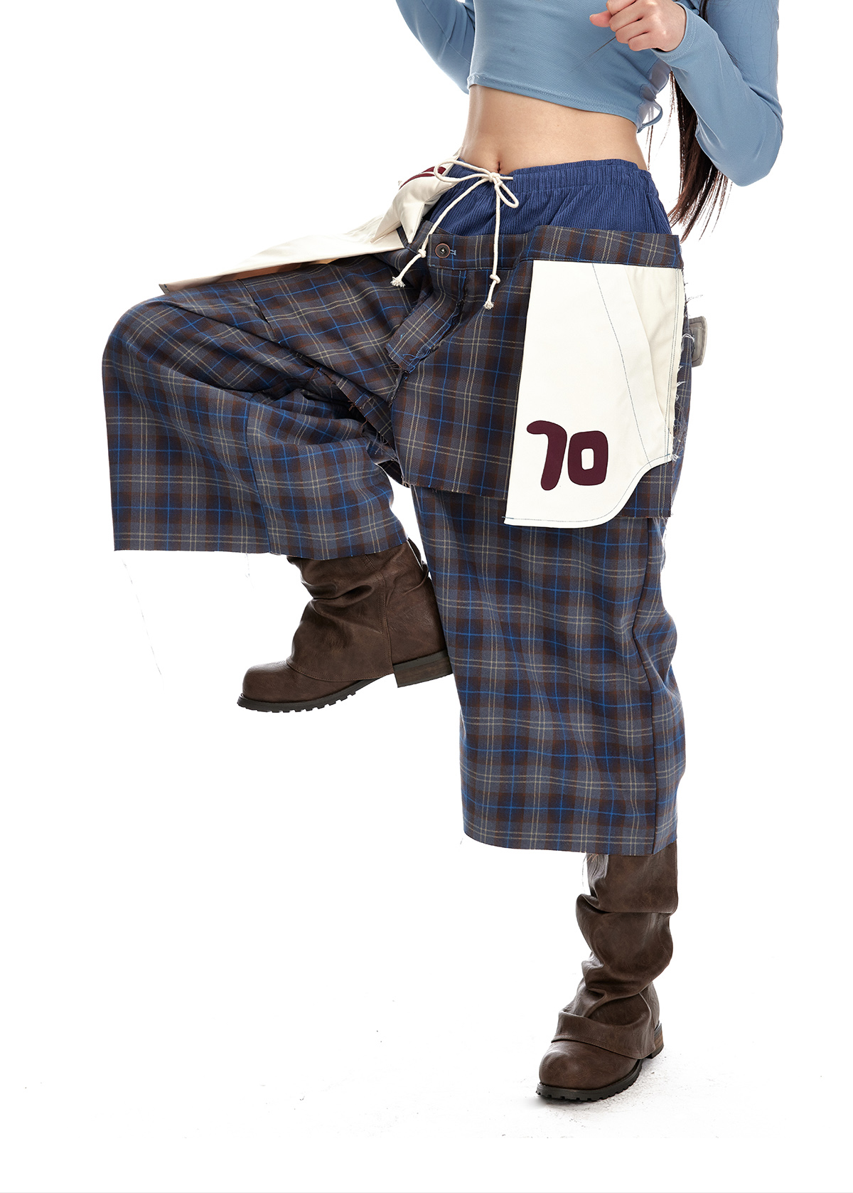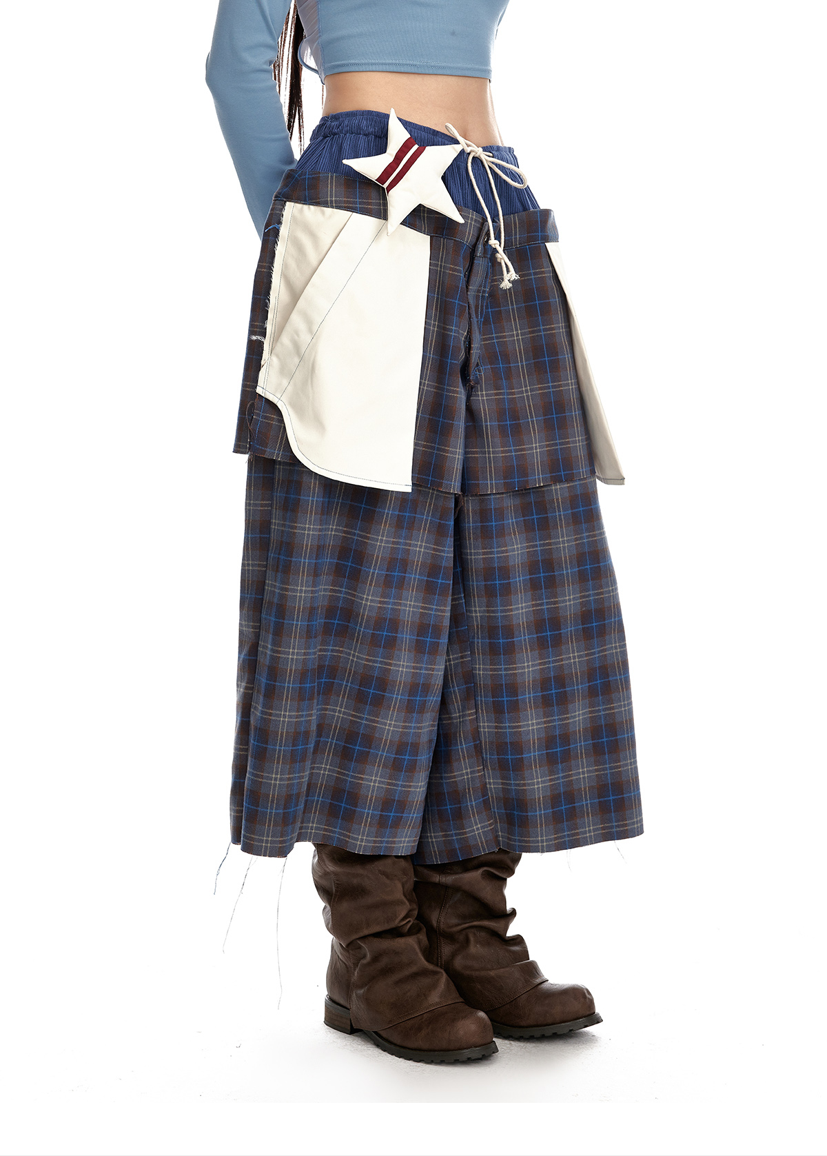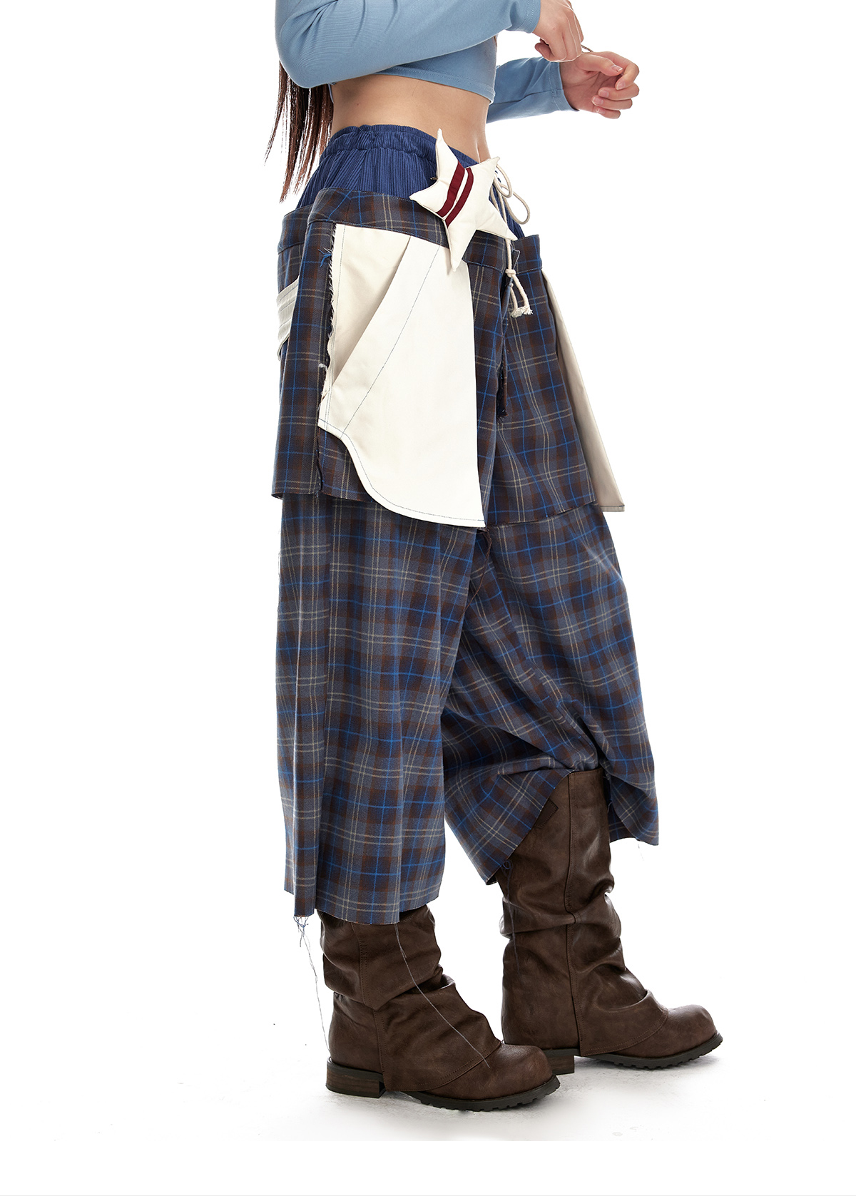 Plaid Fabric Fake Layered Patchwork Wide-Leg Pants NA7071