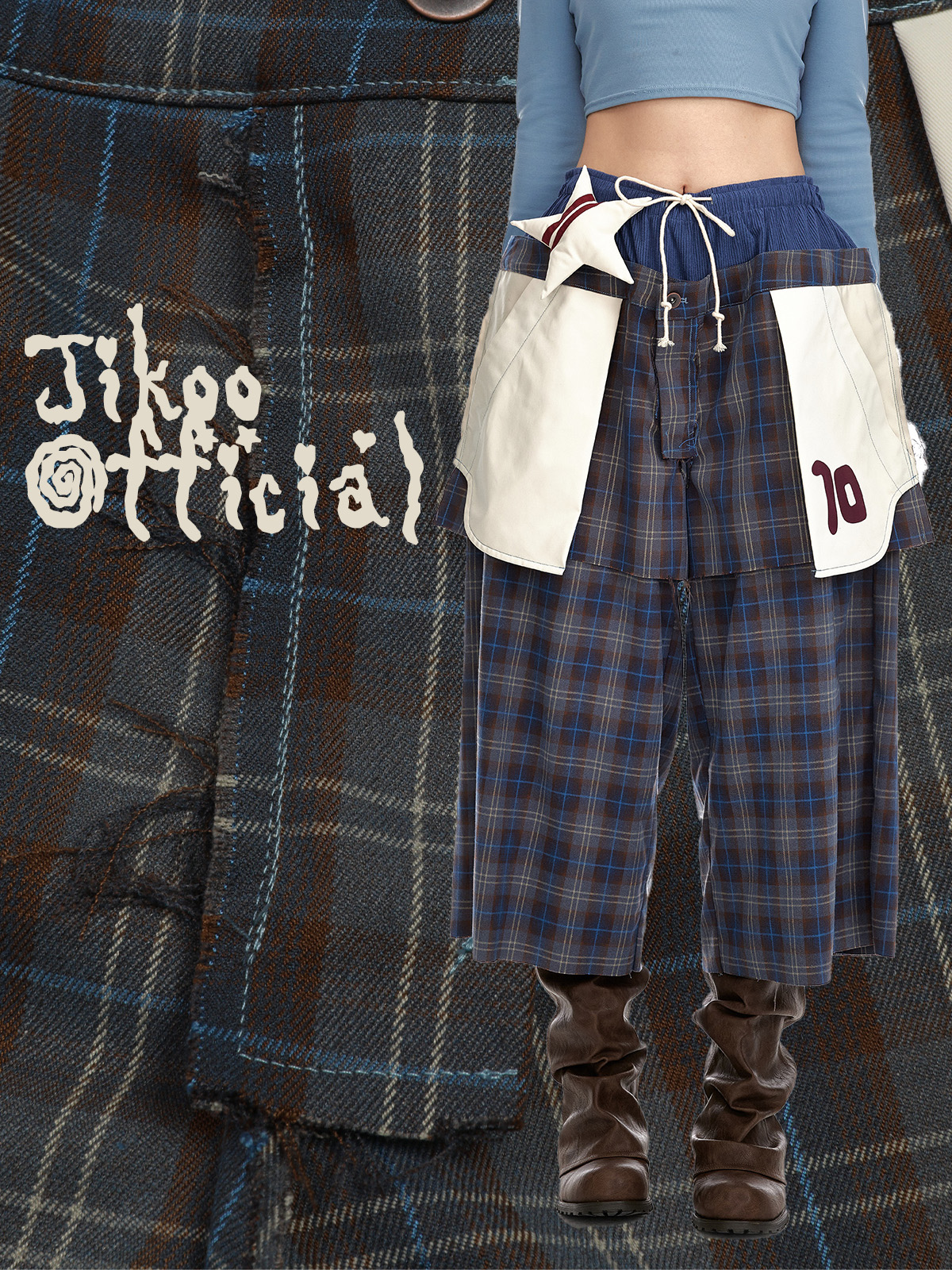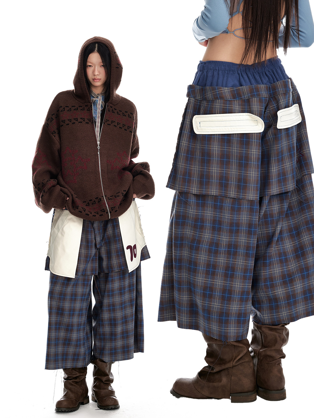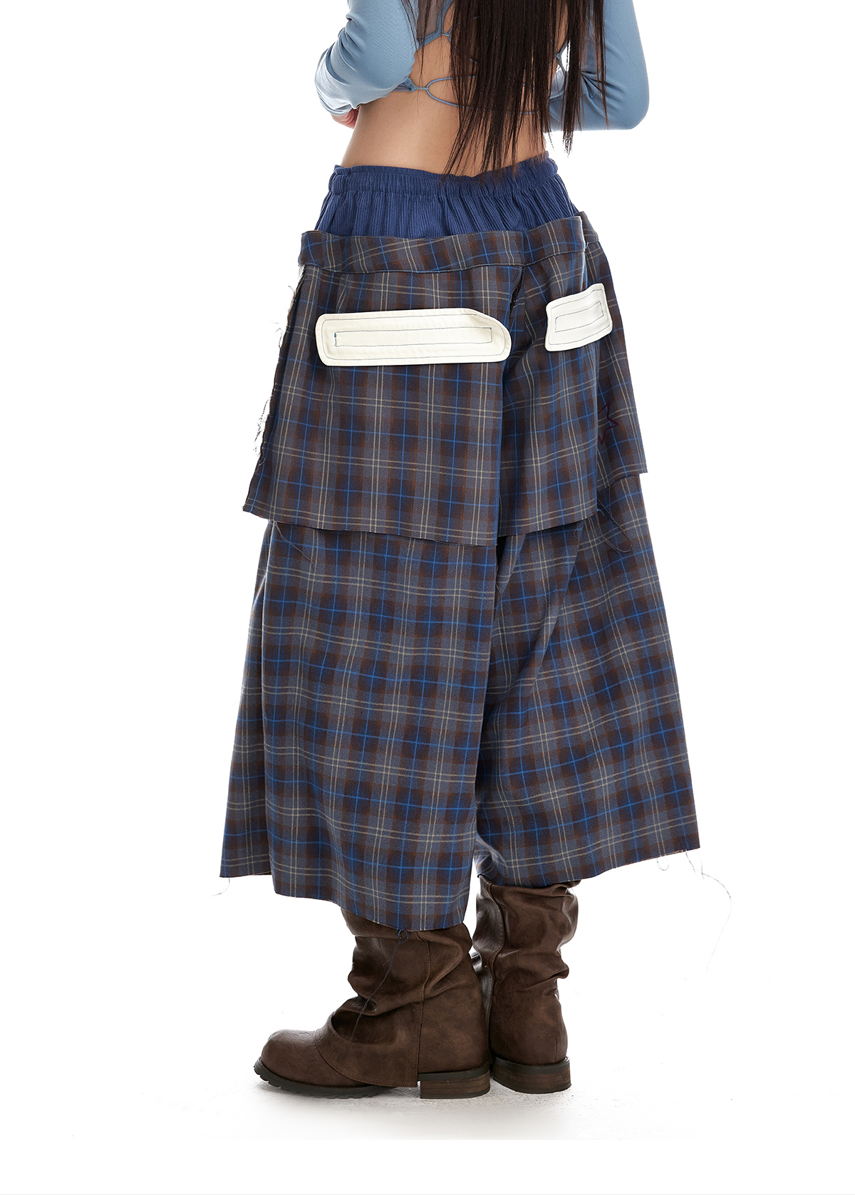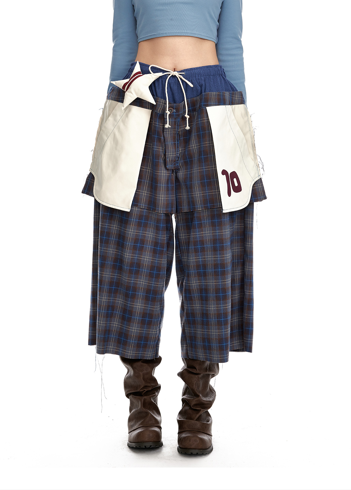 Plaid Fabric Fake Layered Patchwork Wide-Leg Pants NA7071