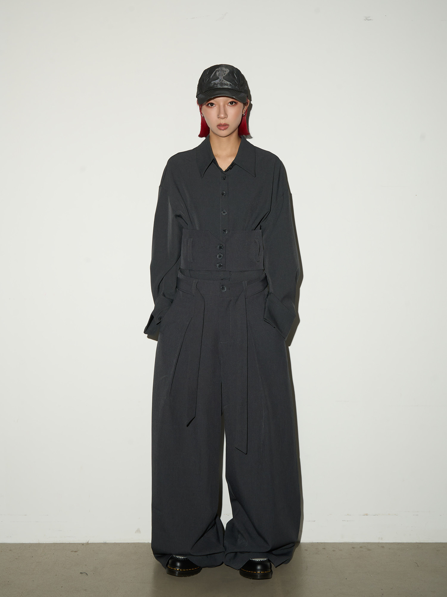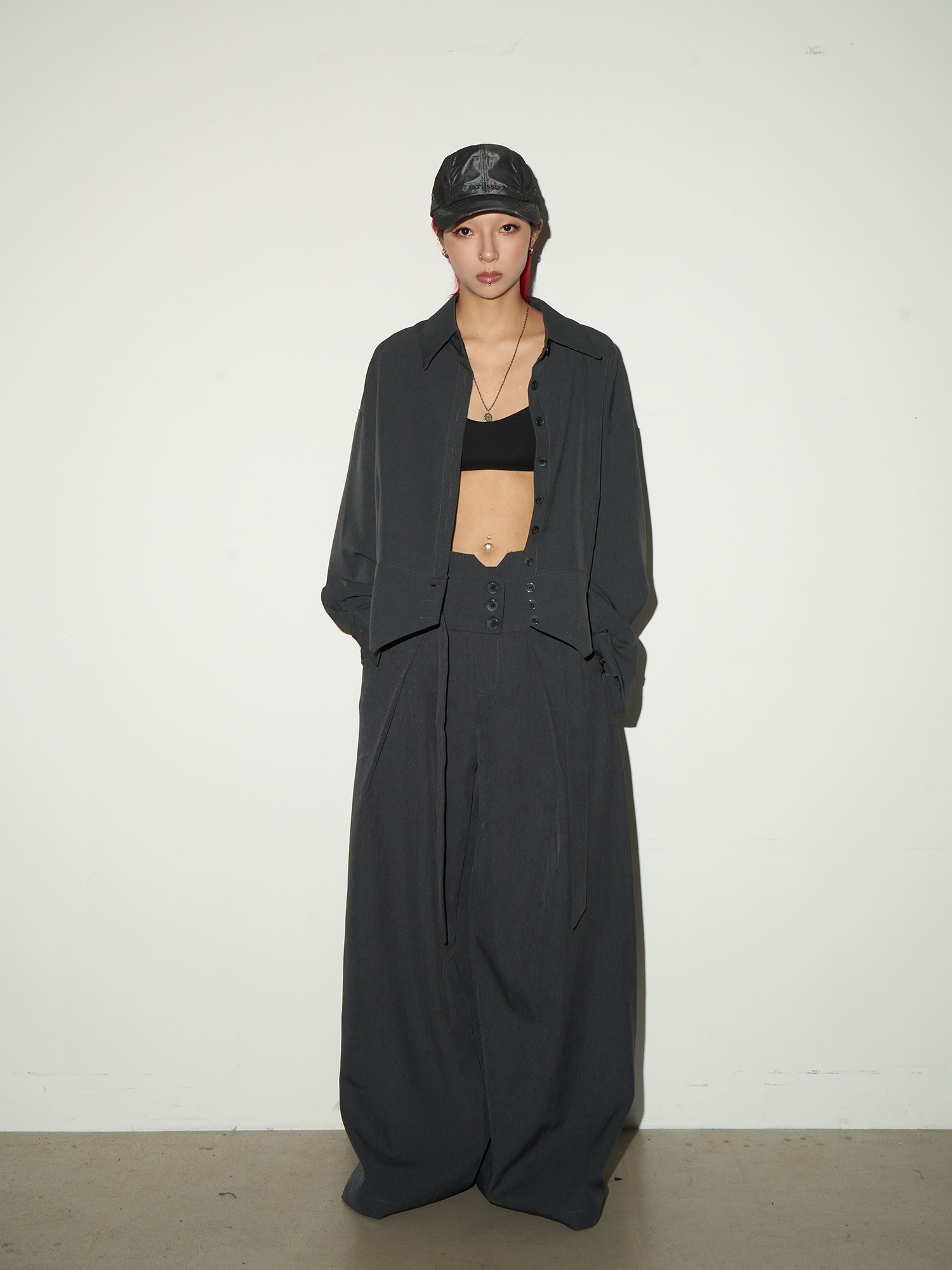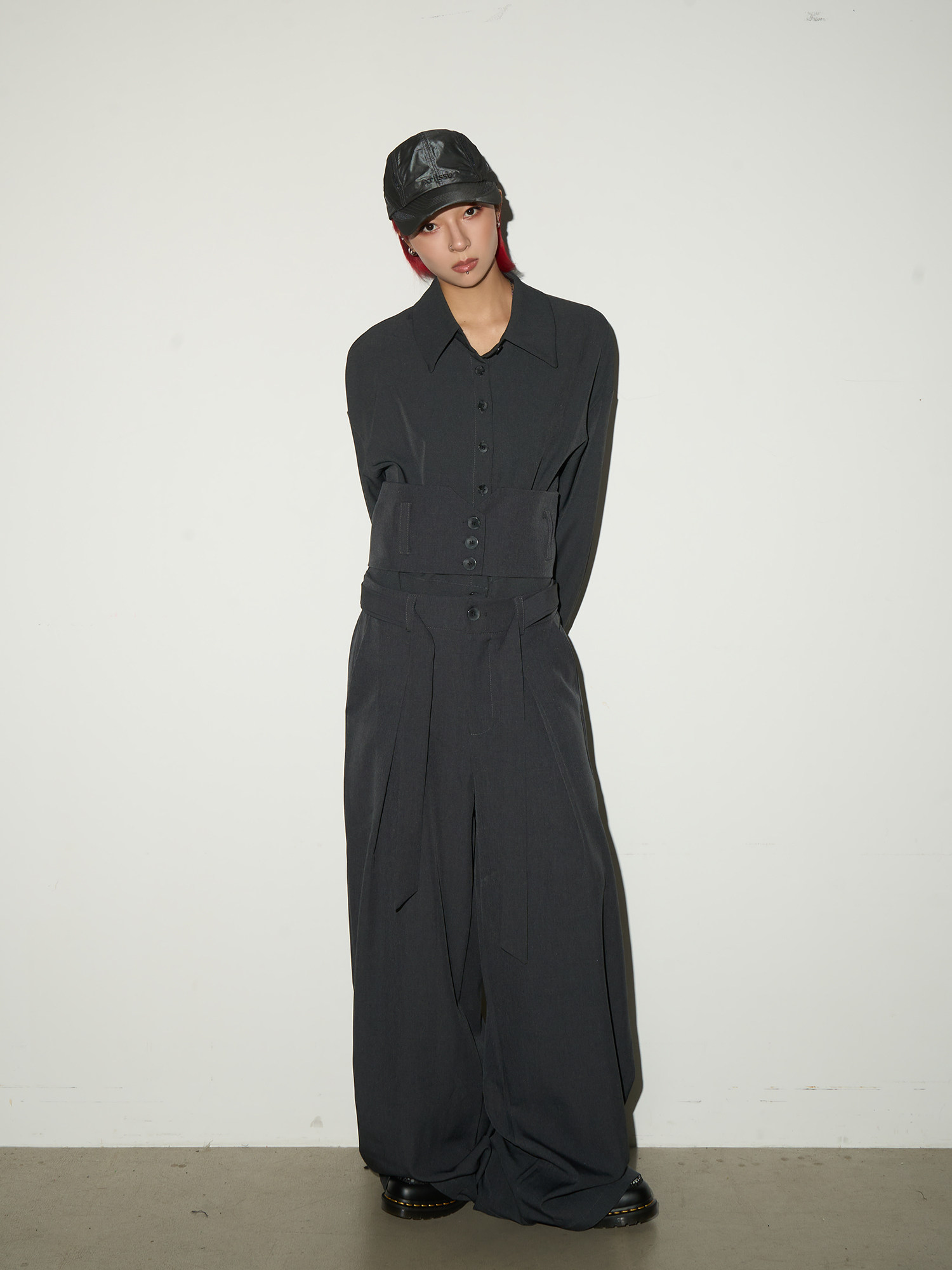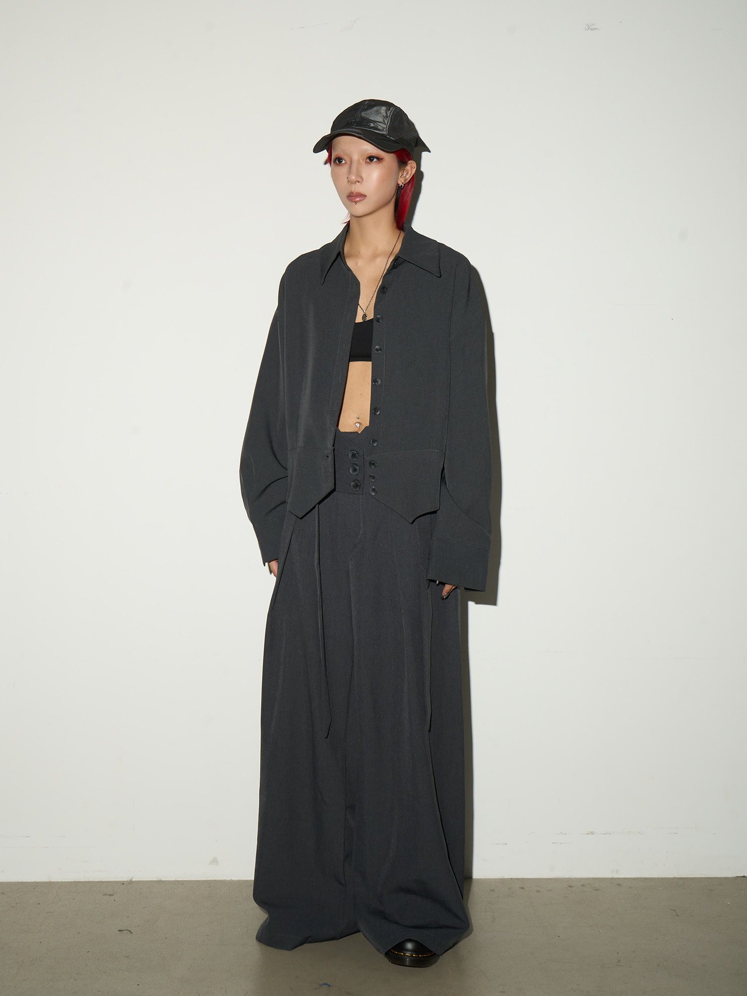 Button Front Long Sleeve Shirt & Pleats Wide Leg Trousers Setup NA9095
