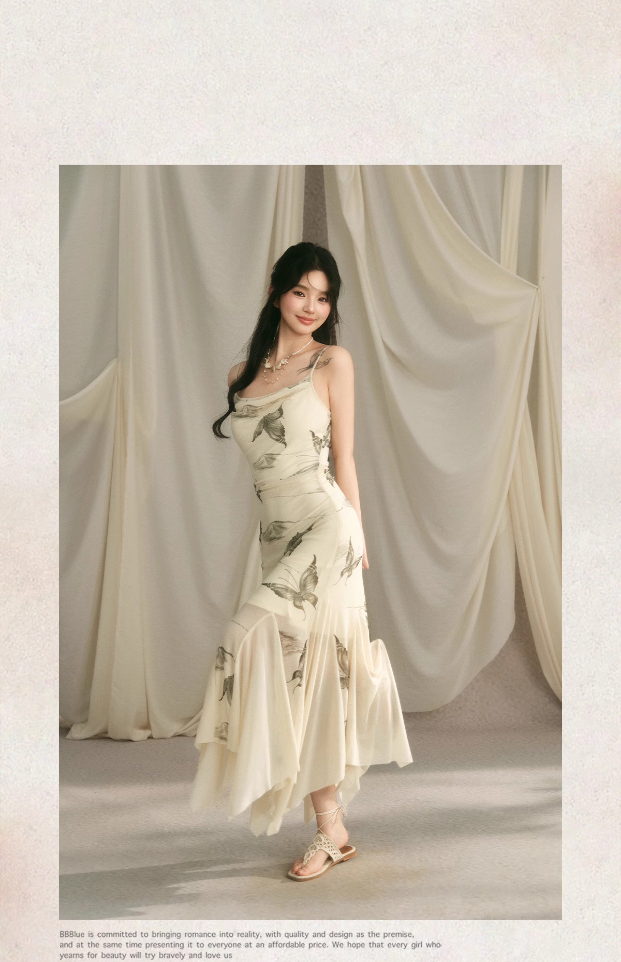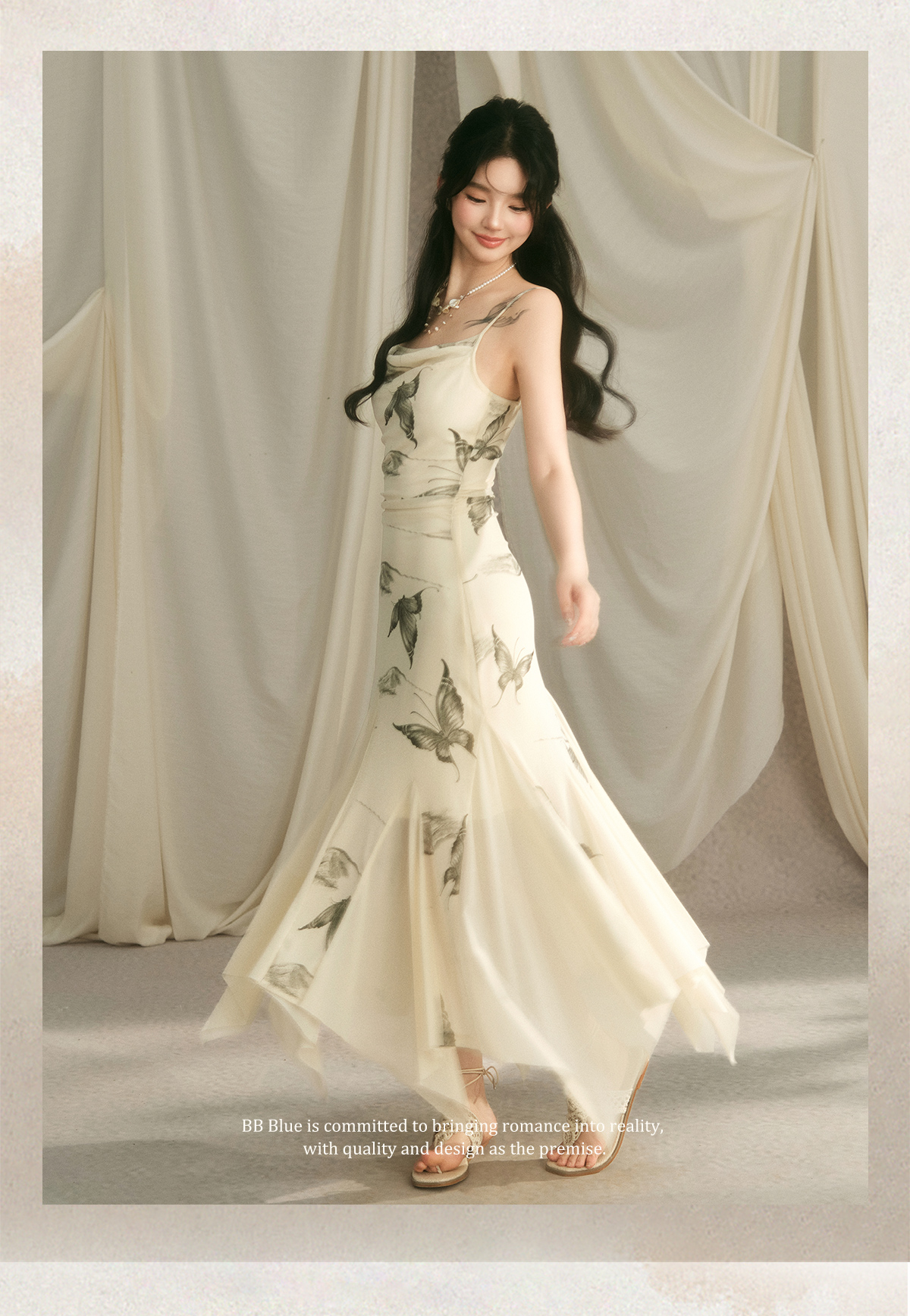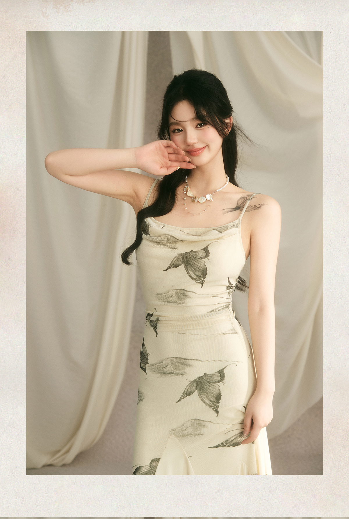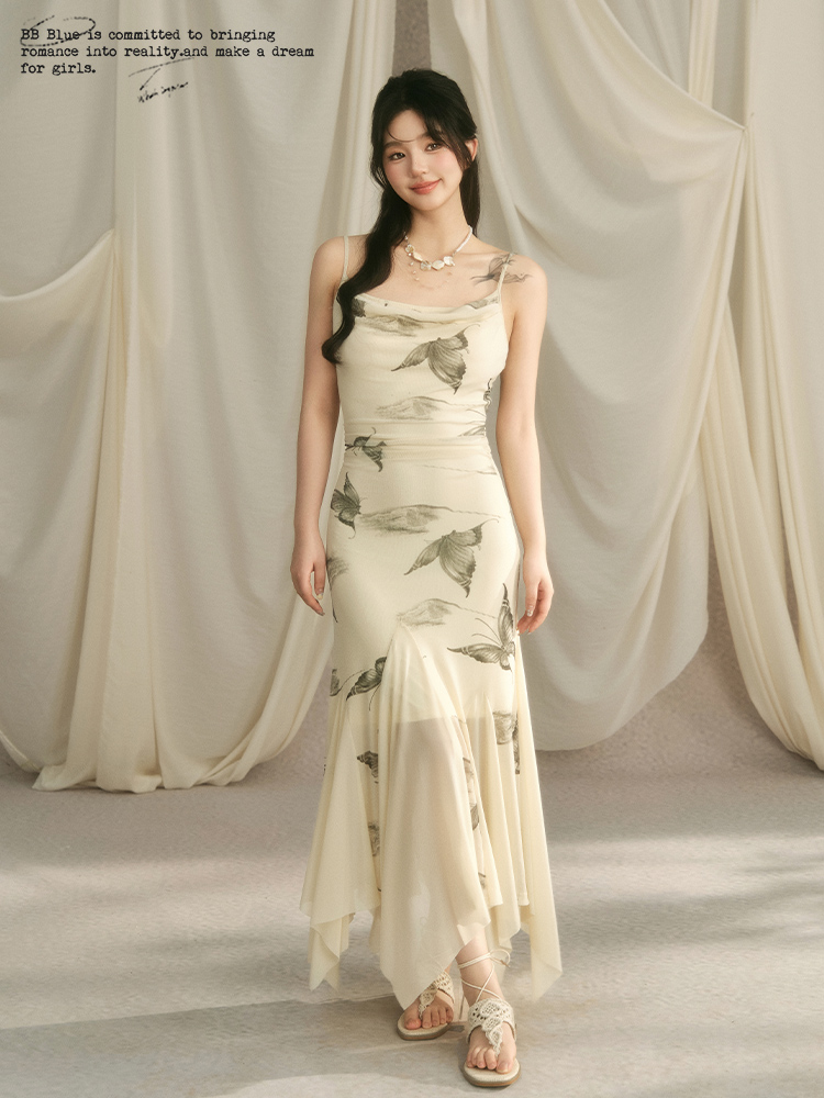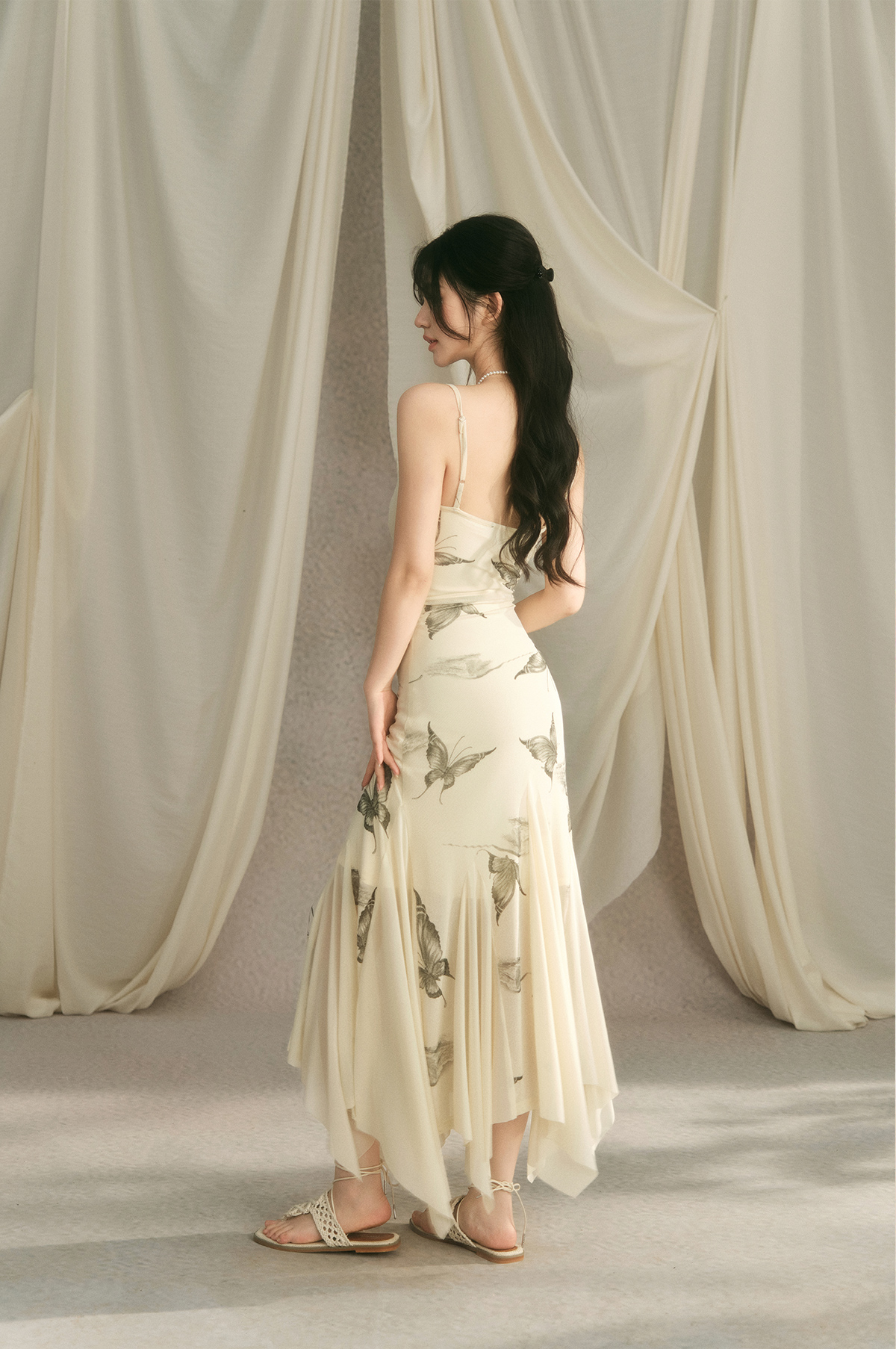 Ruched Waist Butterfly Print Mermaid Camisole Dress NA7486