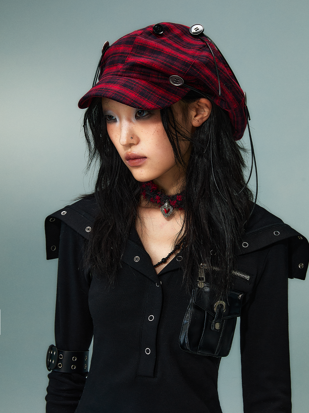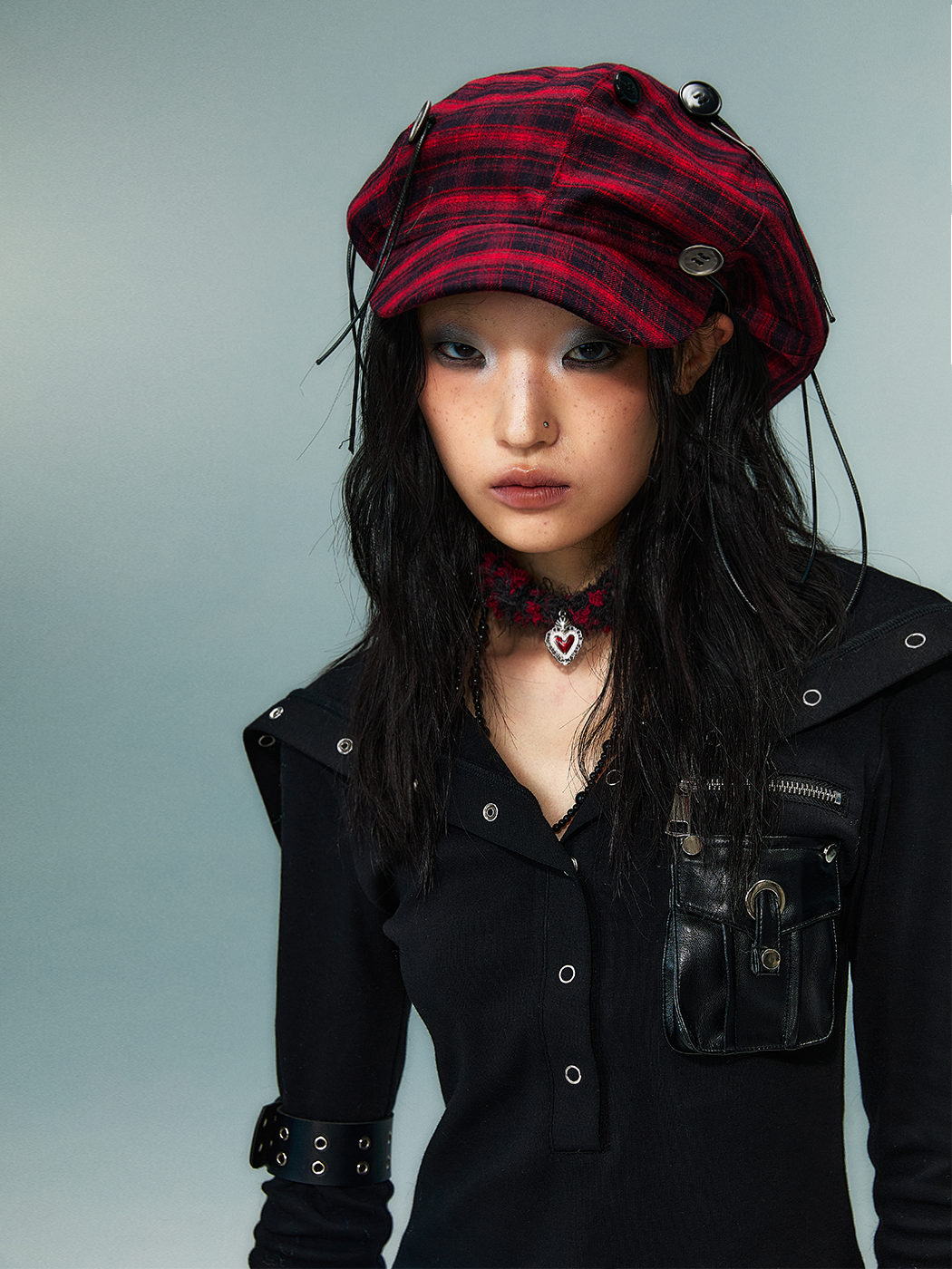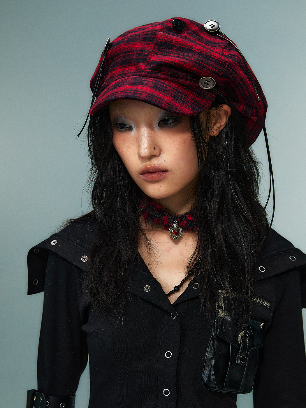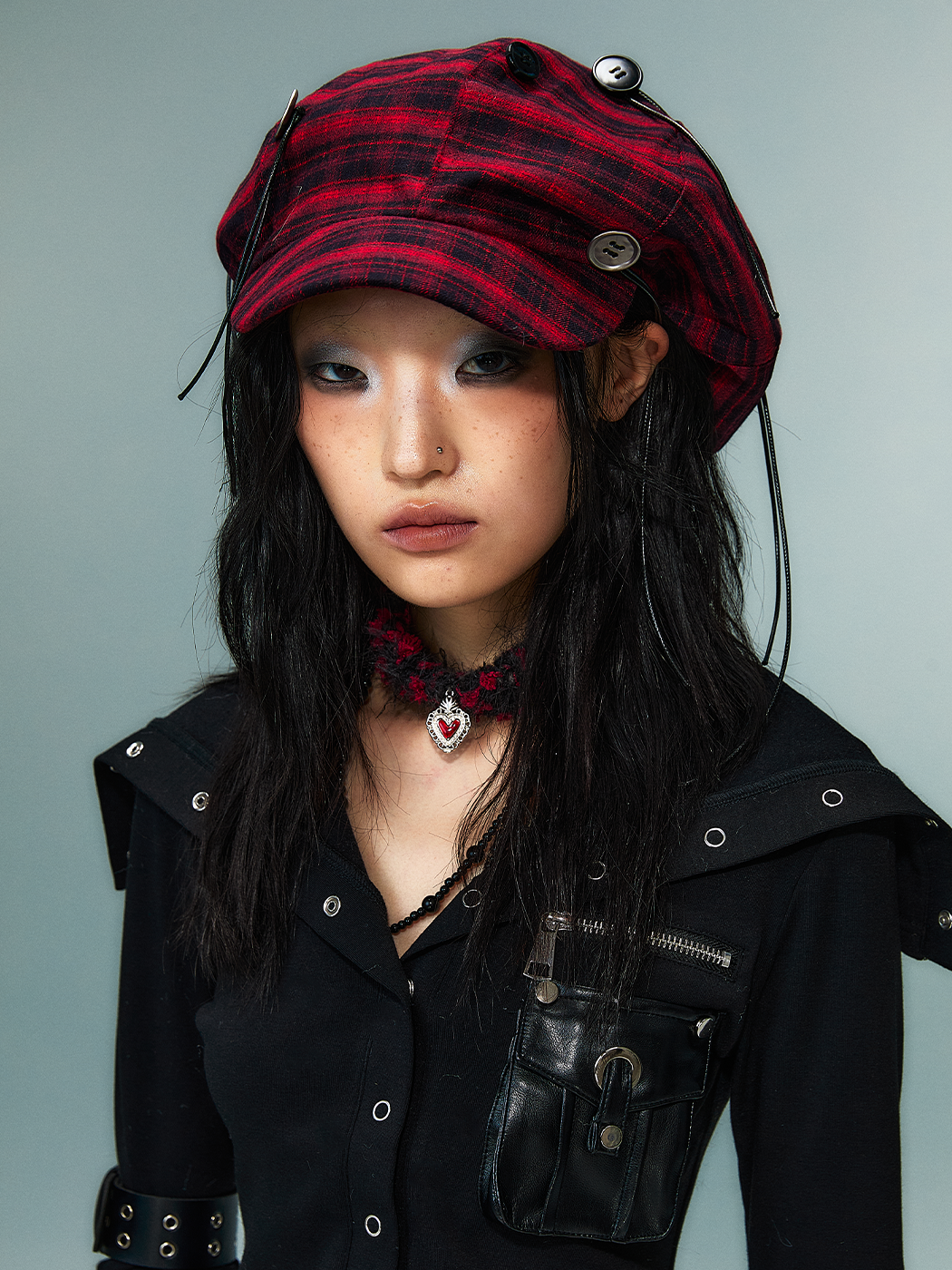Handcrafted Button Strap Red Plaid Beret Hat NA8136