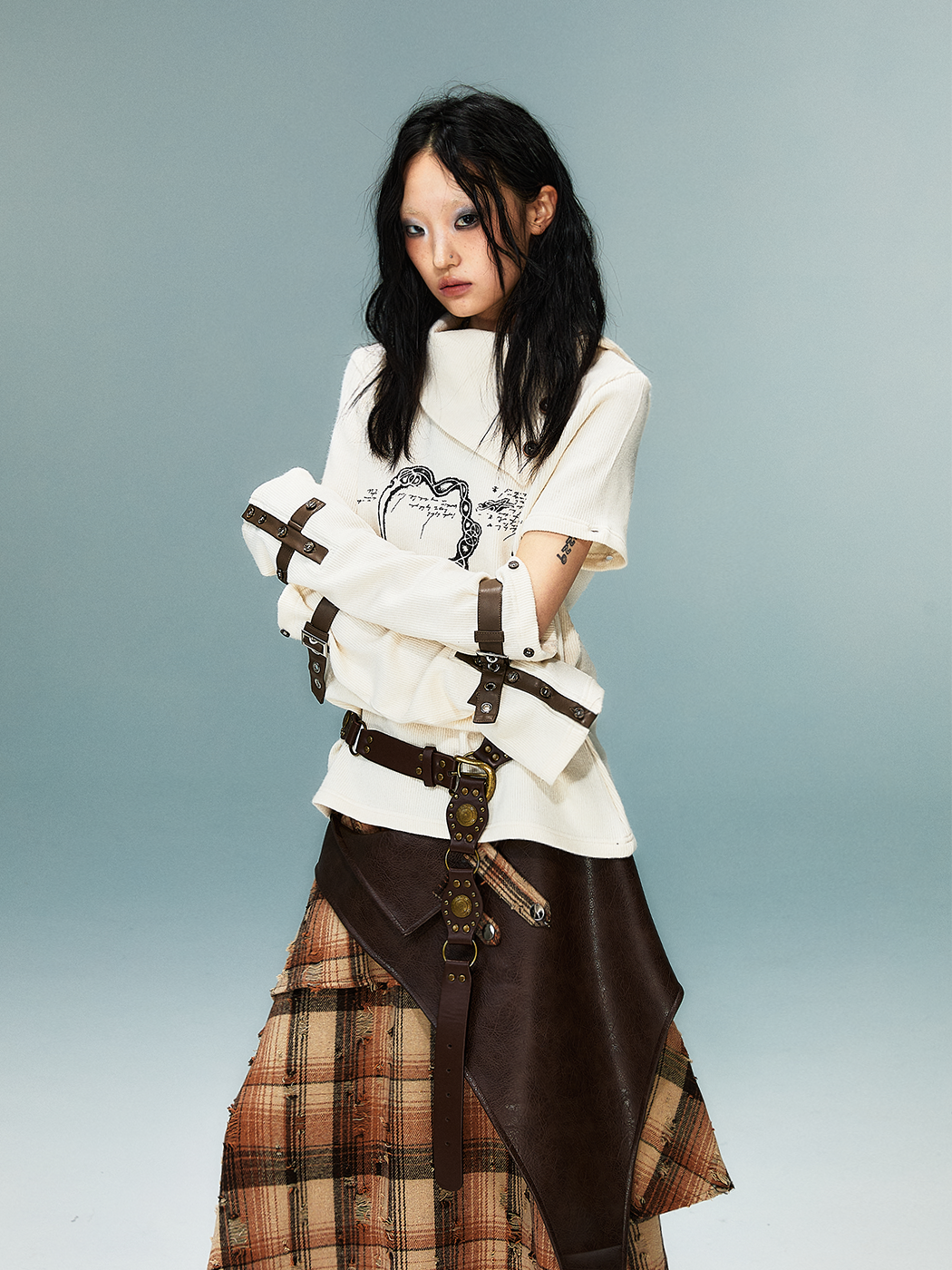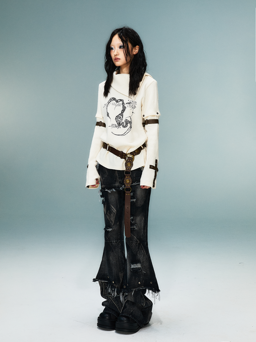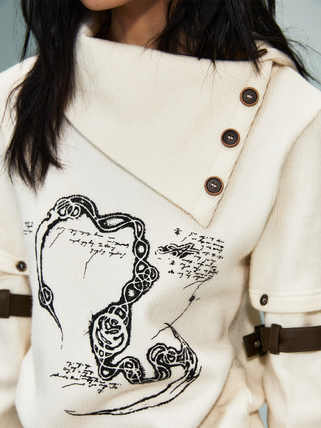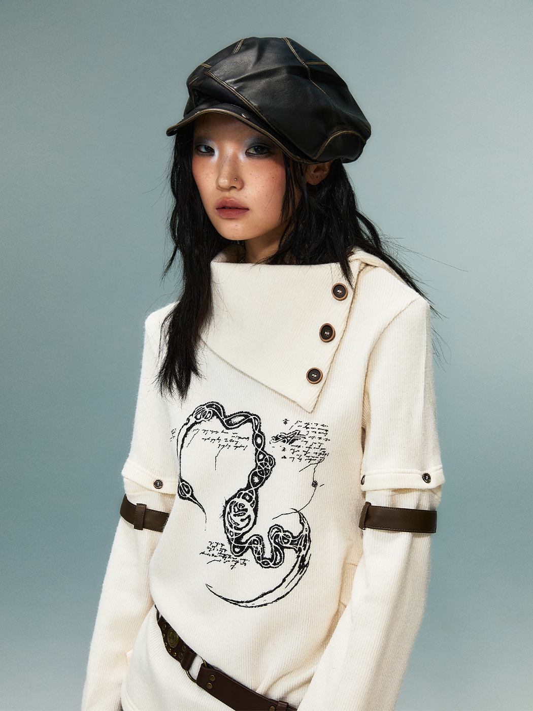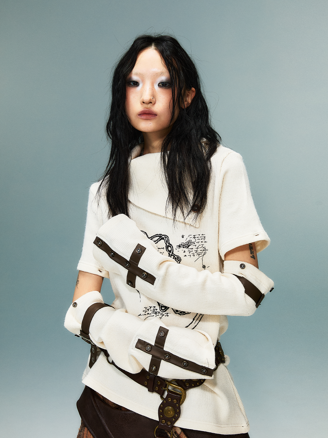 Cross Print Detachable Sleeve Knit Sweater with Belt NA8181