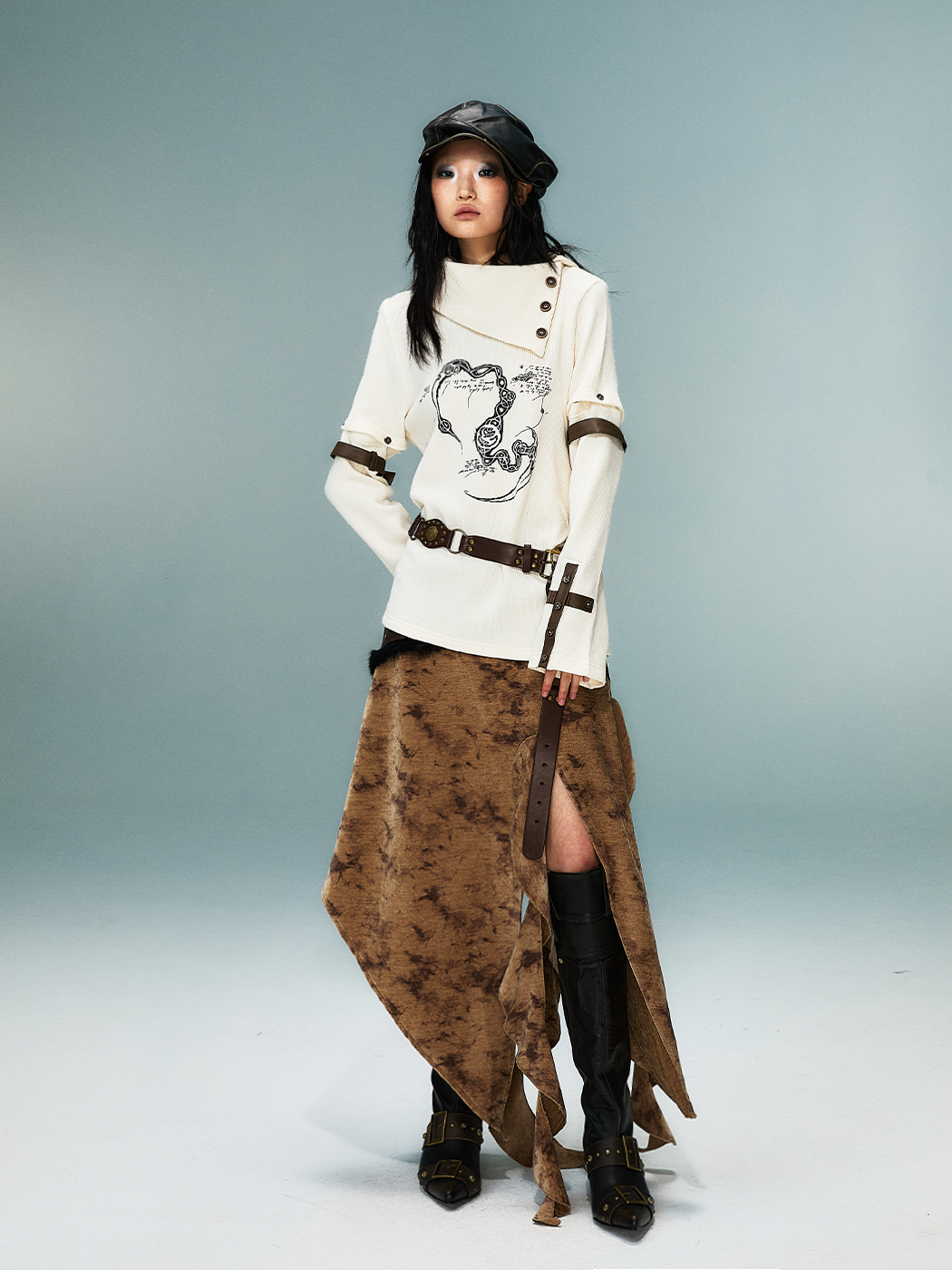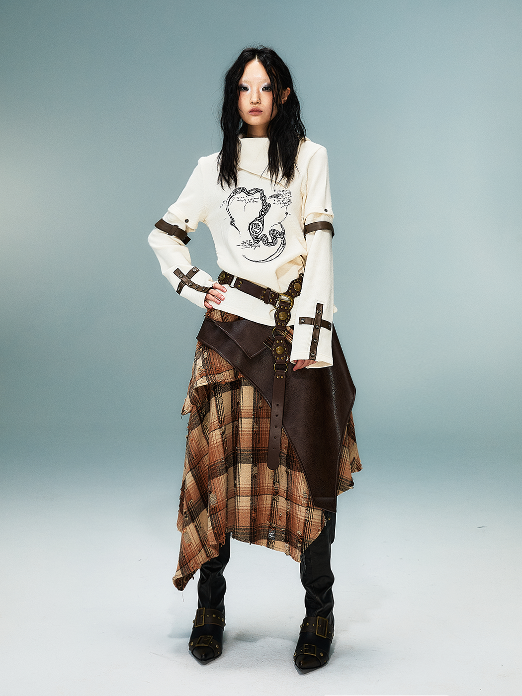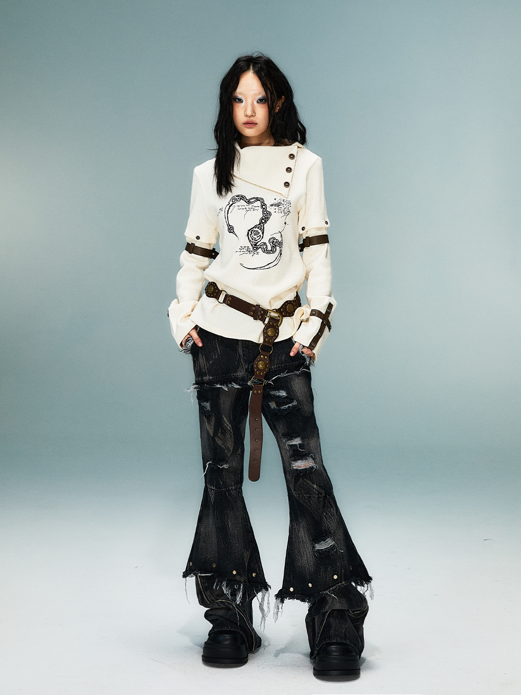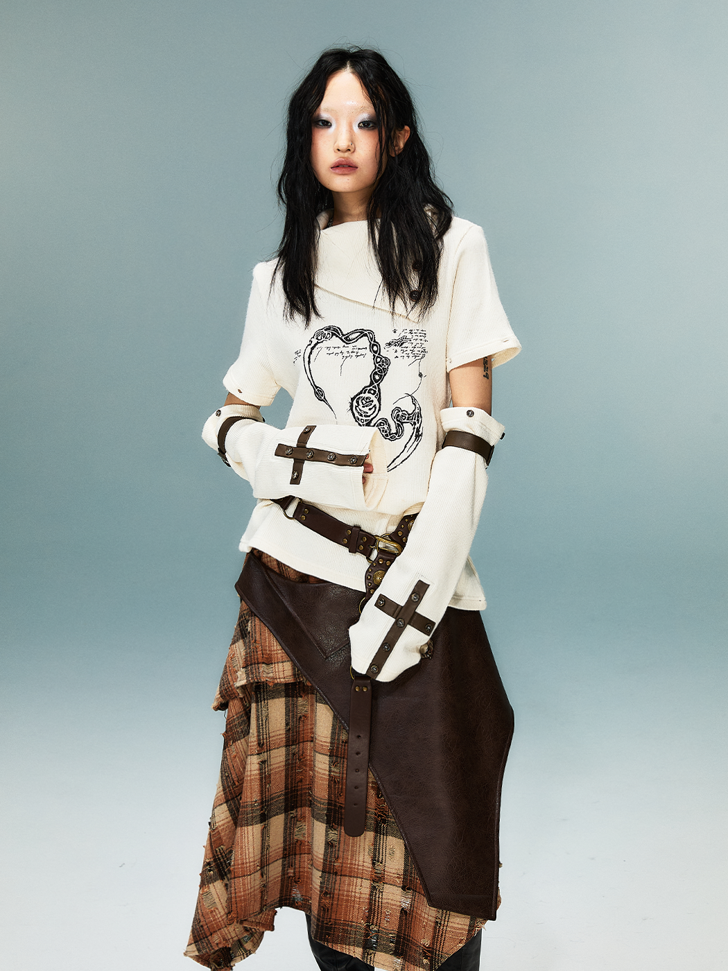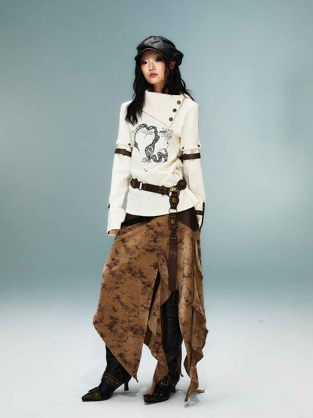 Cross Print Detachable Sleeve Knit Sweater with Belt NA8181