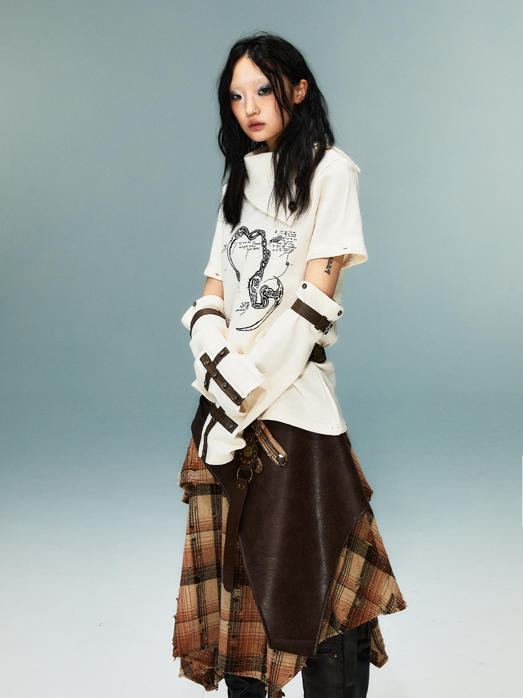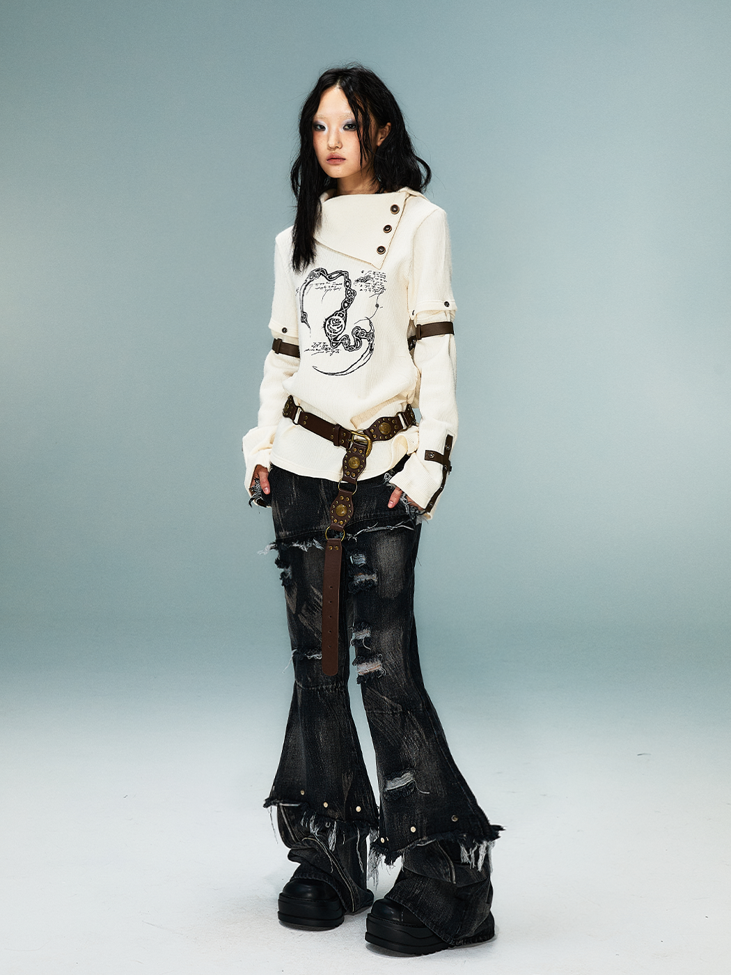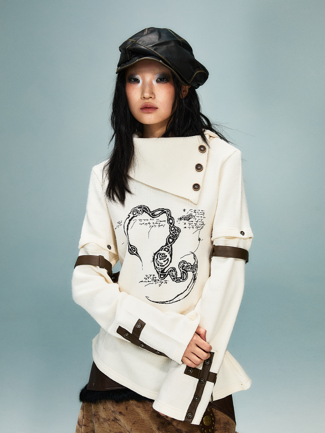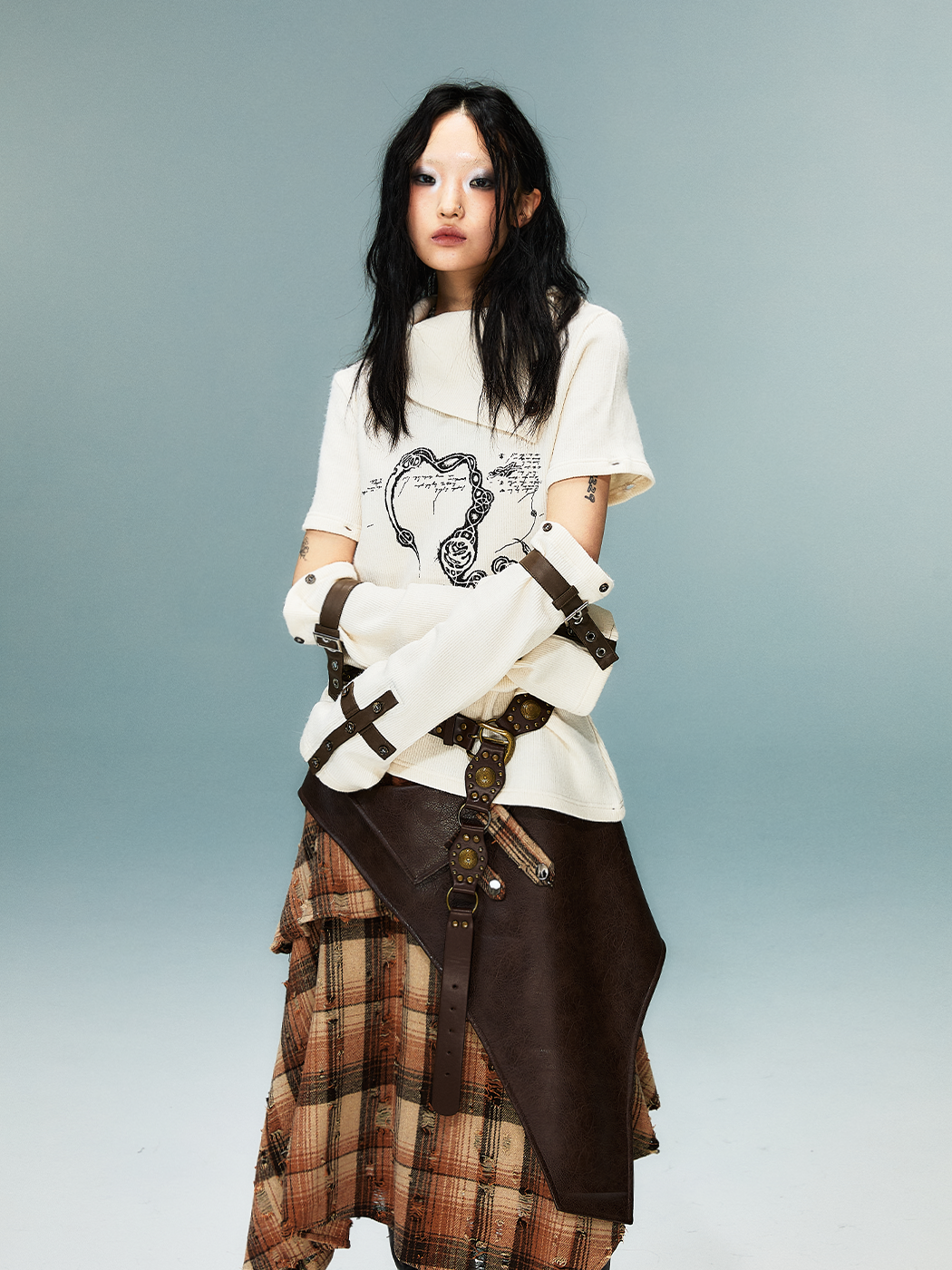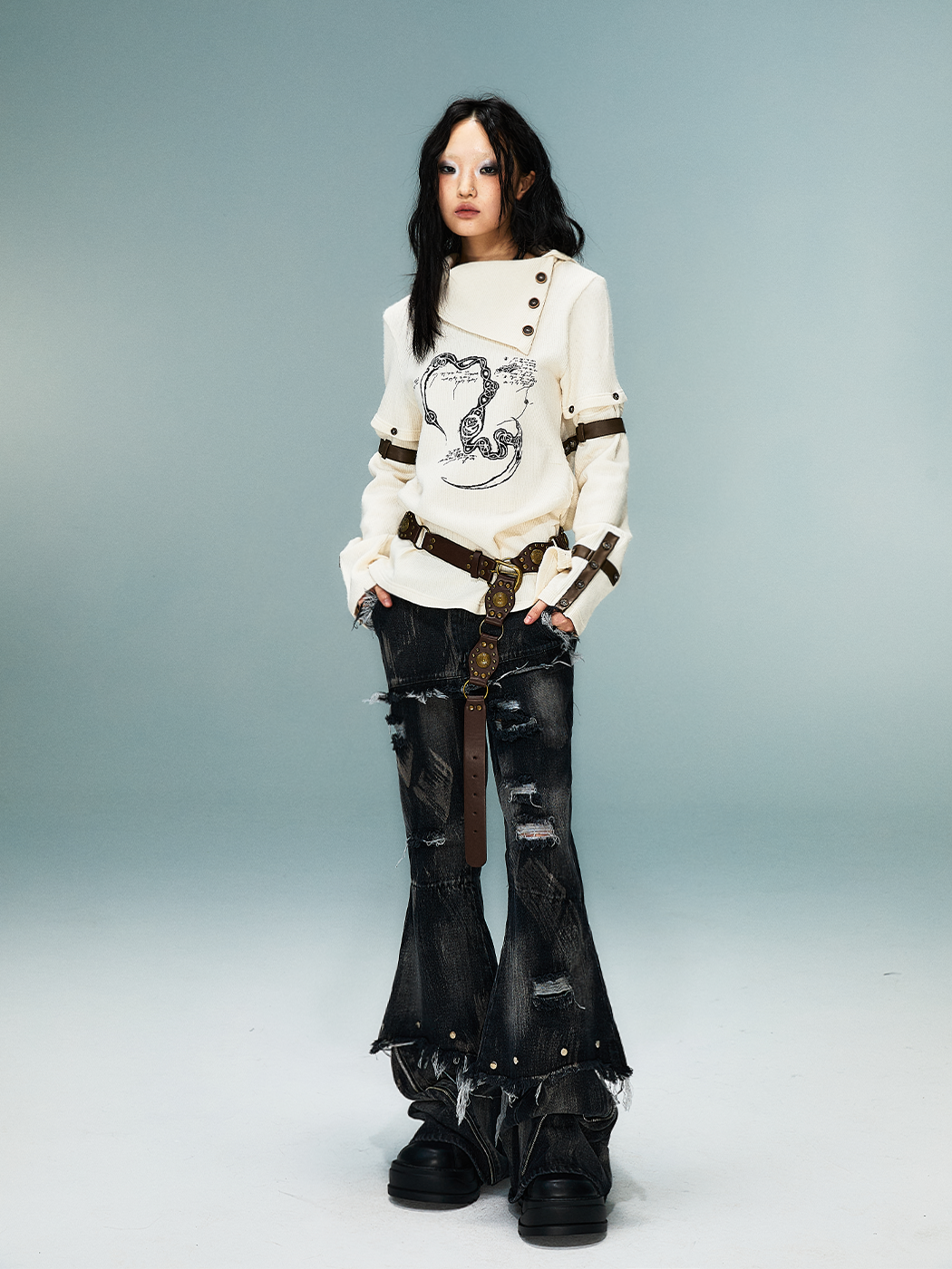 Cross Print Detachable Sleeve Knit Sweater with Belt NA8181