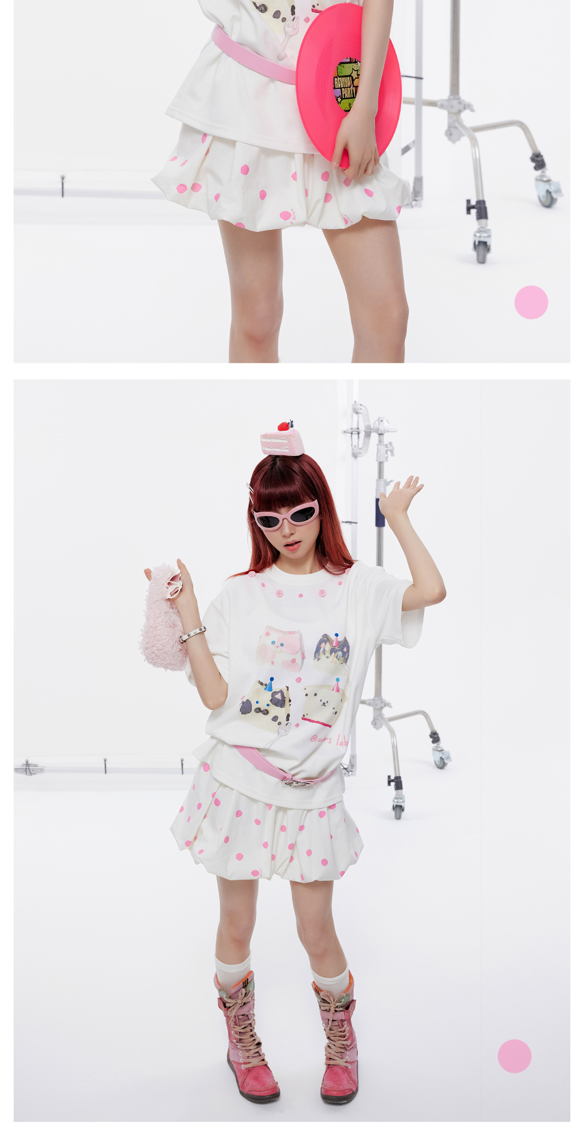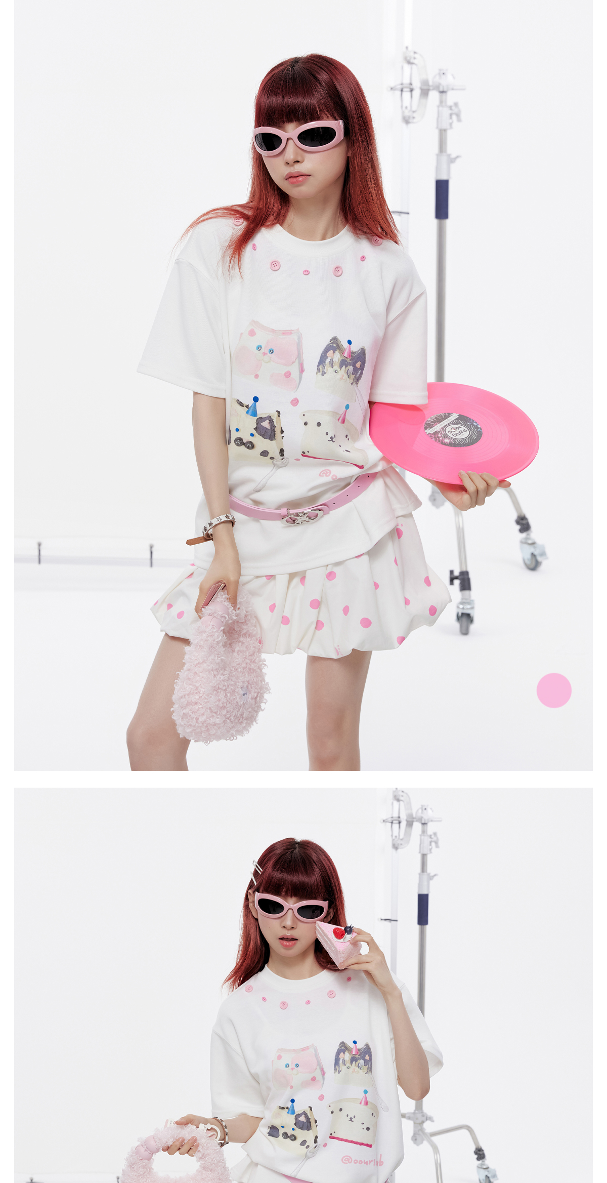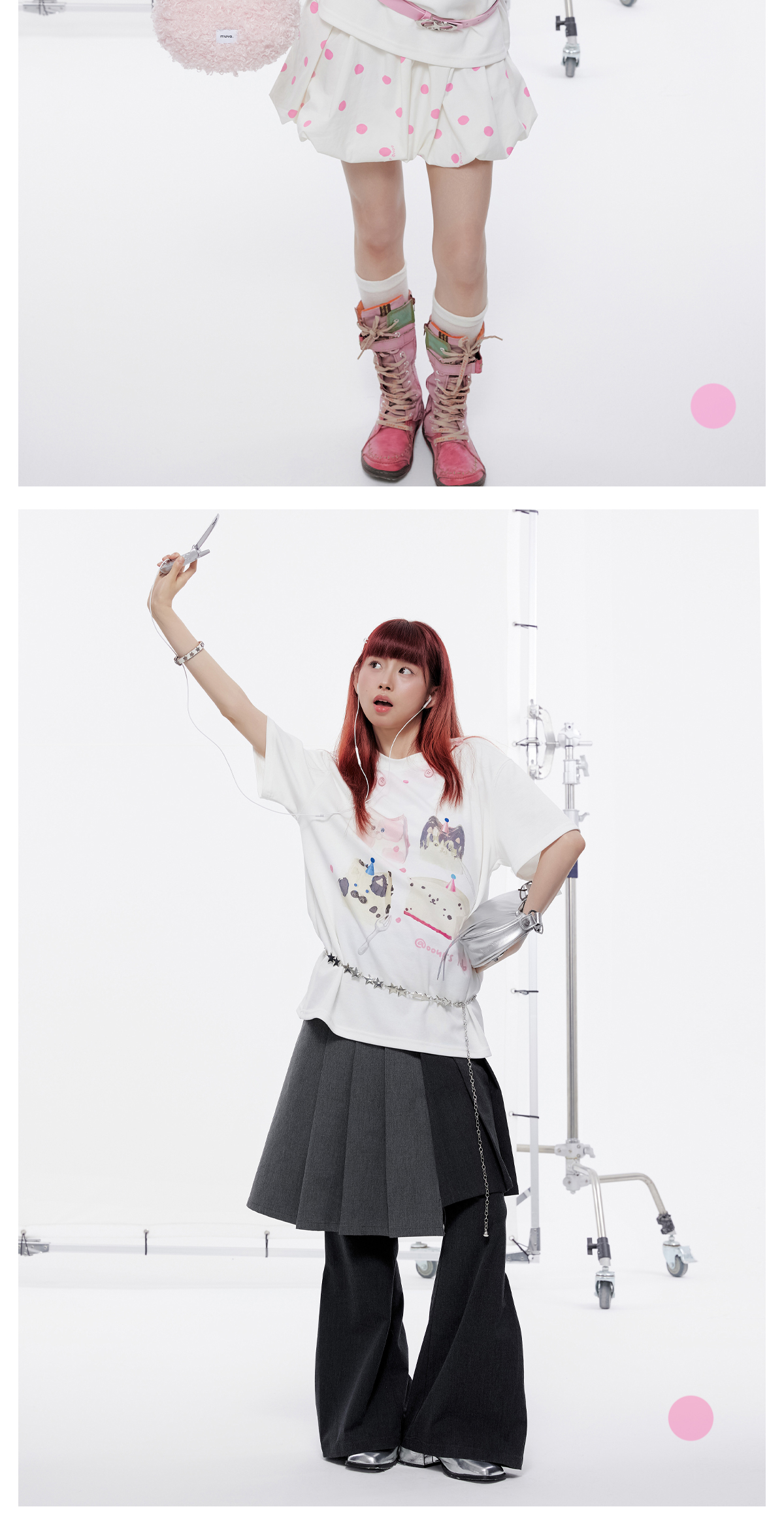 Cat Graphic Button Detail Oversize Short Sleeve T-Shirt & Belt NA8203