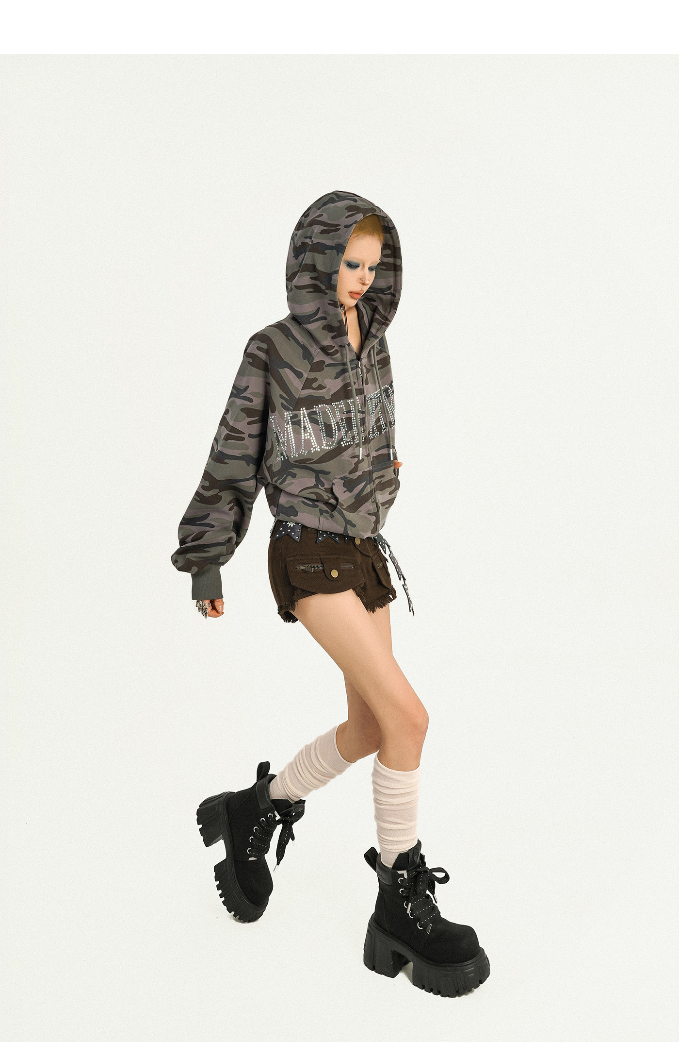 Camouflage Rhinestone Letter Oversize Zipper Hoodie NA8615
