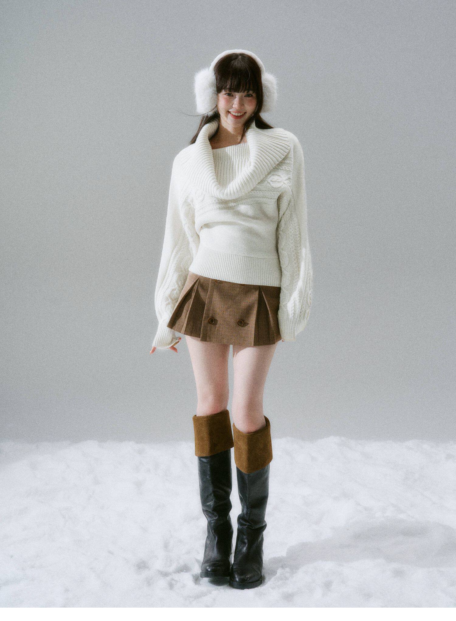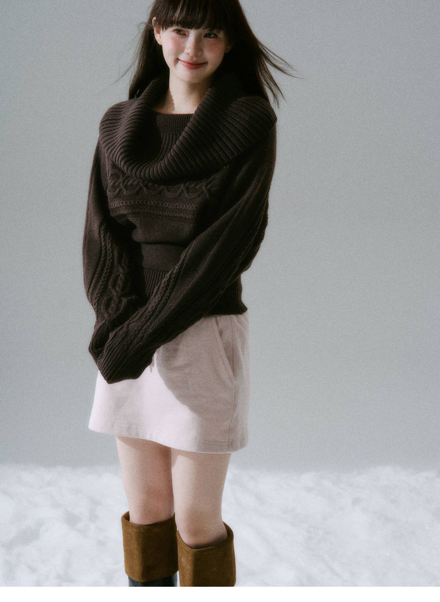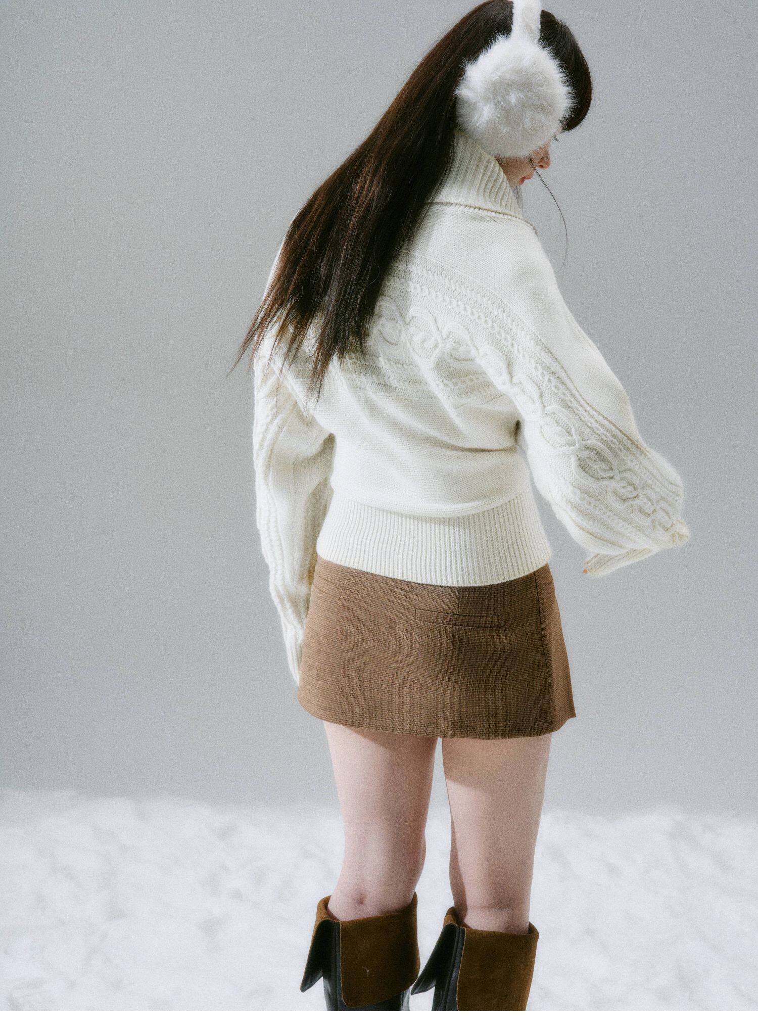 Ribbed Cowl Neck Cable Sleeve Knit Sweater NA8834