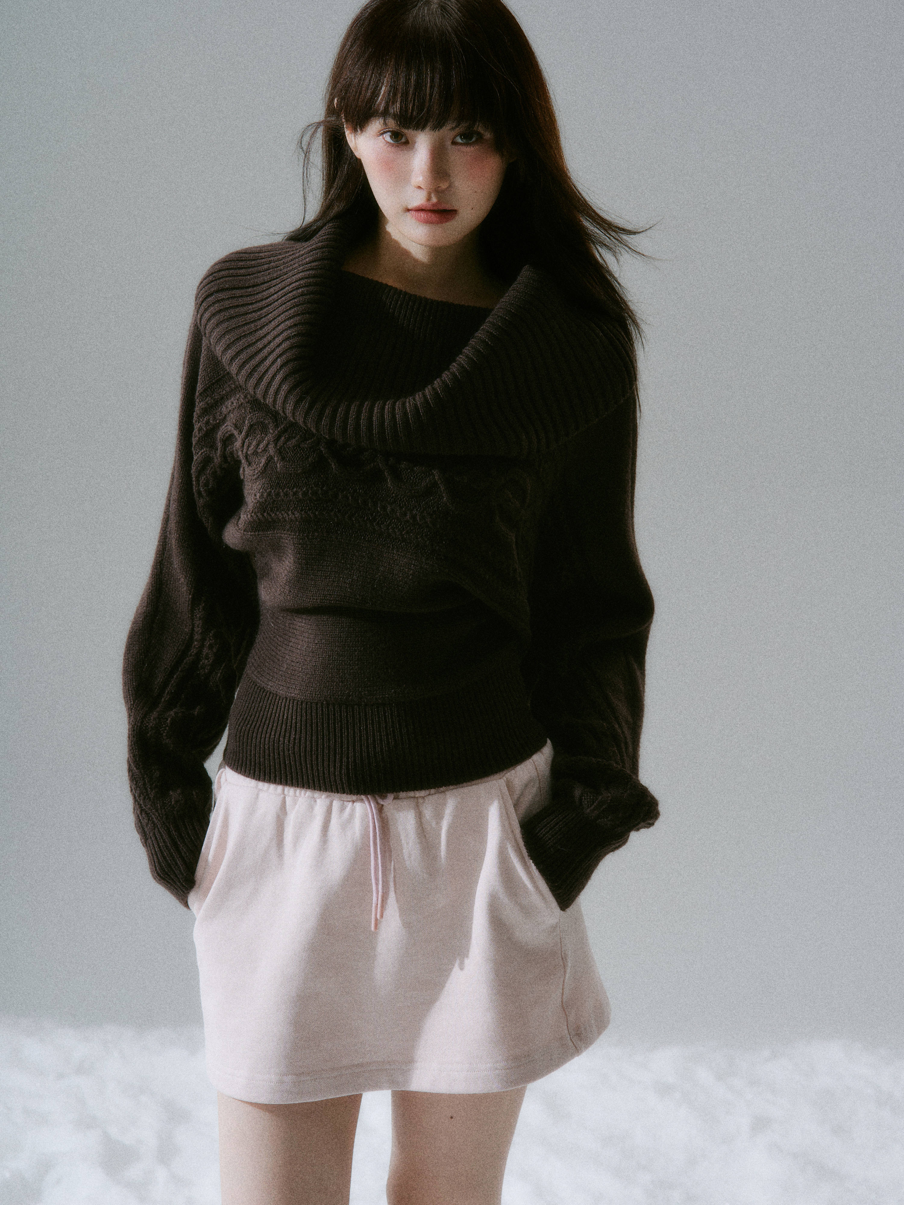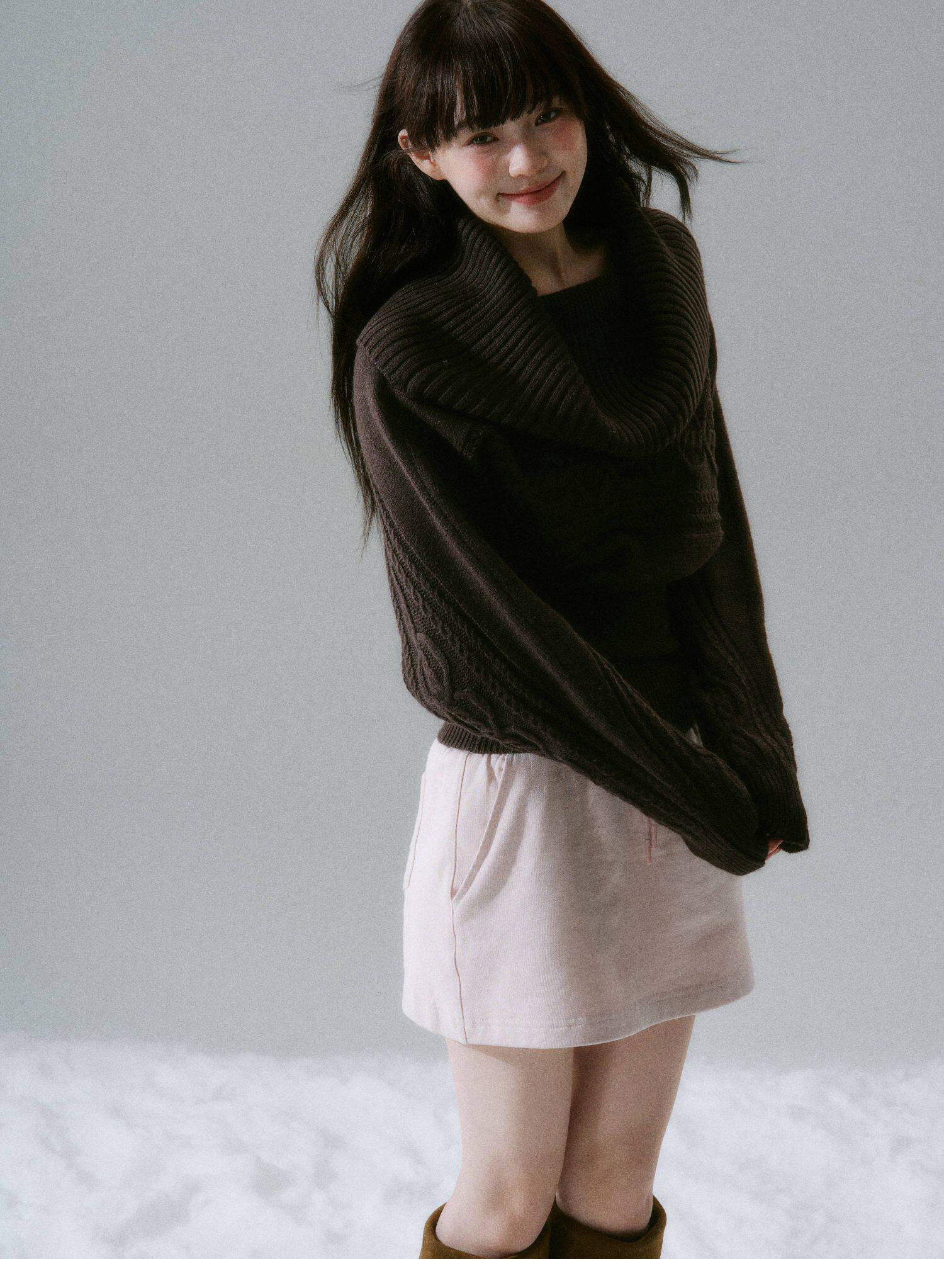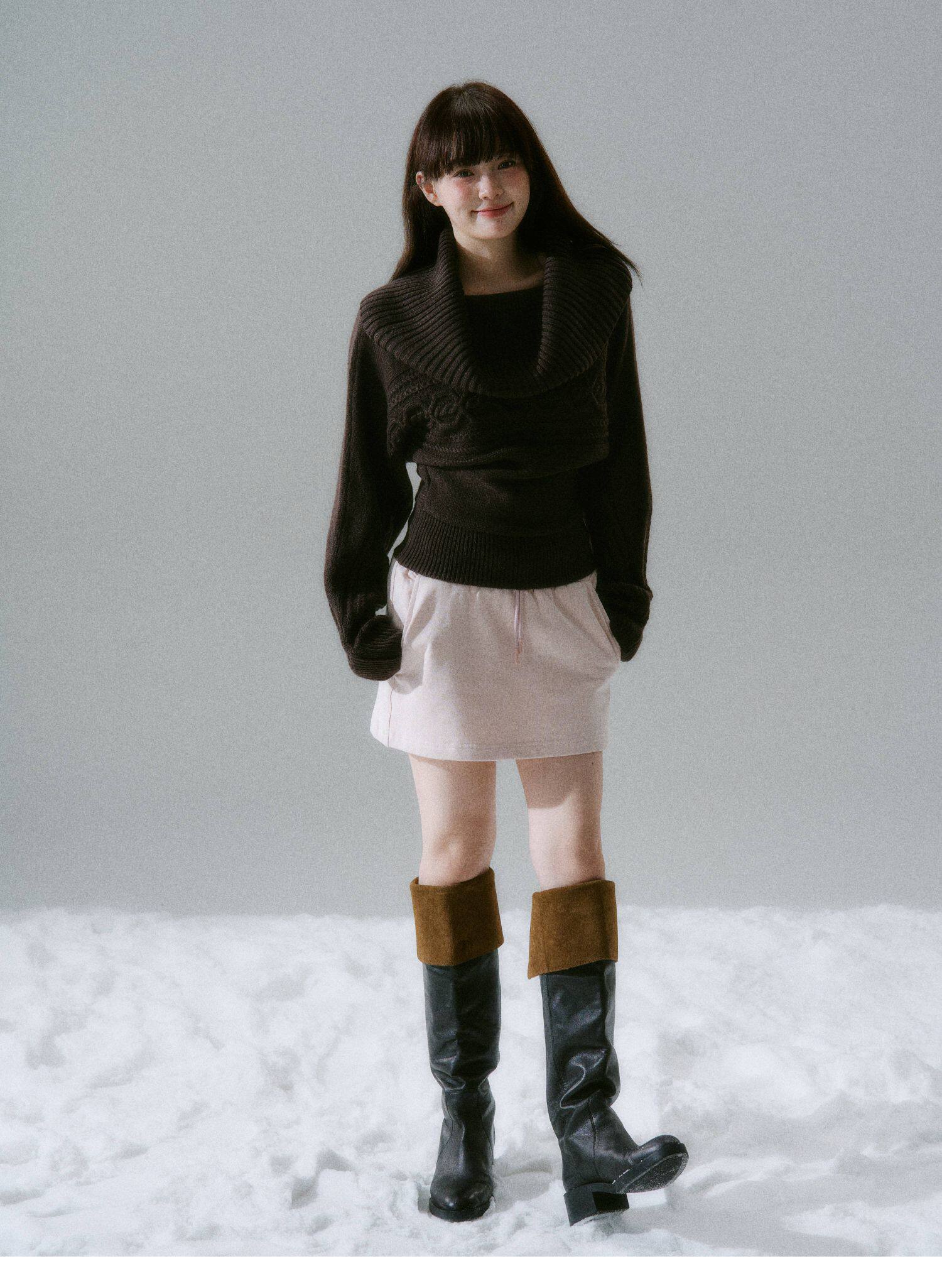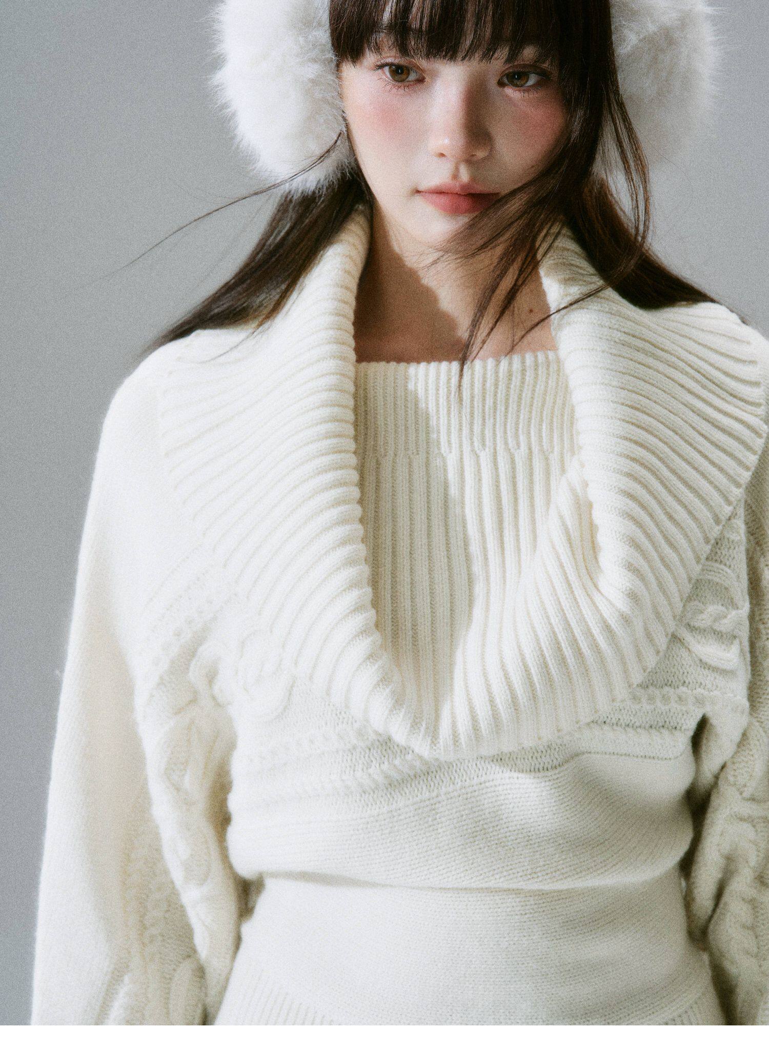 Ribbed Cowl Neck Cable Sleeve Knit Sweater NA8834
