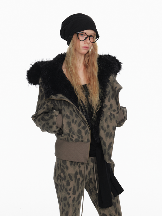 Leopard Print Fur Collar Zipper Hooded Jacket & Slim Pants Setup NA7199