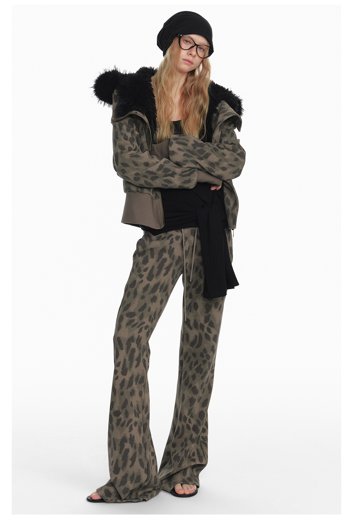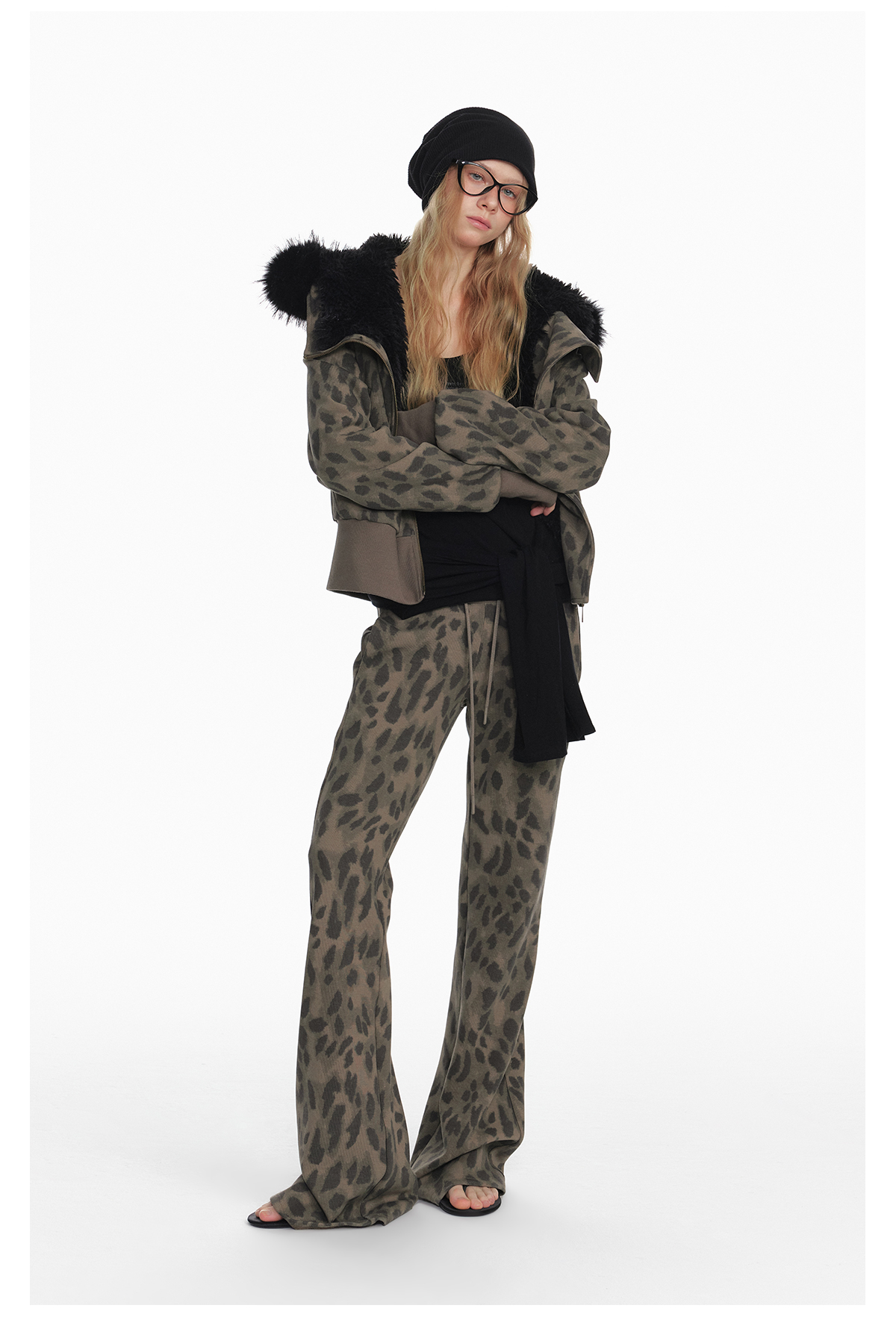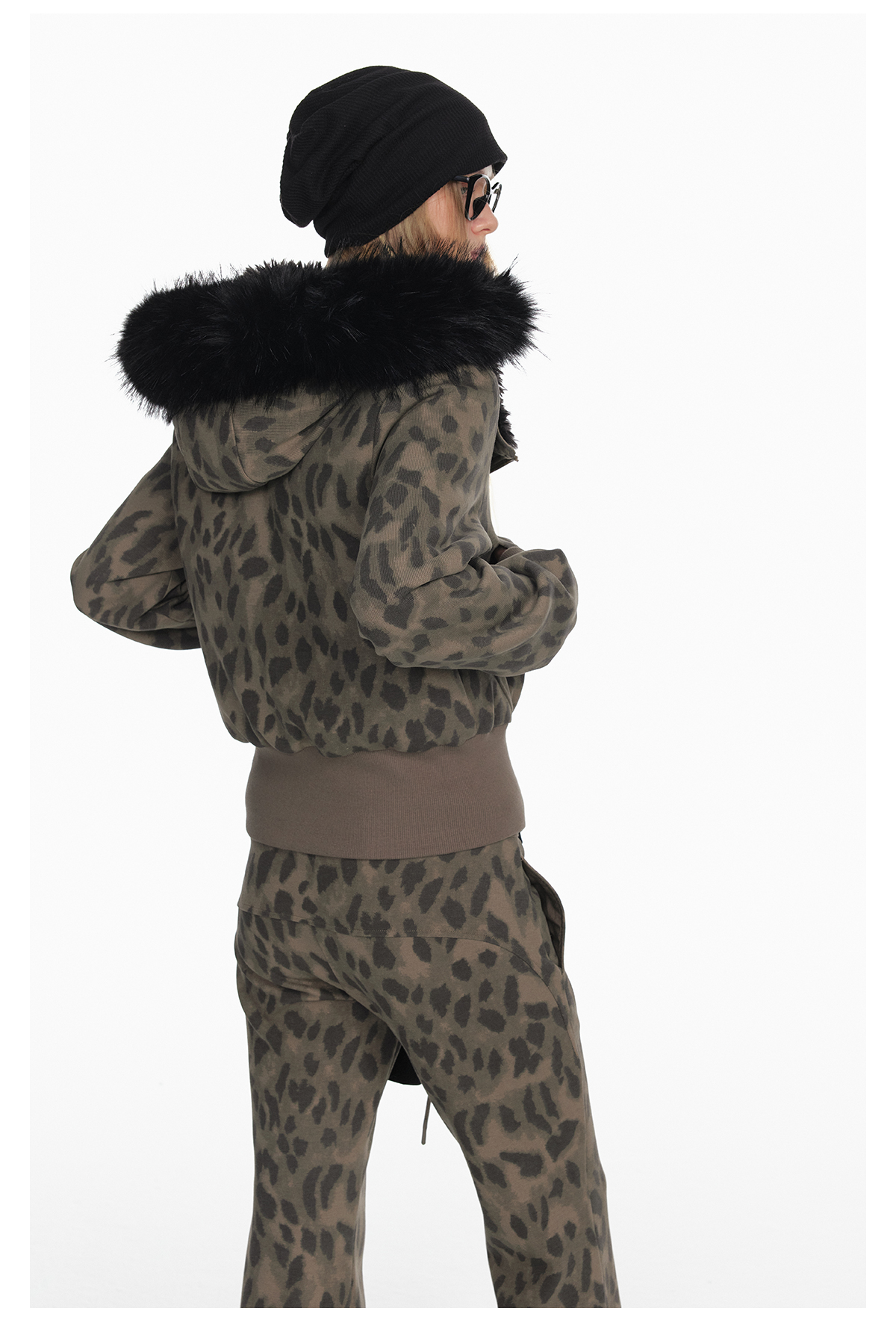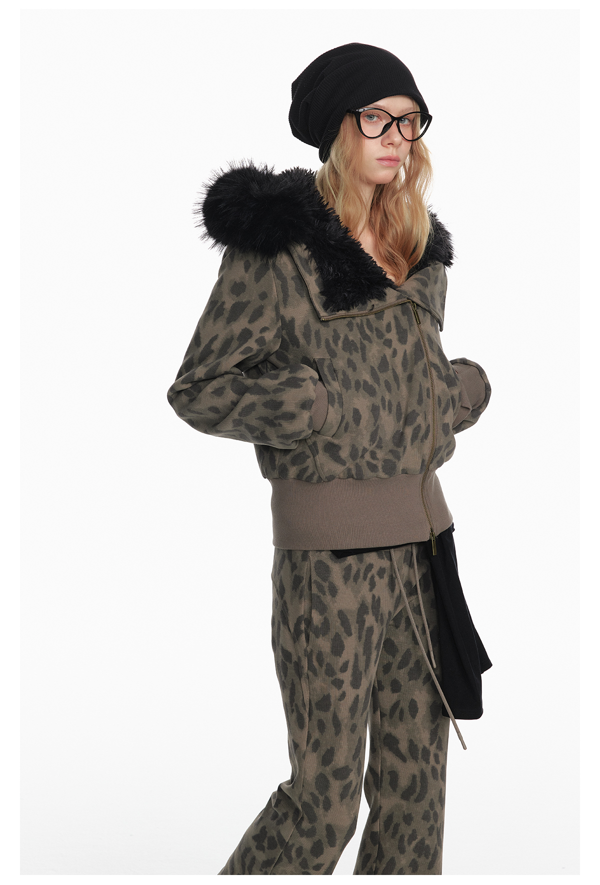 Leopard Print Fur Collar Zipper Hooded Jacket & Slim Pants Setup NA7199