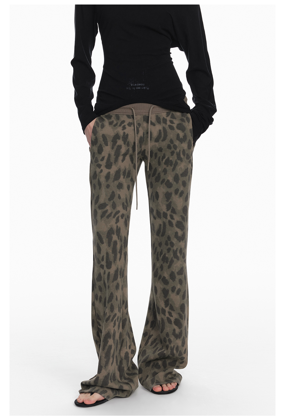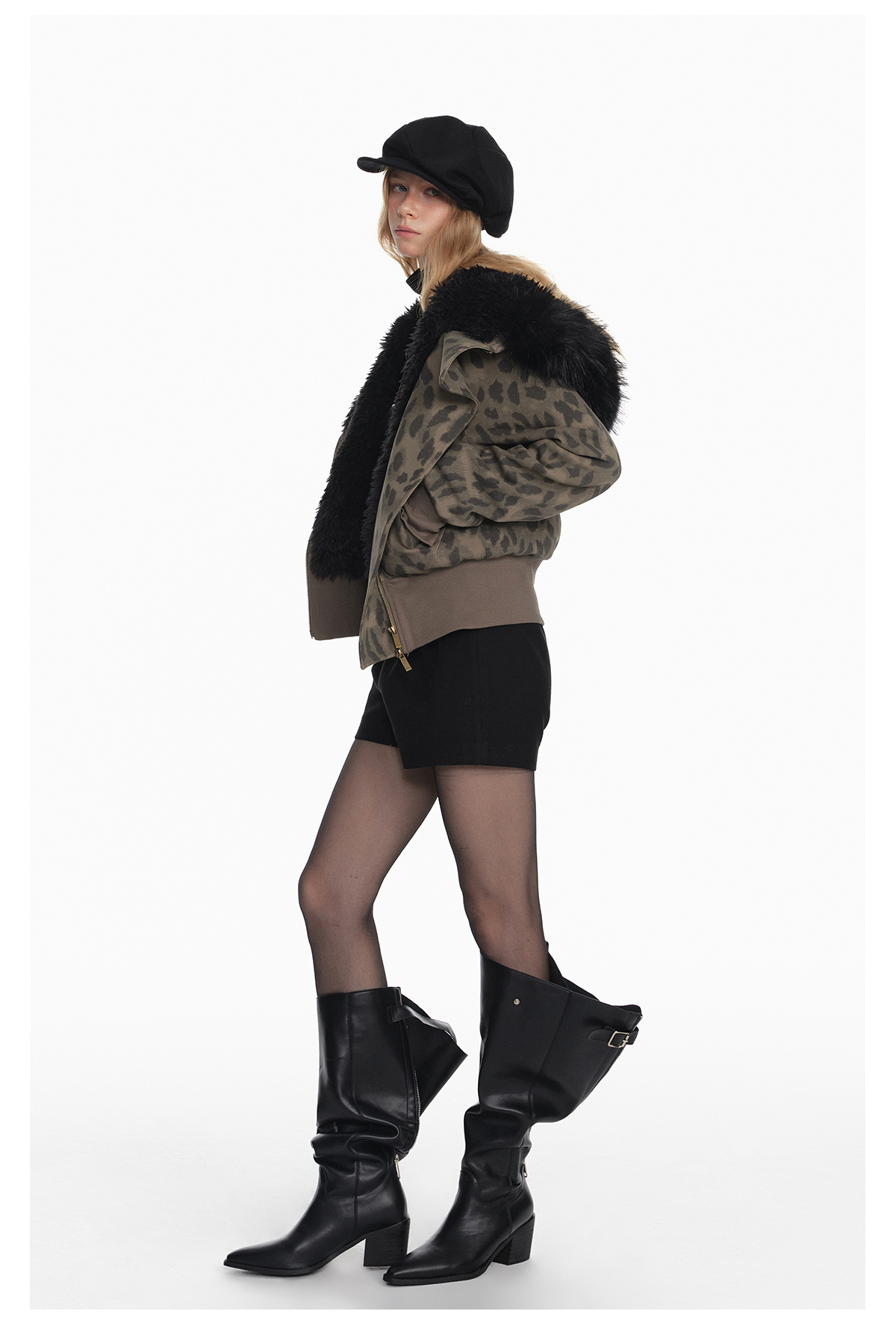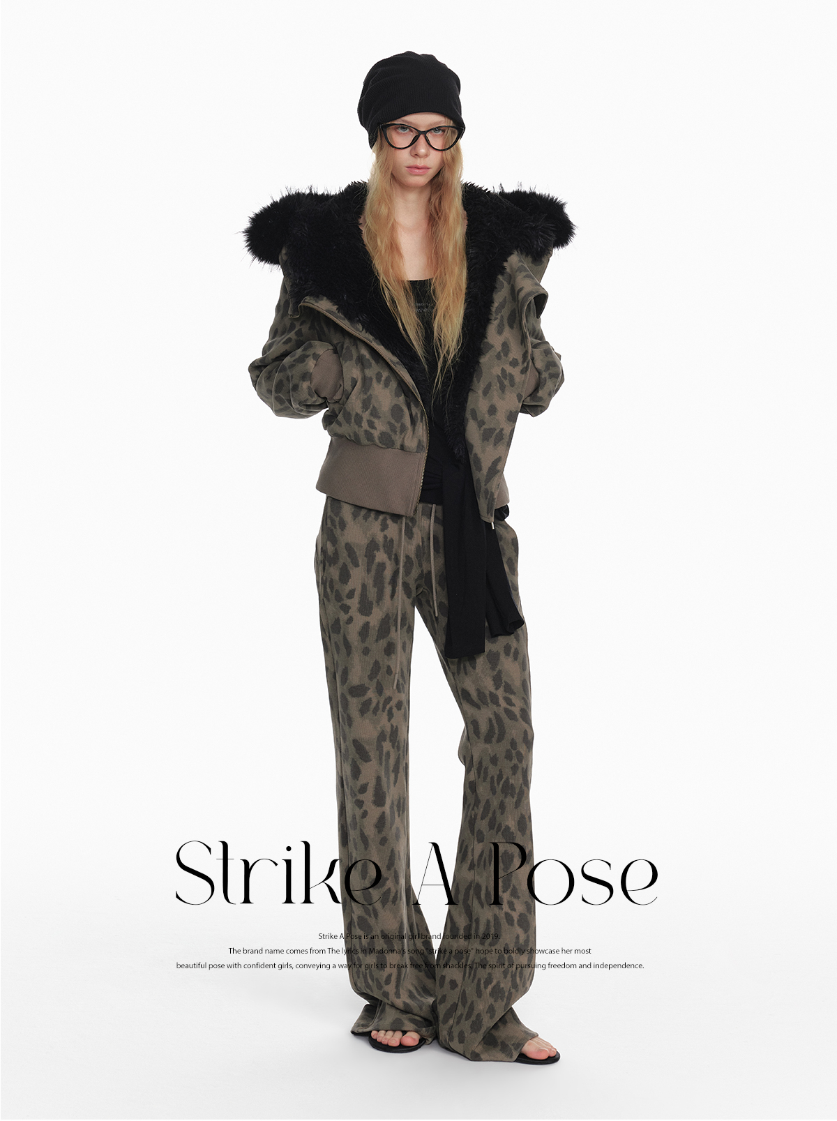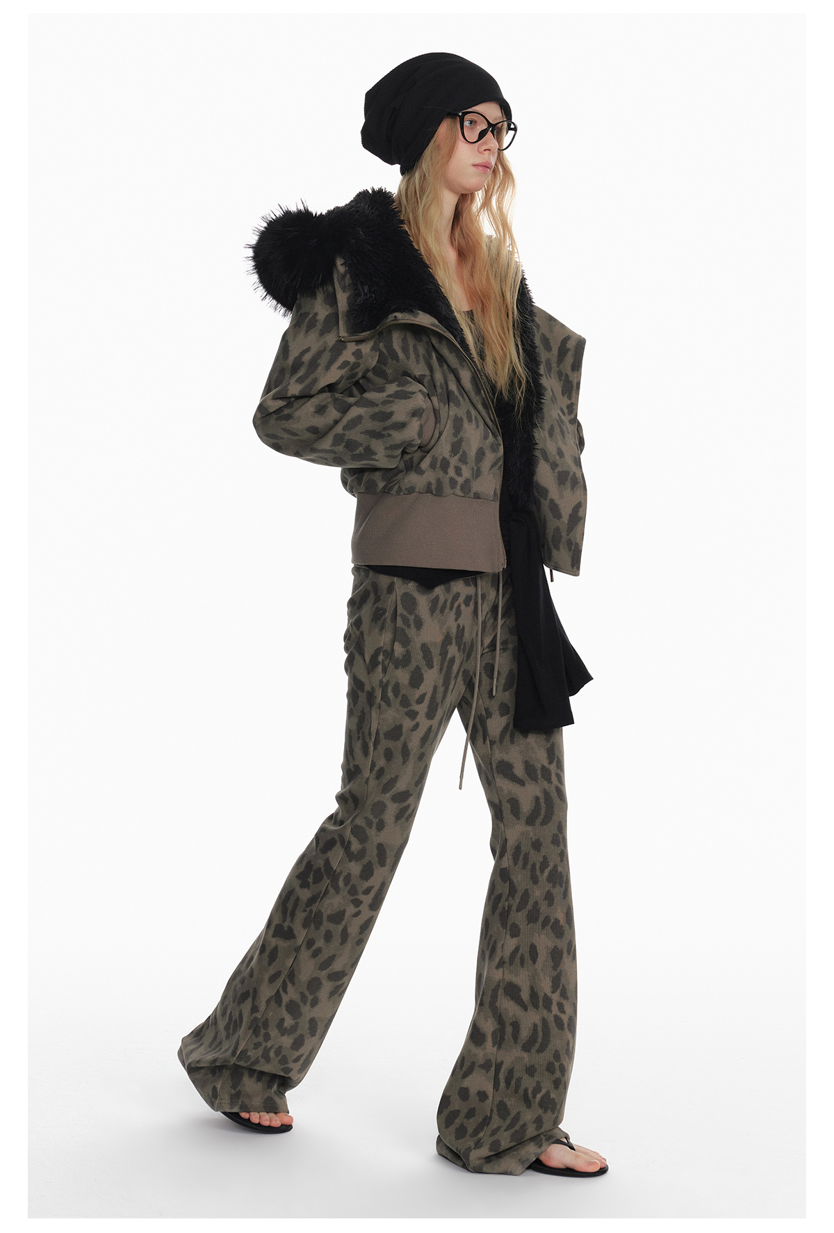 Leopard Print Fur Collar Zipper Hooded Jacket & Slim Pants Setup NA7199