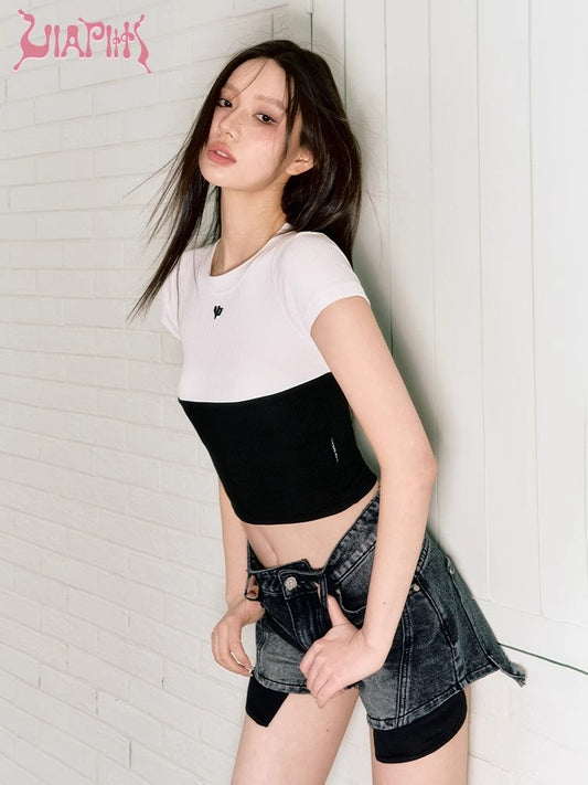 Patchwork Contrasting Slim Fitting Short Sleeve Knit Top NA4739