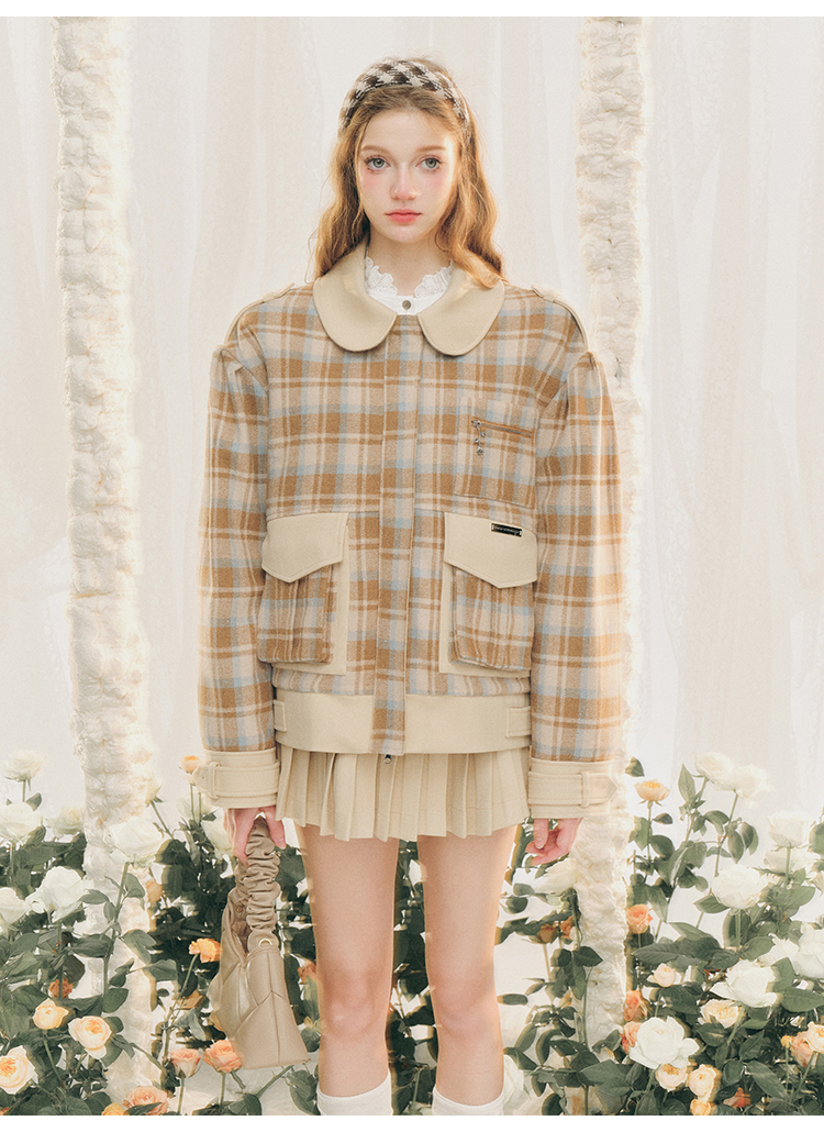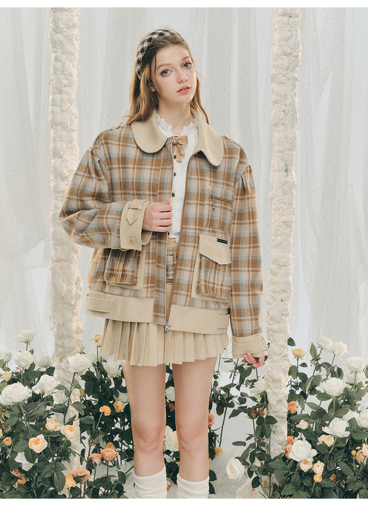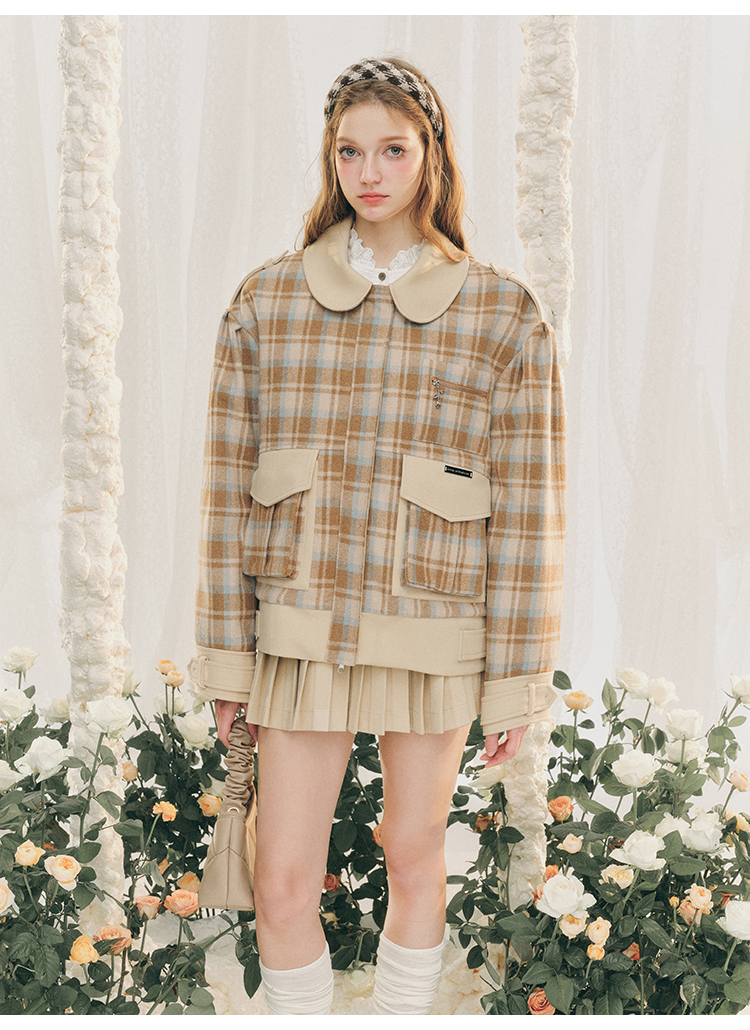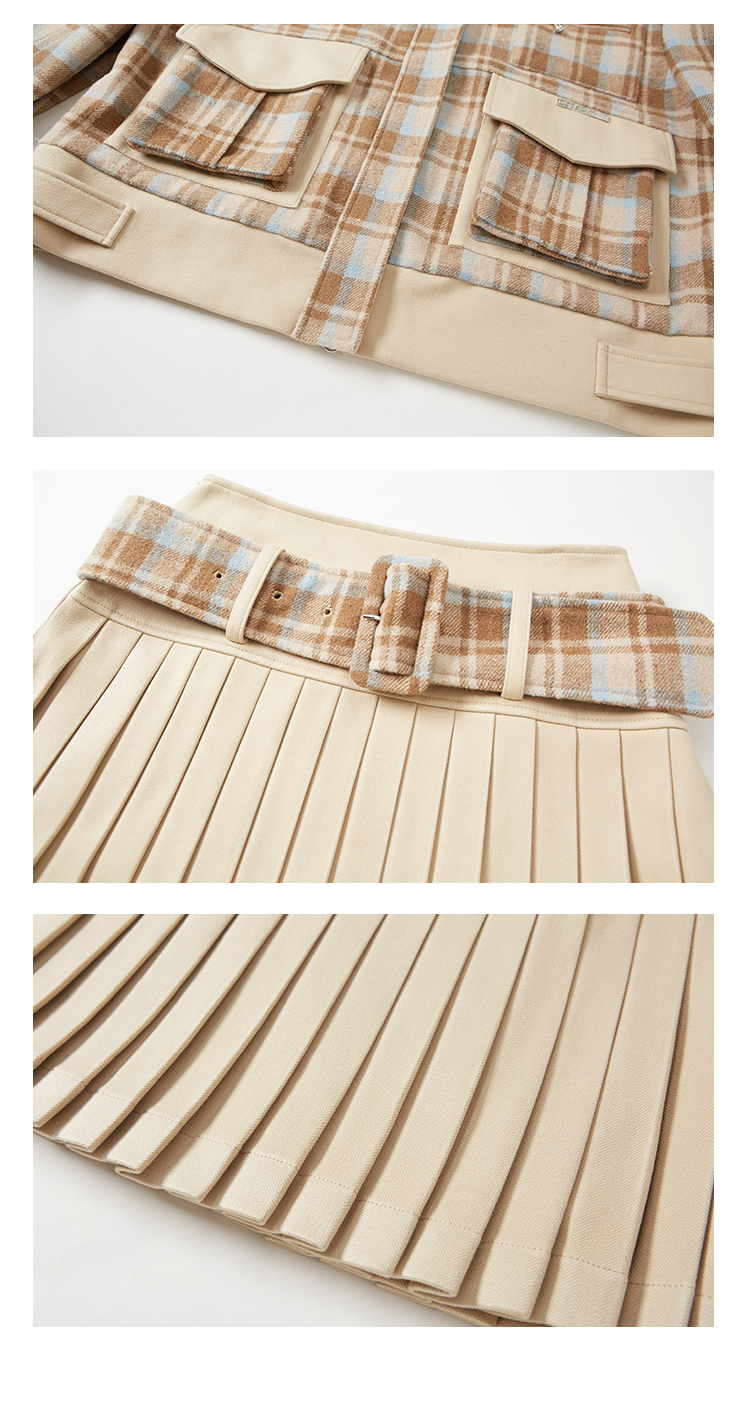 Round Collar Plaid Woolen Jacket & Pleated Short Skirt NA5908