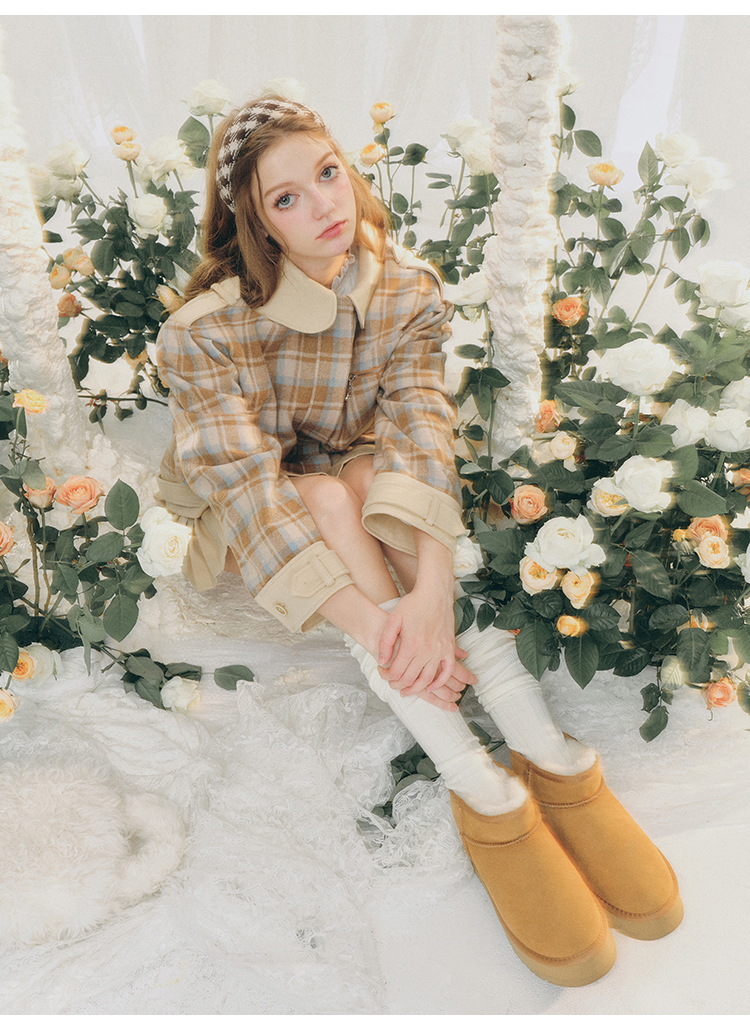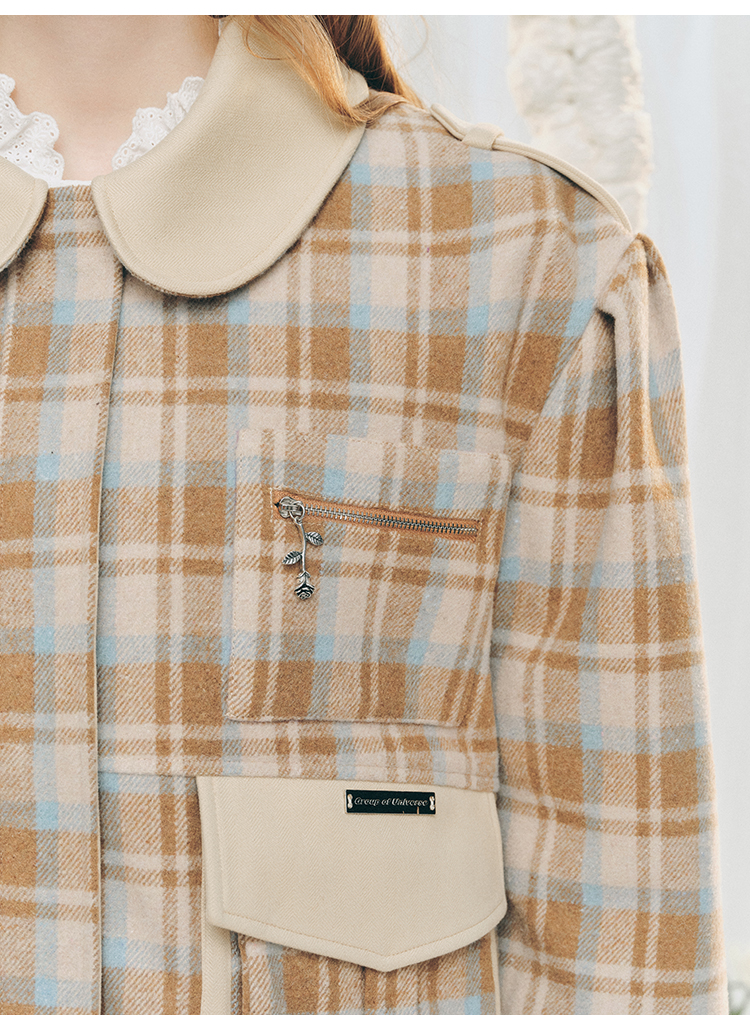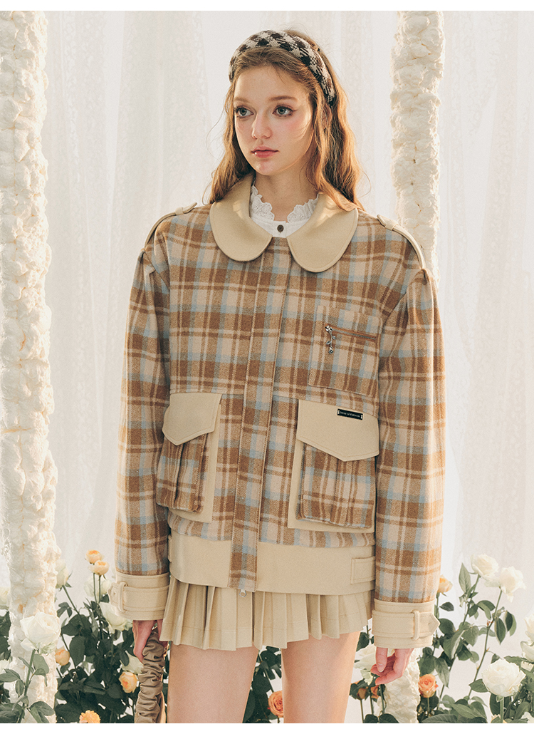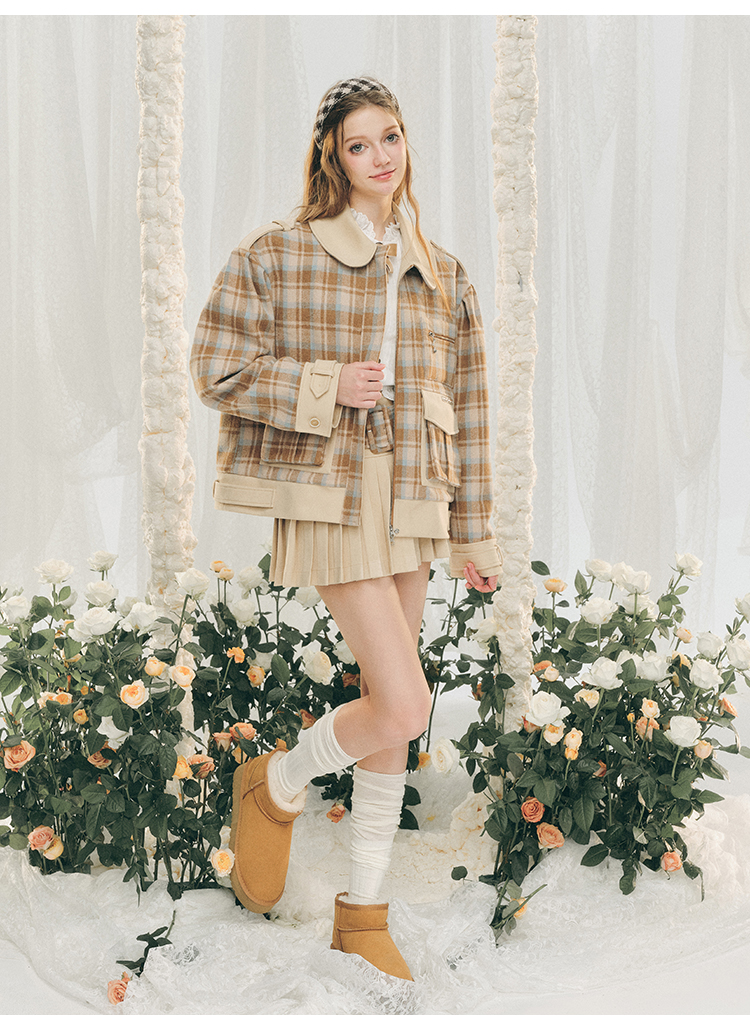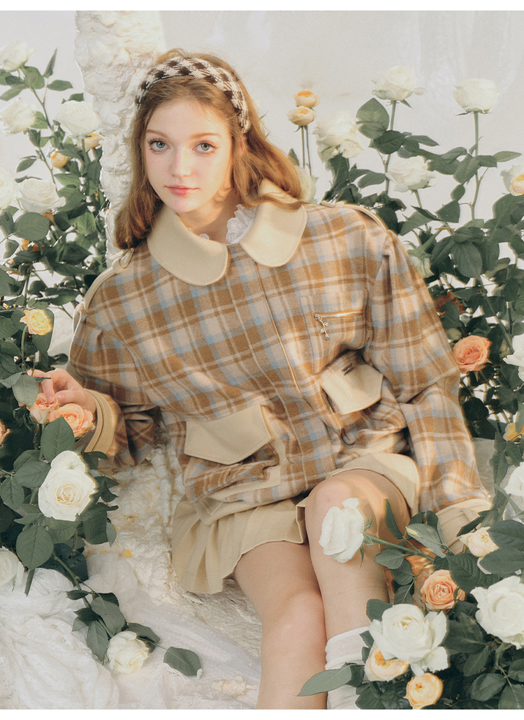 Round Collar Plaid Woolen Jacket & Pleated Short Skirt NA5908