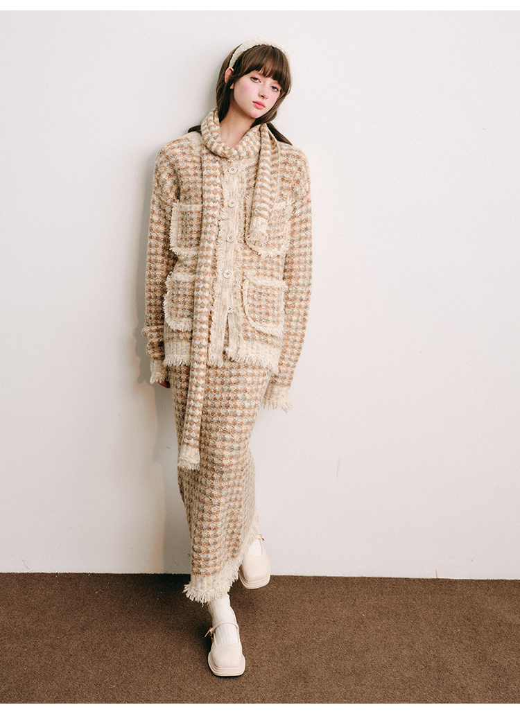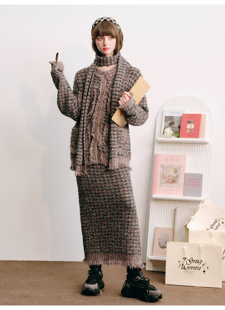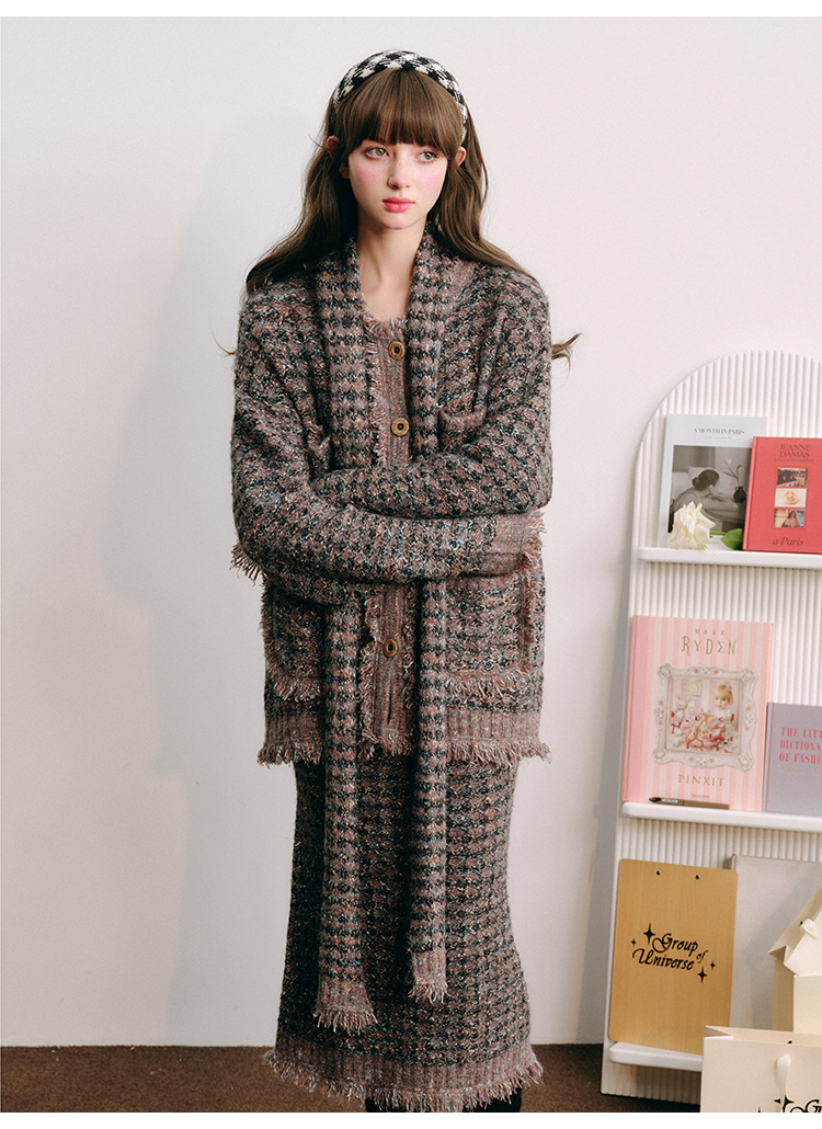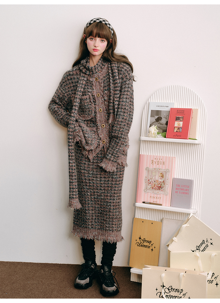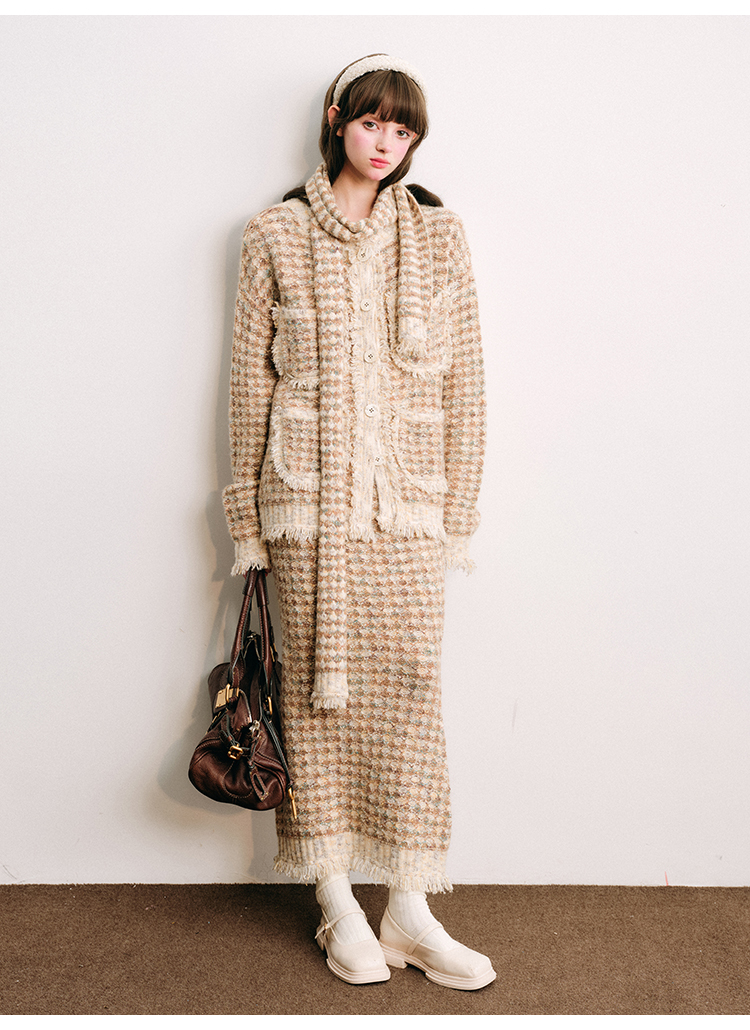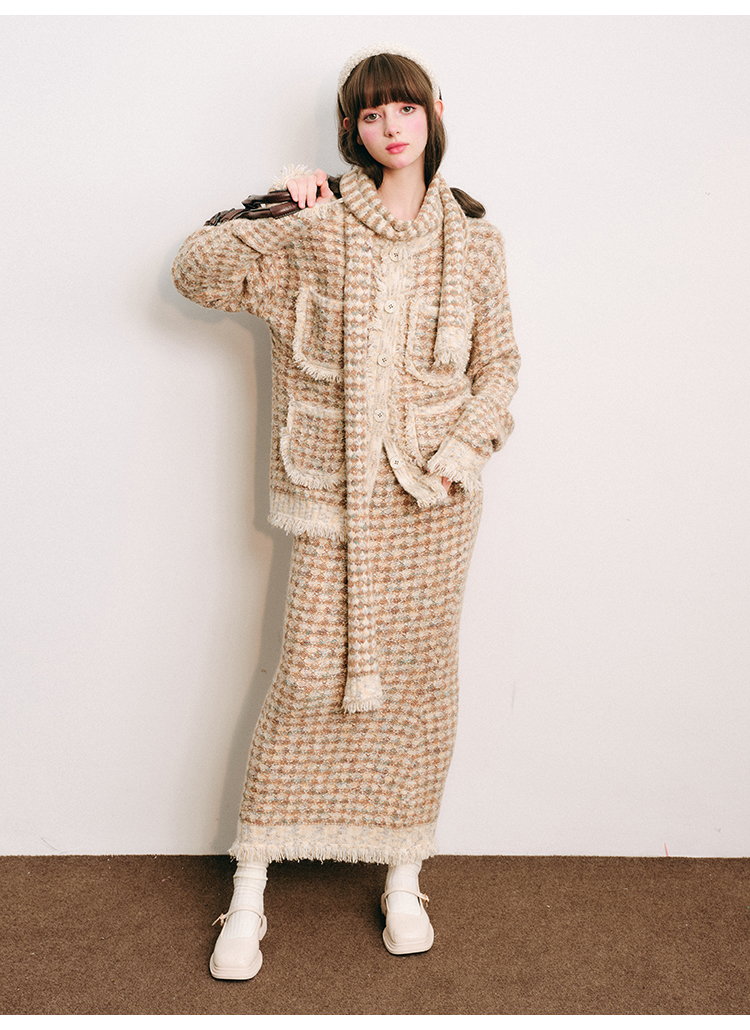 Plaid Button Cardigan & Scarf & Long Skirt Setup NA5877