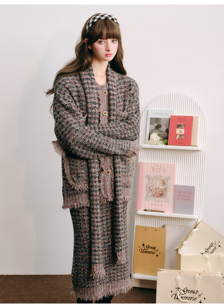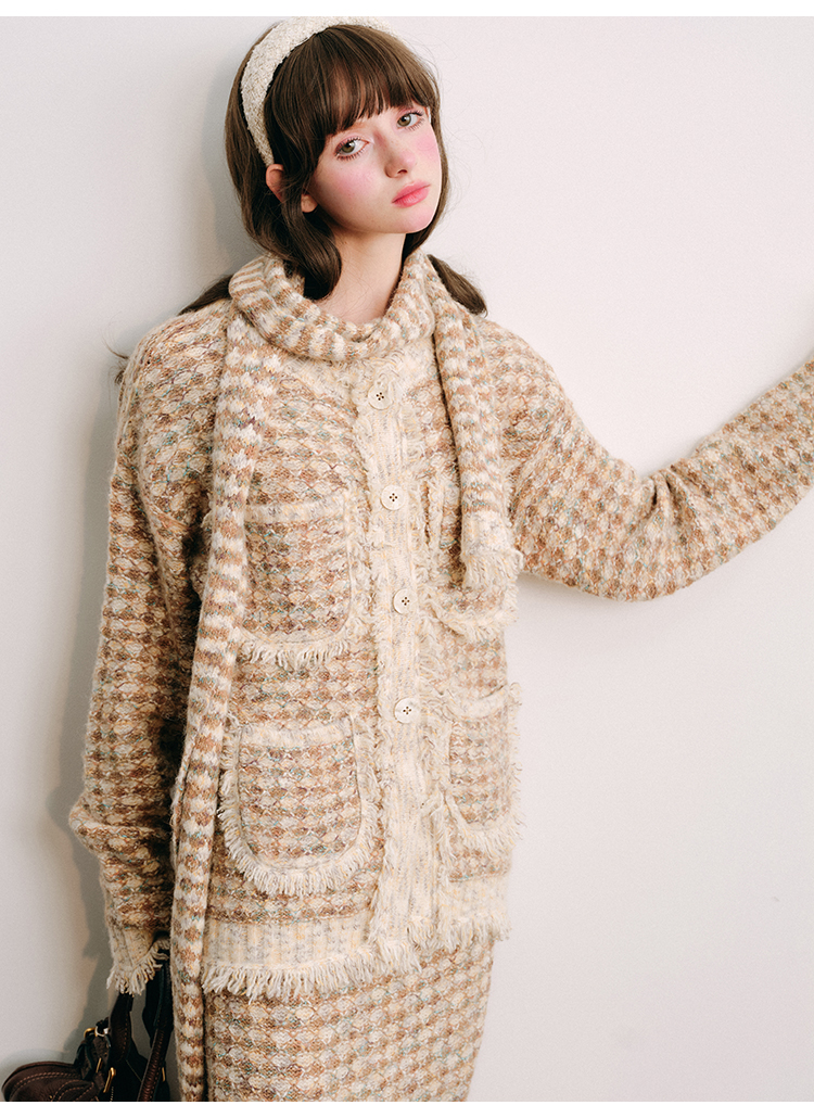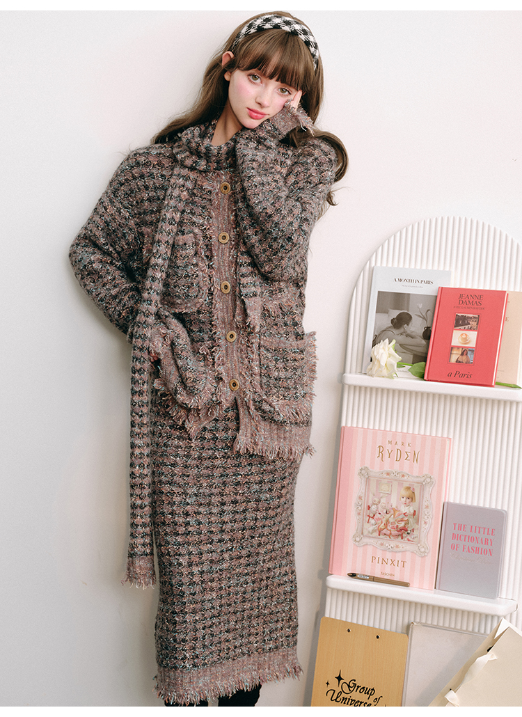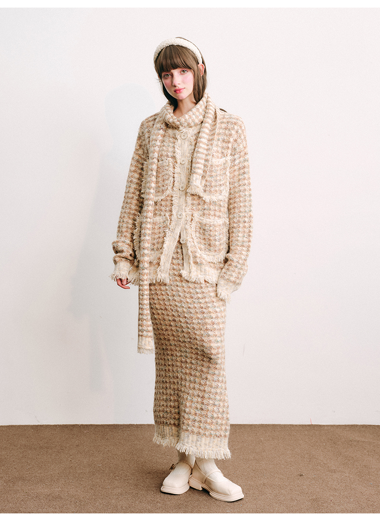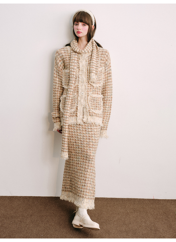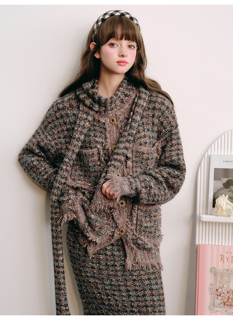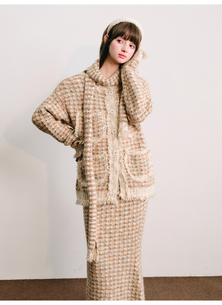 Plaid Button Cardigan & Scarf & Long Skirt Setup NA5877