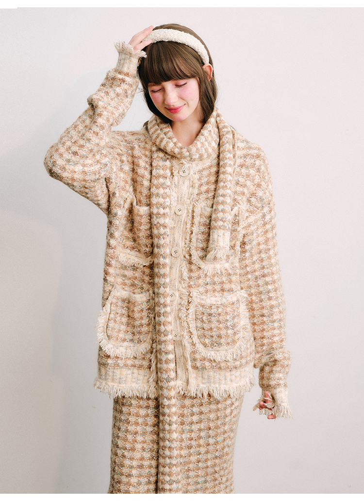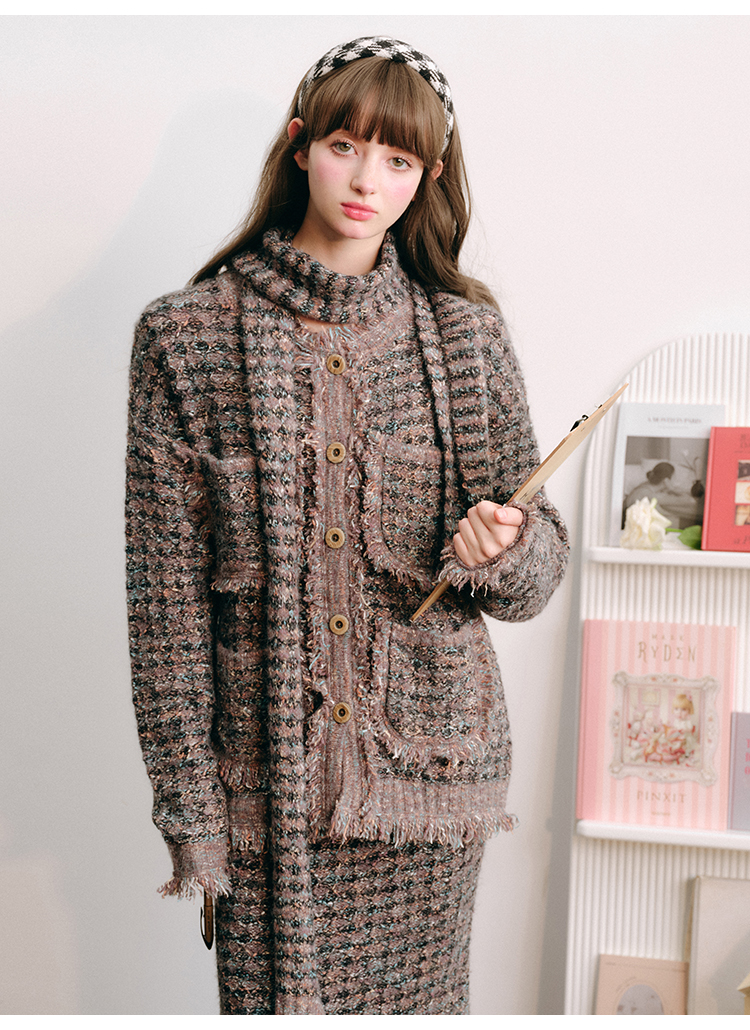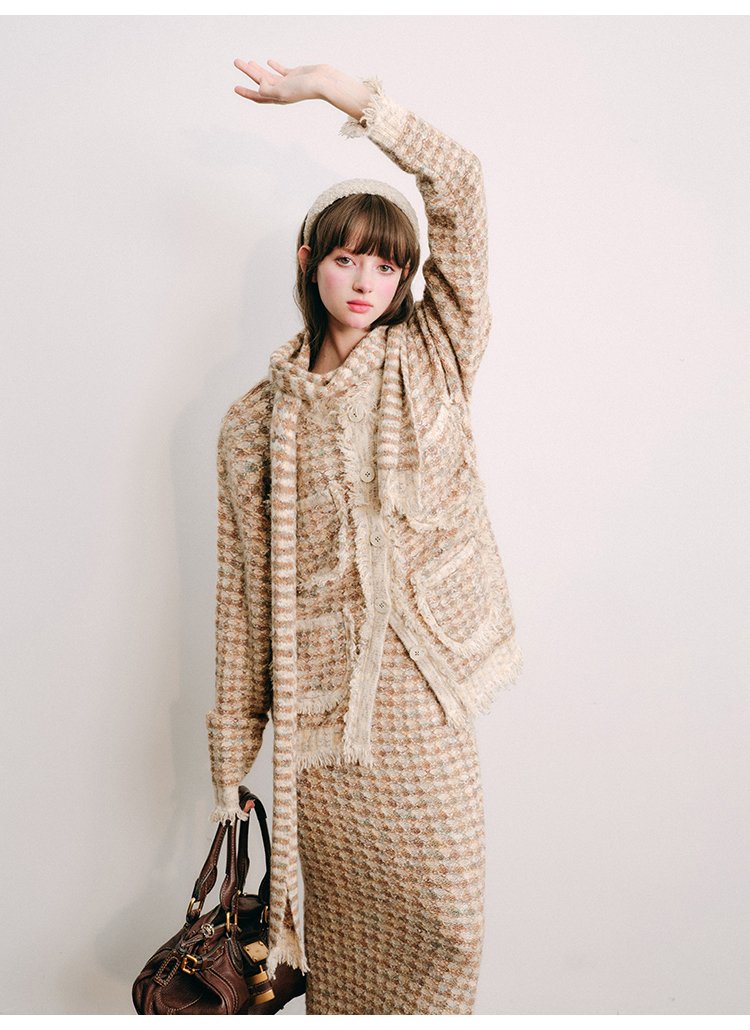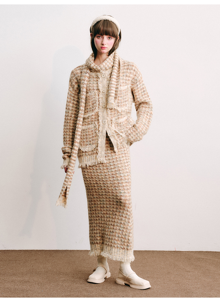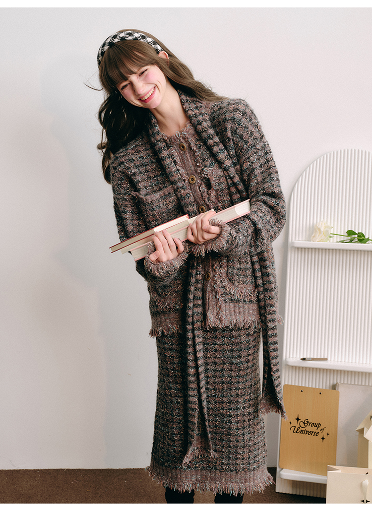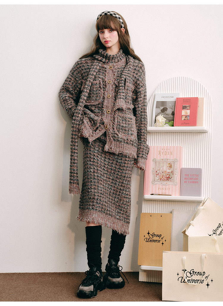 Plaid Button Cardigan & Scarf & Long Skirt Setup NA5877