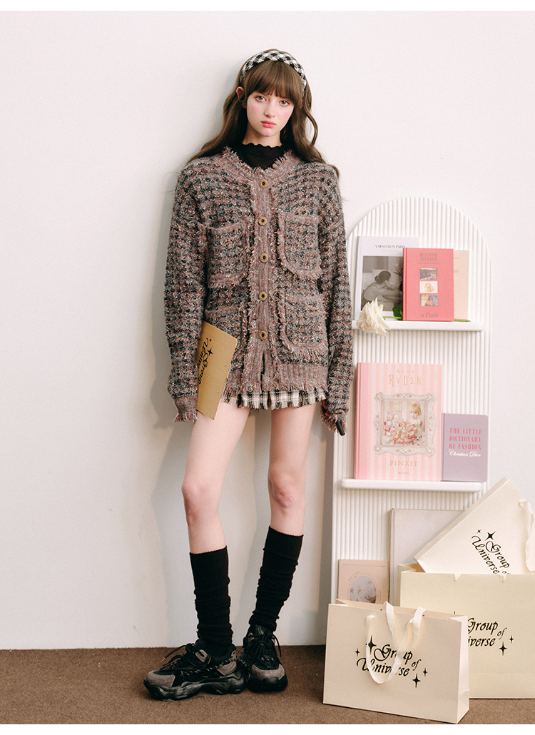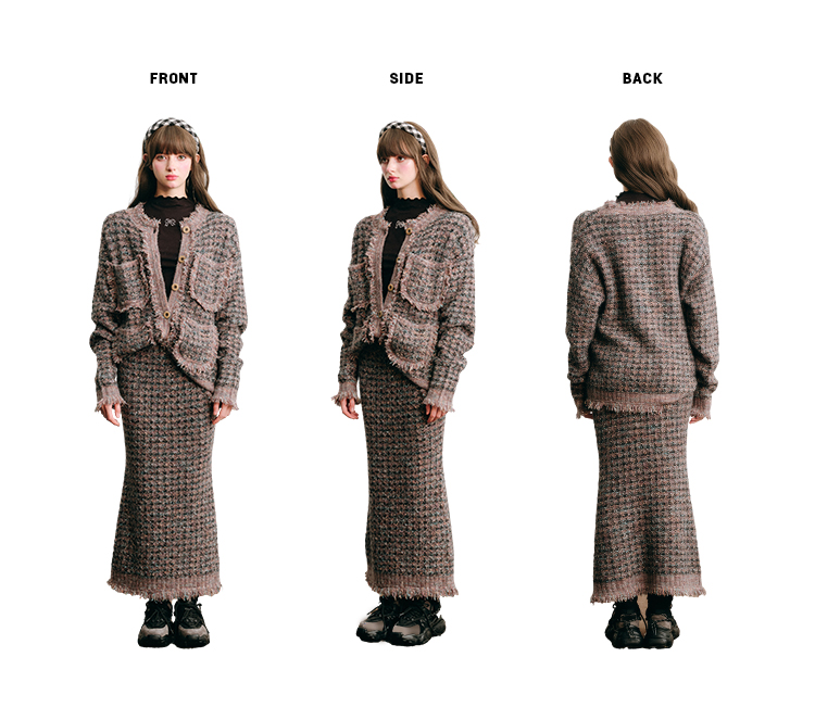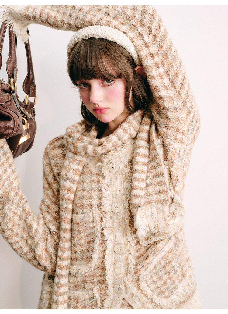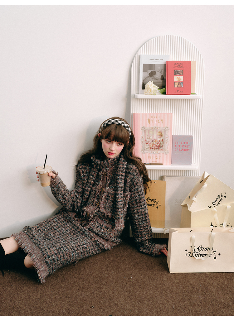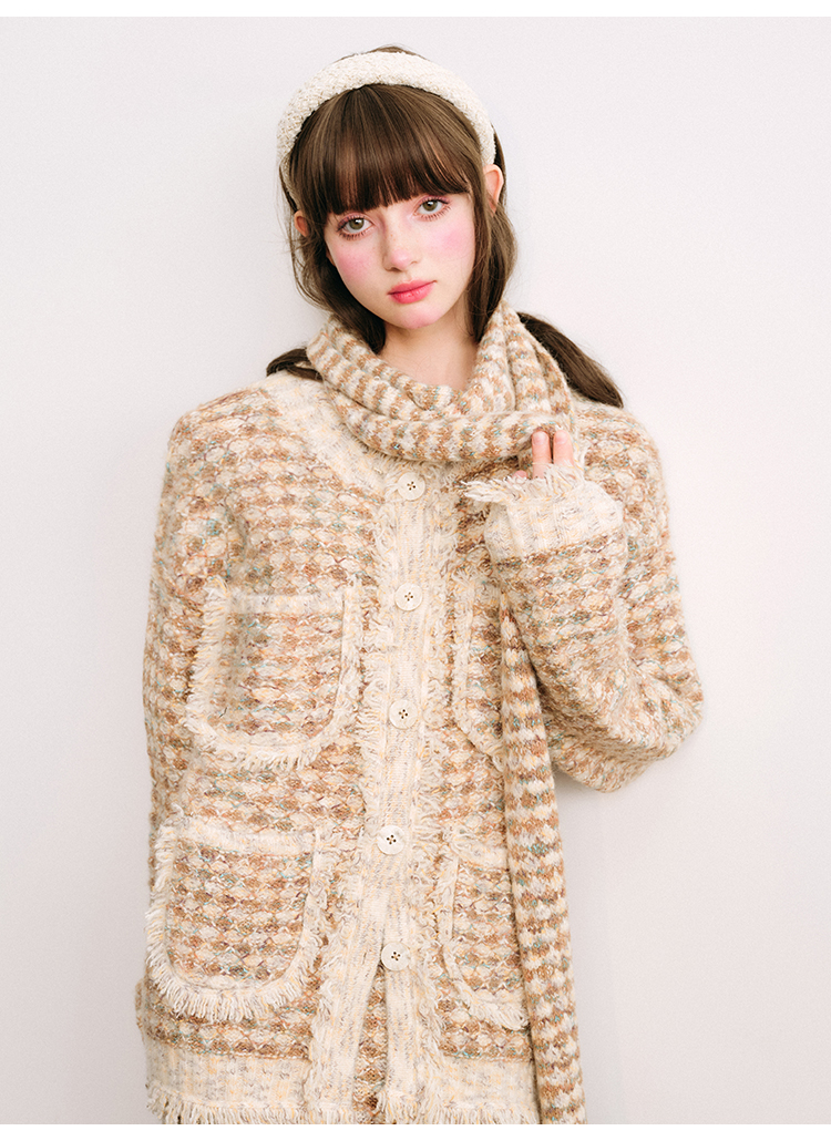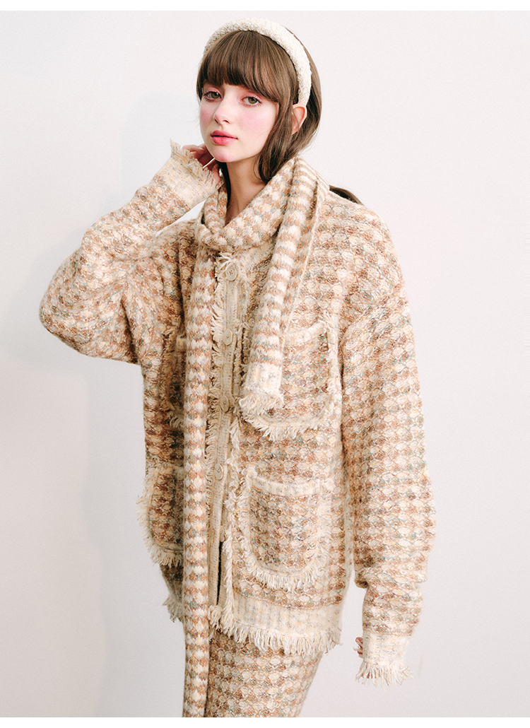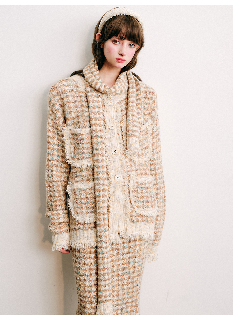 Plaid Button Cardigan & Scarf & Long Skirt Setup NA5877