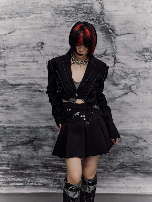 Floral Camisole Bustier & Flare Leg Warmers & Pleats Skirt & Cropped Jacket Setup NA8112