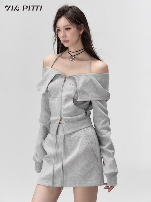 Hanging Neck Zipper Sweatshirt & Short Skirt Setup NA4736