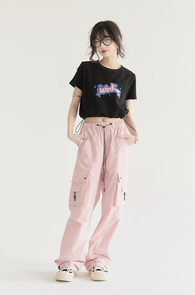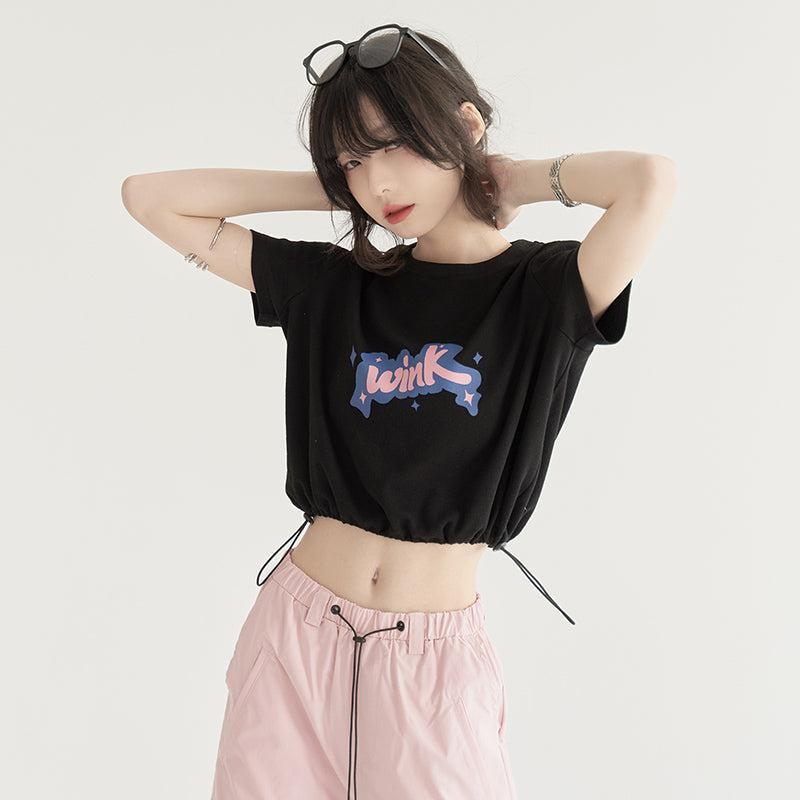 Drawstring Oversize Print Short Short-Sleeve T-Shirt WNW1397
