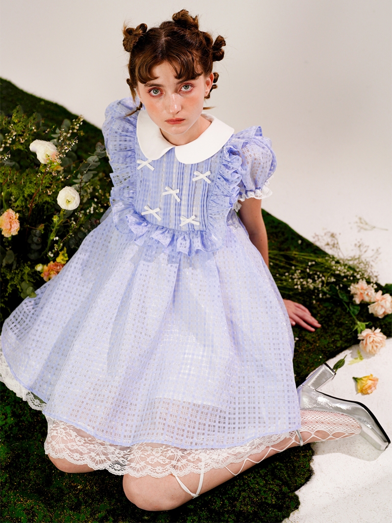 Plaid Lace-Trim Puff-Sleeve A-Line Dress NA7354