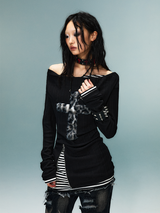 Leopard Fuzzy Cross Fake Layered Draped Stripe Long Sleeve Knit Sweater NA8166