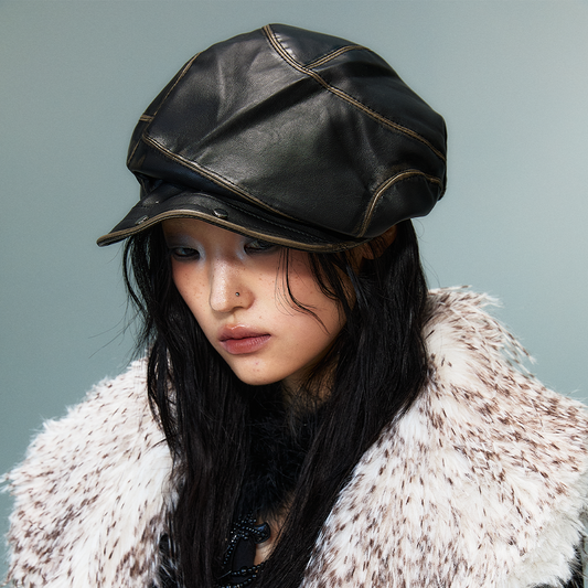 Studded Asymmetrical Washed PU Leather Beret NA8156