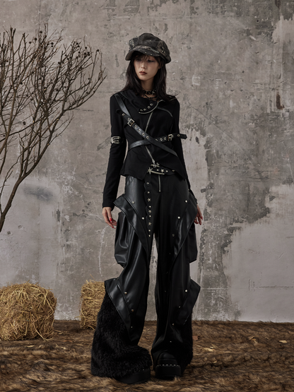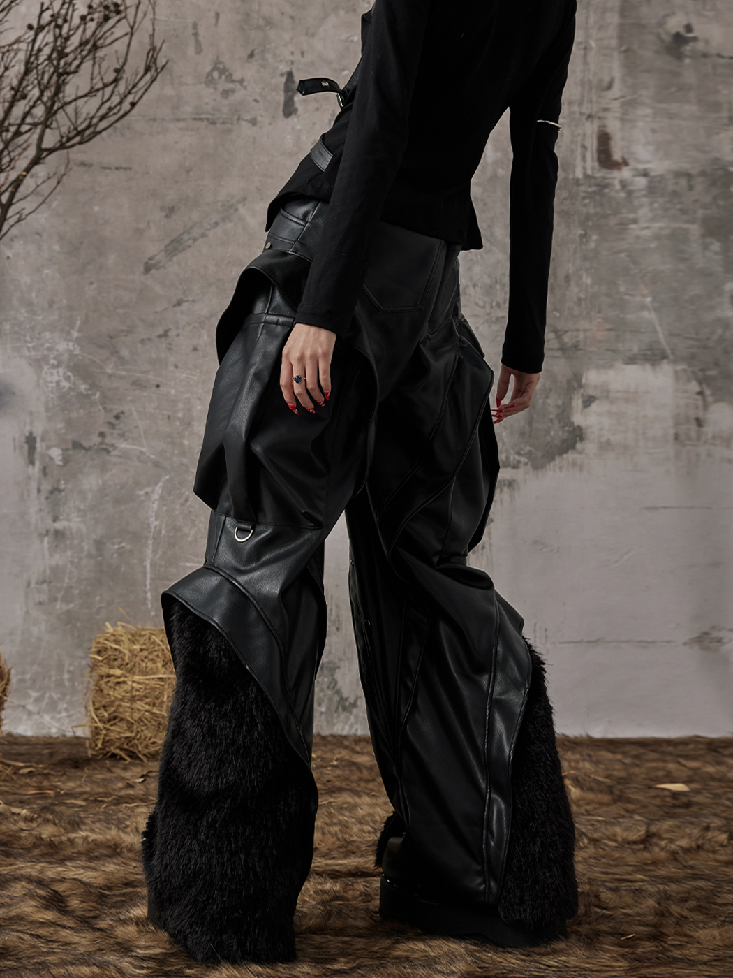 Studded Multi-Pocket Patchwork Fuzzy Wide-Leg PU Leather Pants NA8164