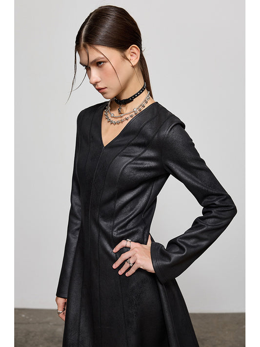 PU Leather Waist-cinching Midi Dress NA4241