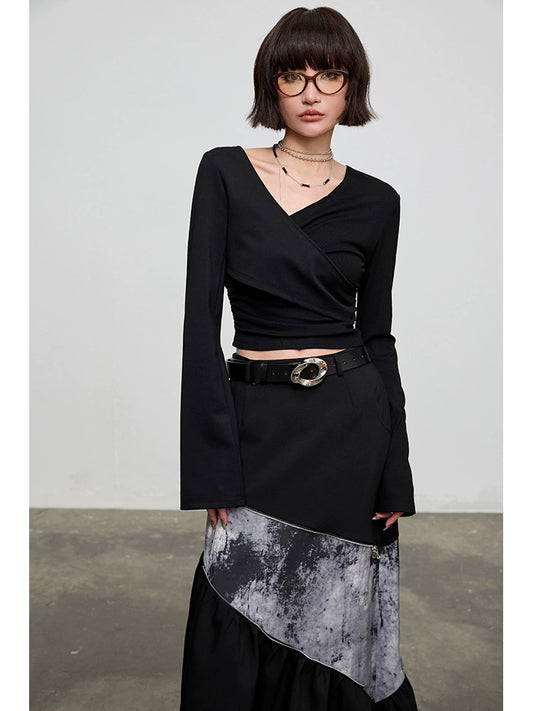 Patchwork Irregular V-Neck Long Sleeve T-shirt NA4324