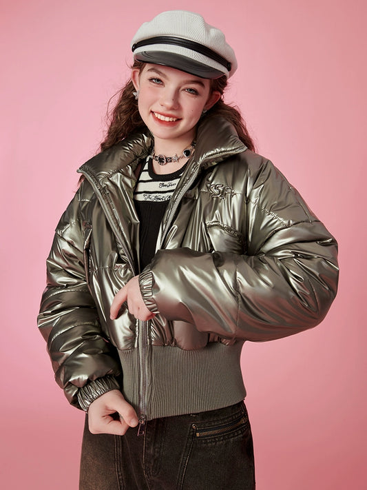 Glossy Short Stand Neck Thick White Duck Down Jacket NA6801